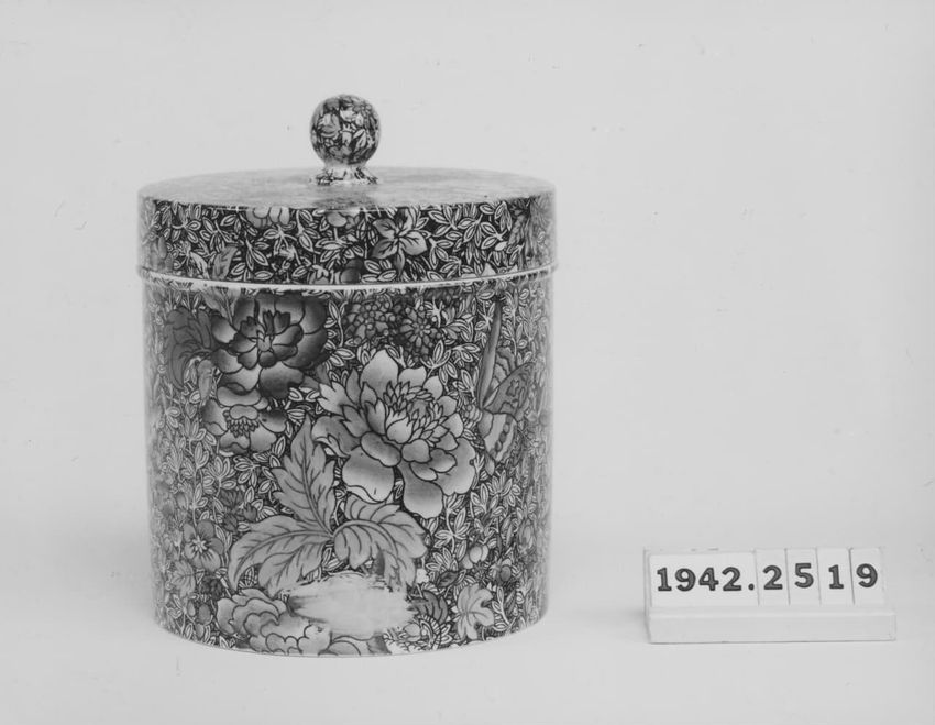 Multi-color transfer-printed ceramic canister with straight sides with lid and a peony motif.