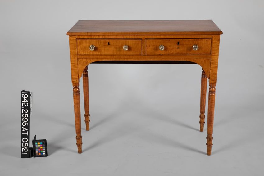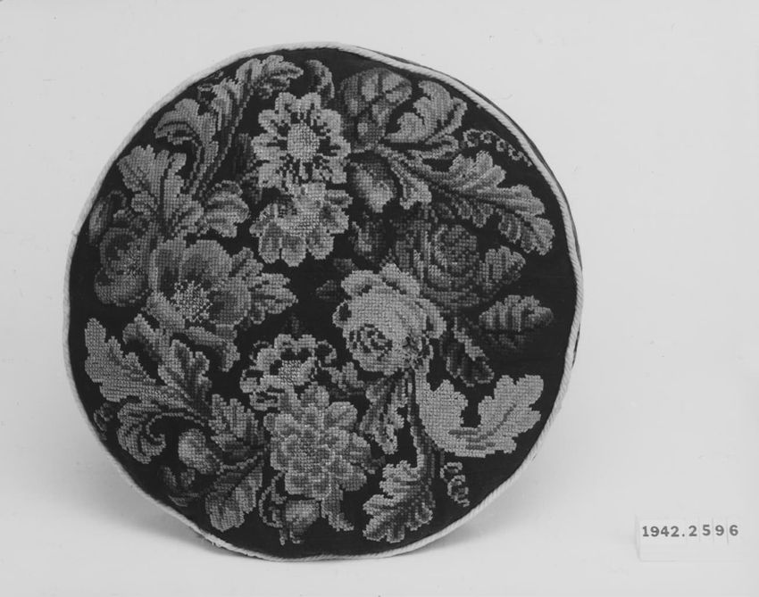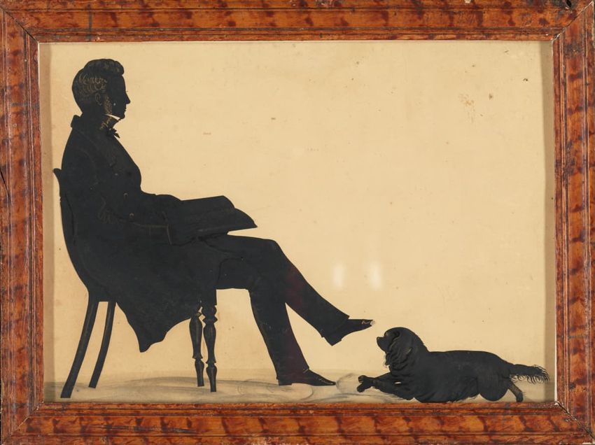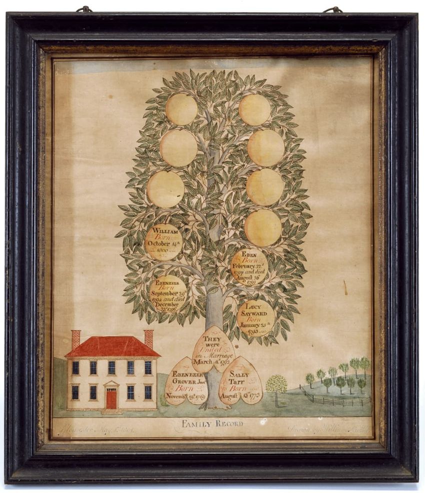 Large tree with genealogy on fruit with five upside-down hearts, a small house, and trees. One of a pair.