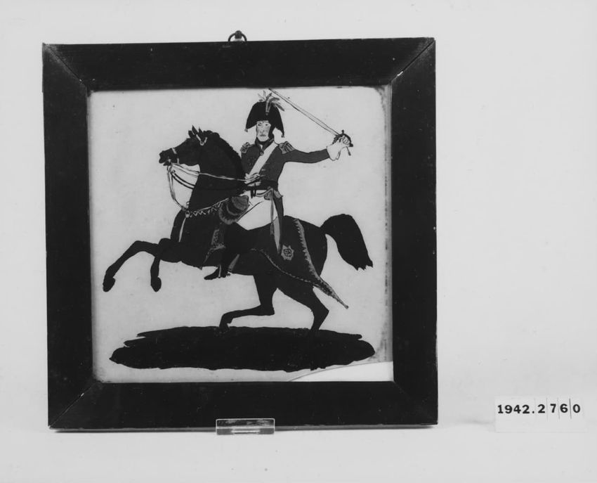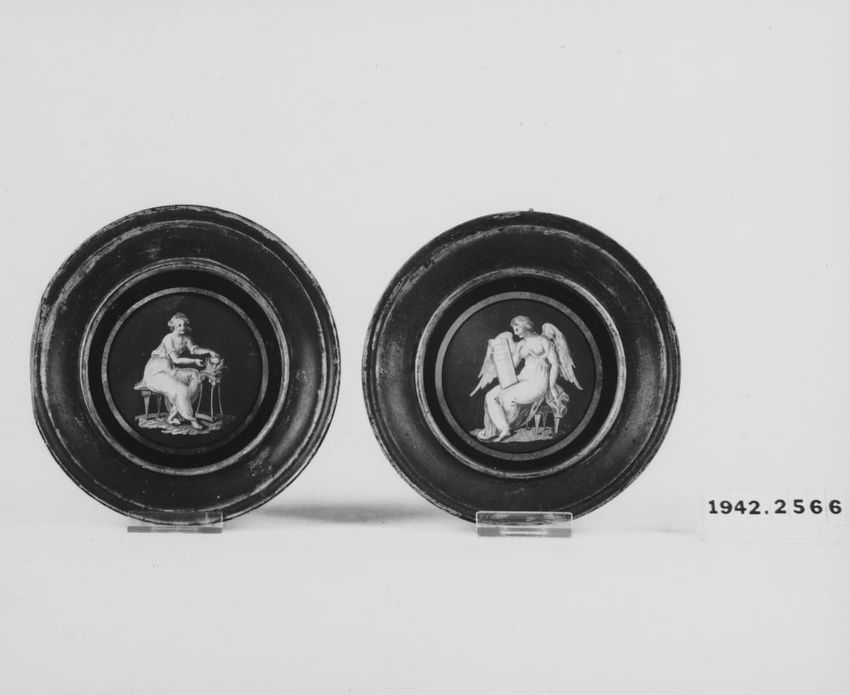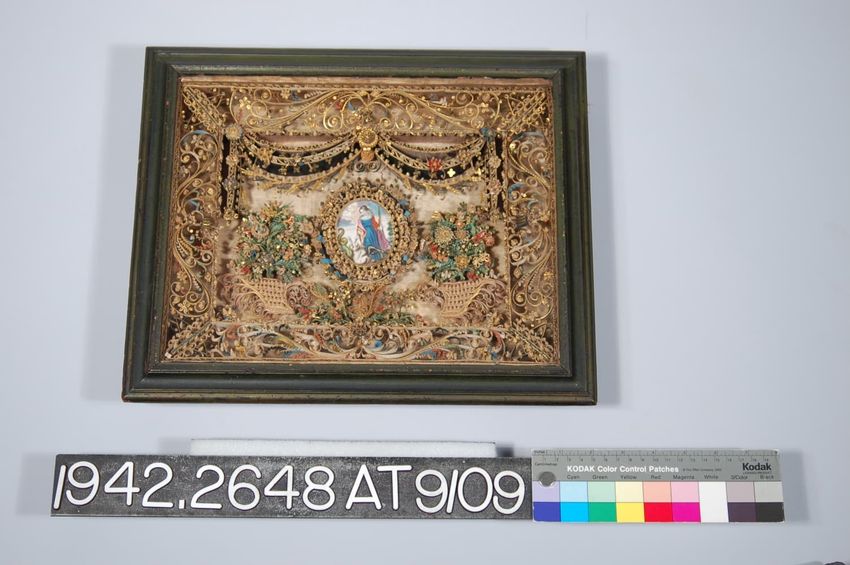 Small oval female portrait in quillwork decorated shadow box. The diorama with cental handcolored female figure and a serpent, with quilled bird and squirrel below, two black paper swags in the background, inside a black painted wooden box with a frame faced wtih glass.