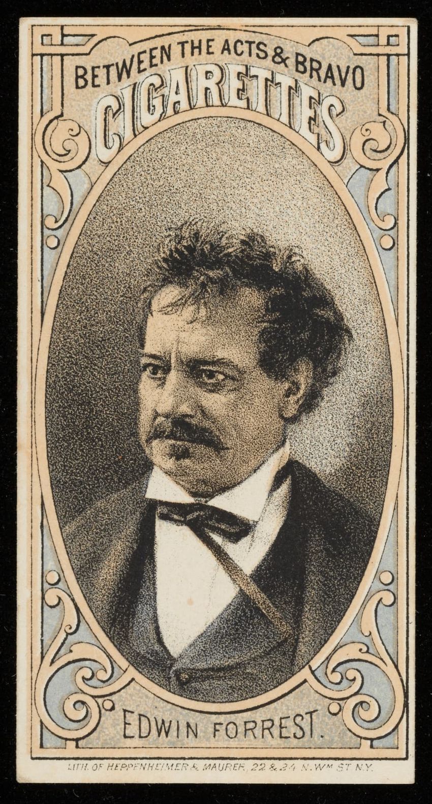 A portrait of stage actor Edwin Forrest is shown on the card verso. The text above the image reads "Between the Acts & Bravo Cigarettes."