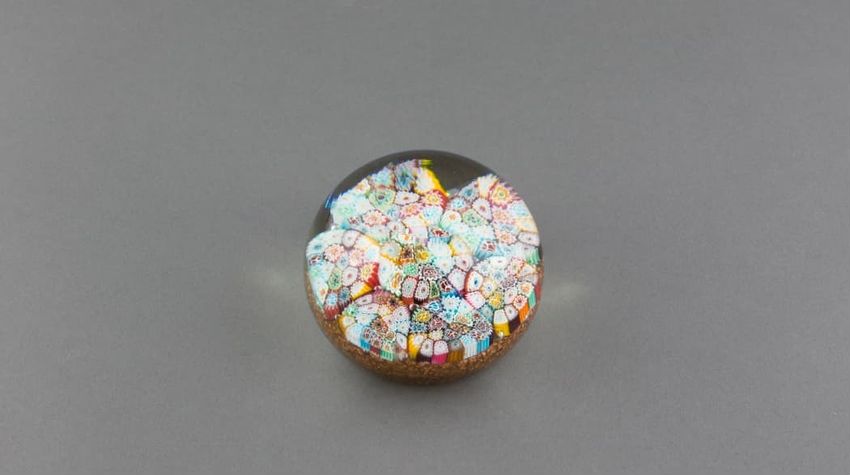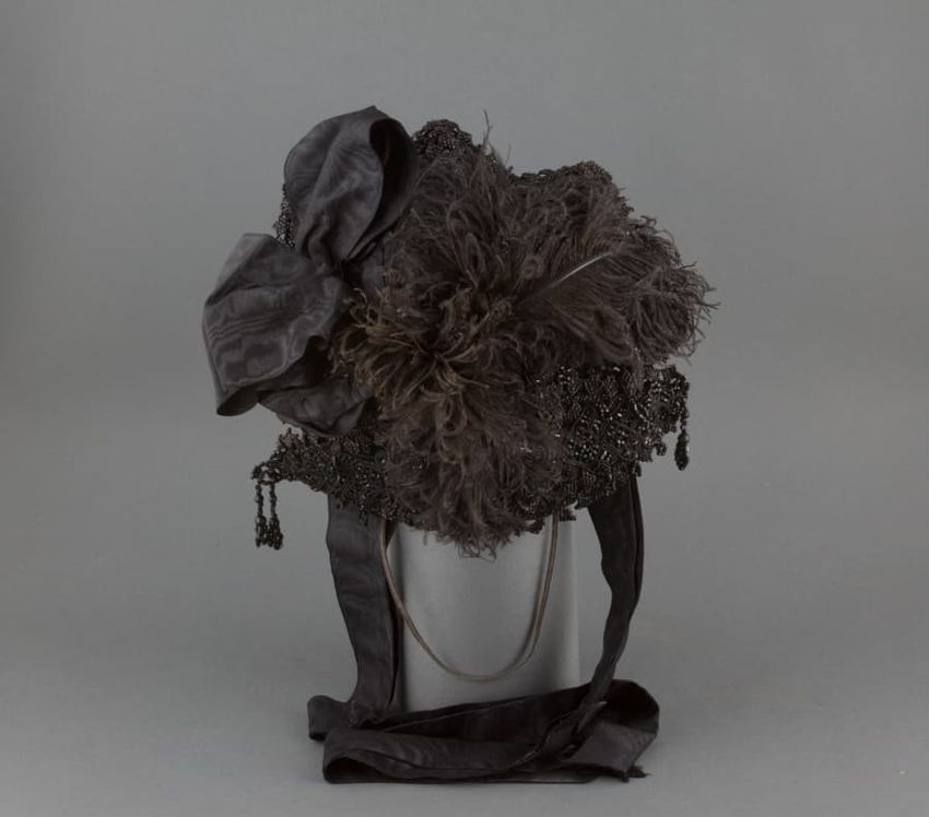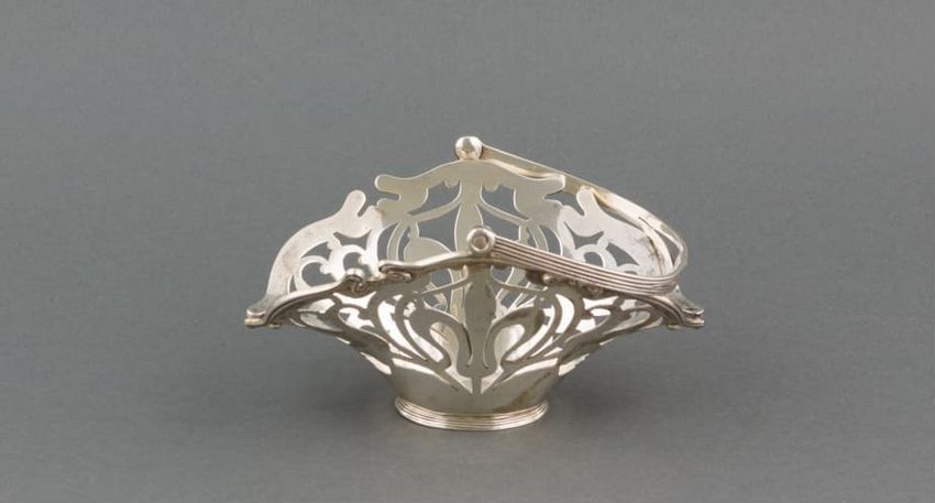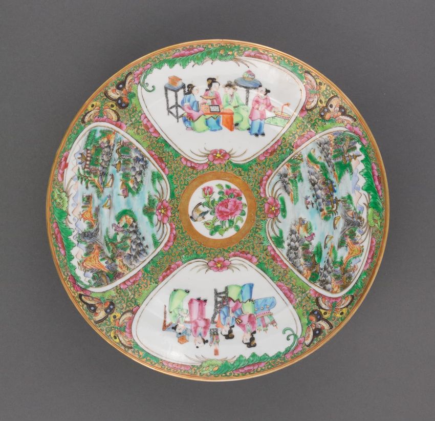 Porcelain enameled soup plate. On gold ground, green tendrils and pink tree peonies; central medallion, bordered in gold, depicts a bird and pink peonies; four scrolled medallions with butterflies around them depict 1) four figures seated and standing around table and 2) scenic view of river, boats,...