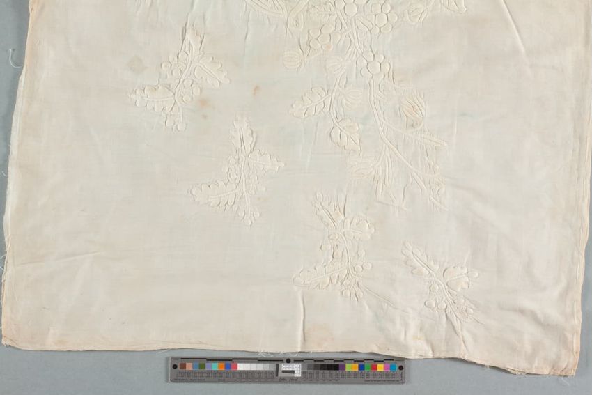 silk (fiber), linen (material), needlework (visual works), embroidery (visual works)