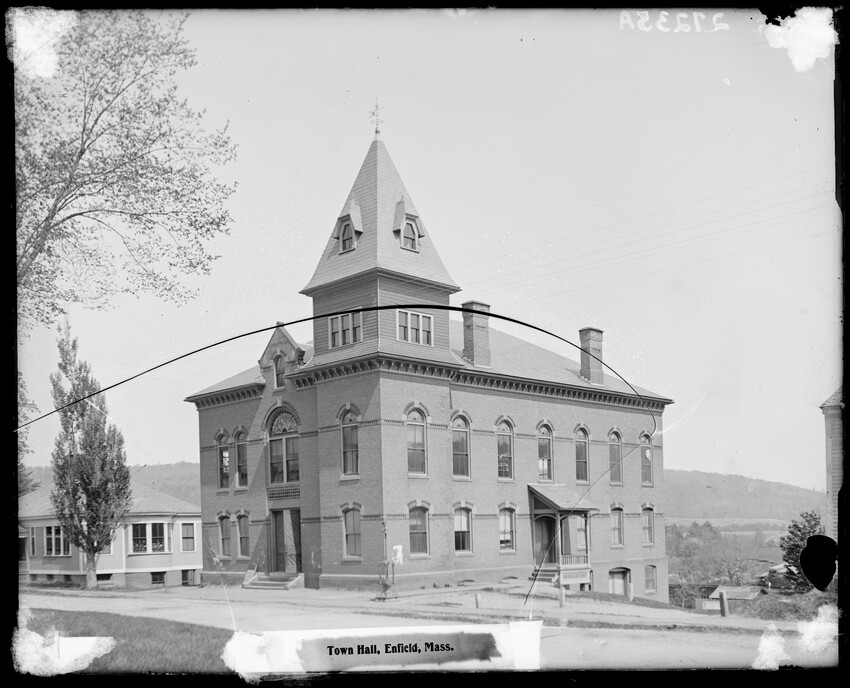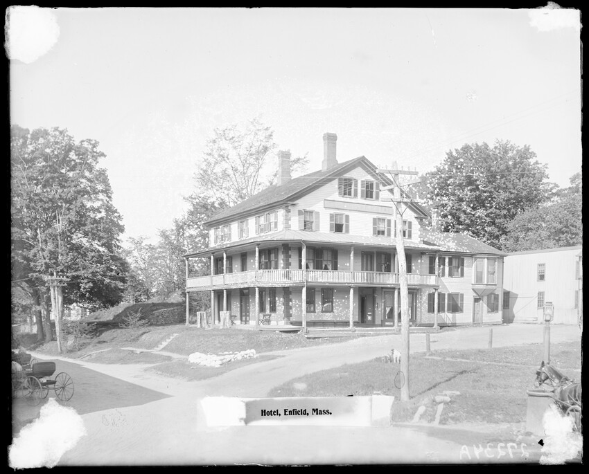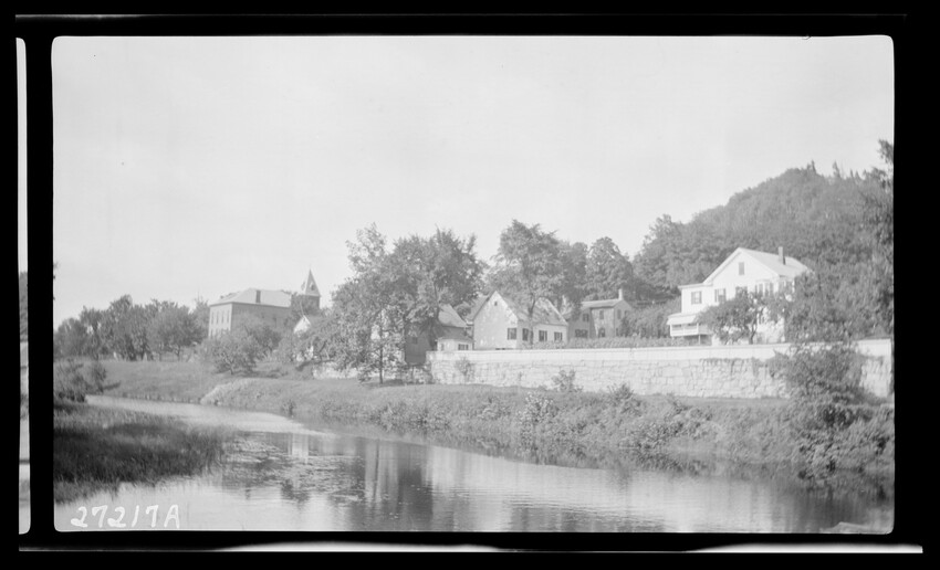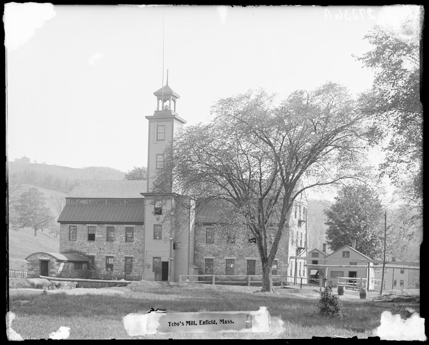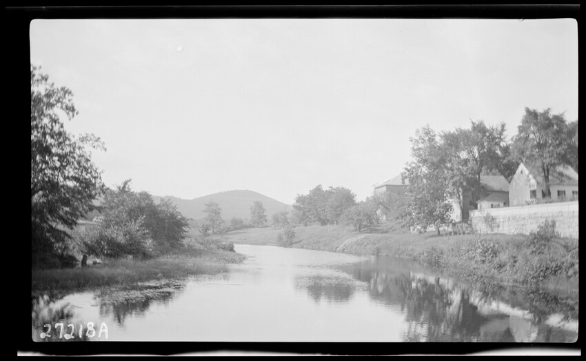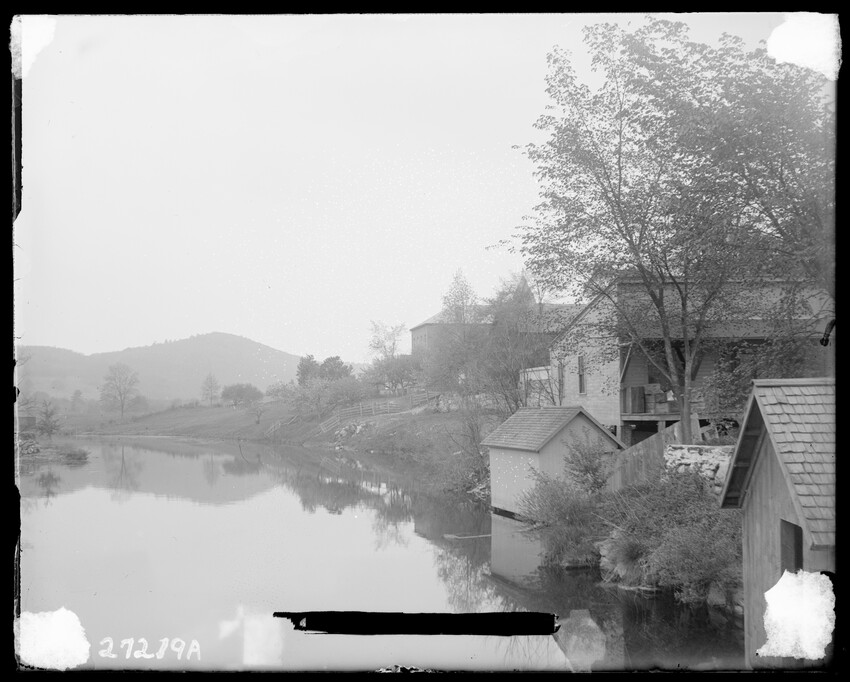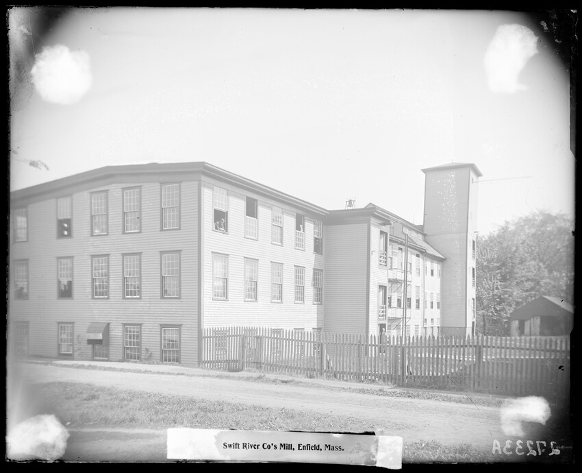 The image shows a view of Swift River in Enfield, Massachusetts. In the foreground, the river is visible with trees and shrubs along its banks. In the background, there are several buildings, including a larger structure with a pointed roof and a few smaller houses. The scene is surrounded by trees ...