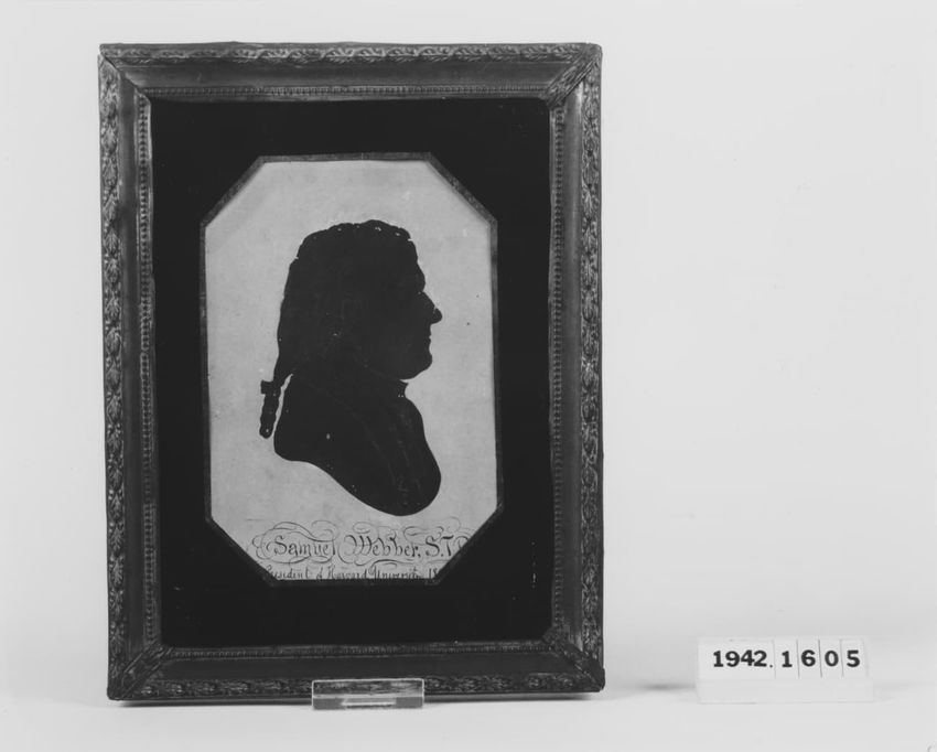 Framed positive-cut silhouette of a man wearing a ponytail shown in a bust-length right-facing profile view. Gold highlights. Inscription below silhouette is partially obscured by mat but the name "Samuel Webber" is visible. Rectangular frame with octagonal mat.