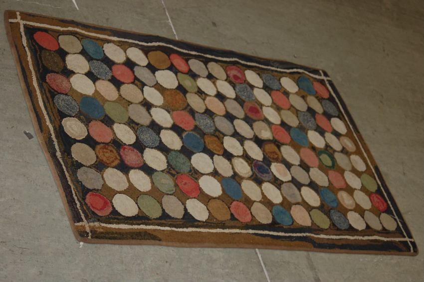 Hooked rug with cream and multi-color circles in rows on a black and tan ground with a white striped border.