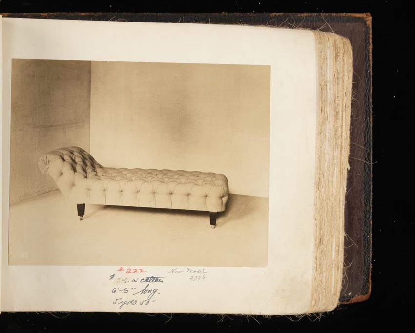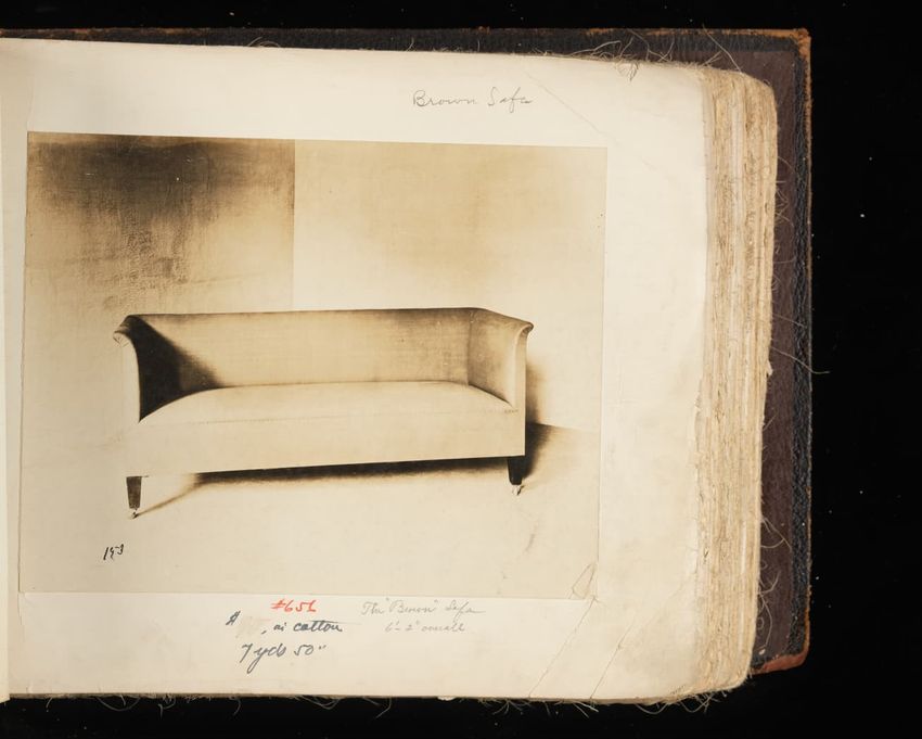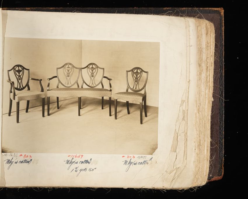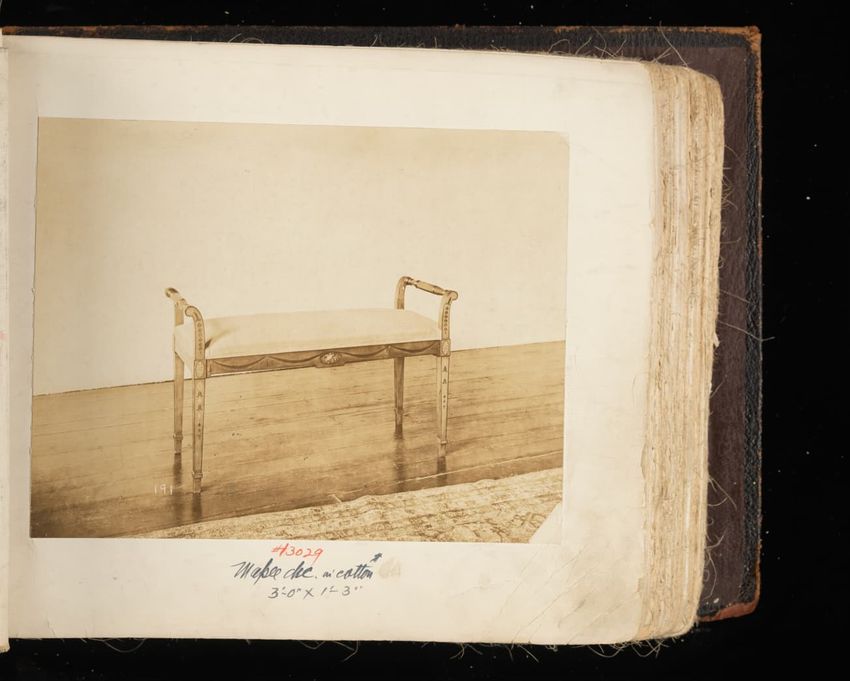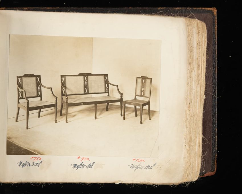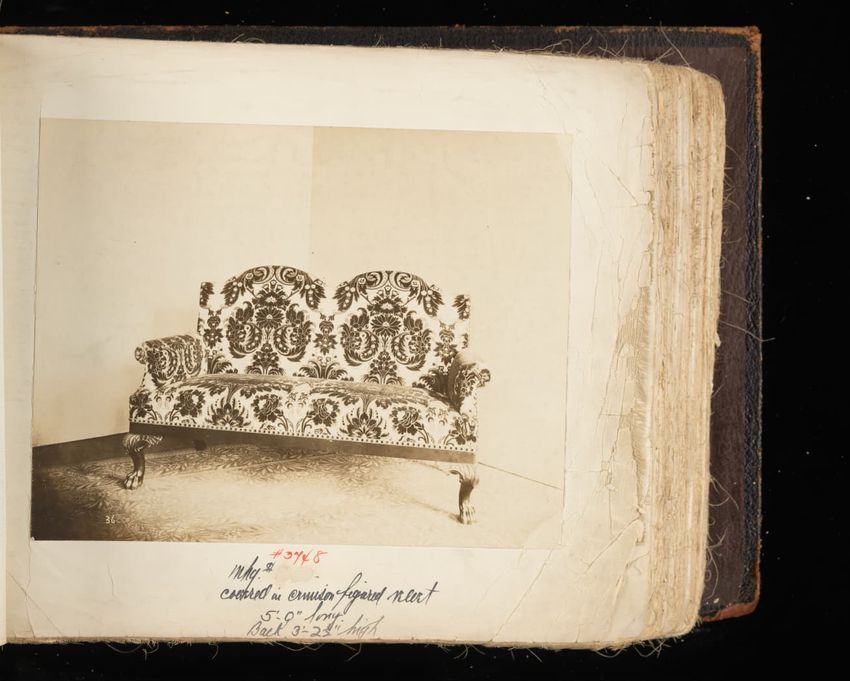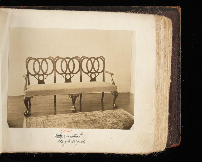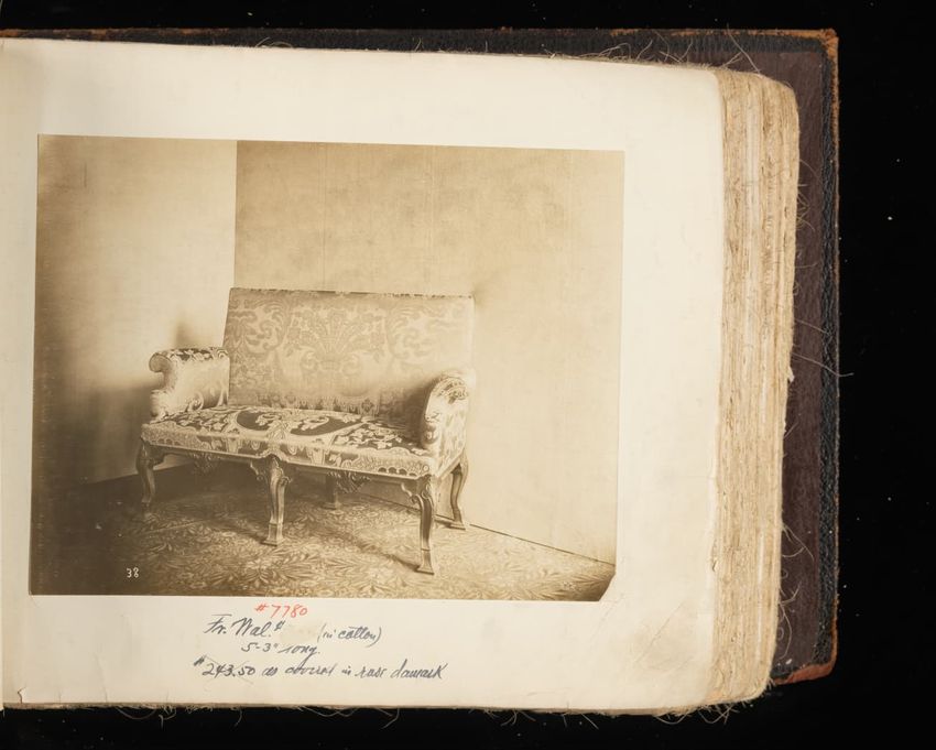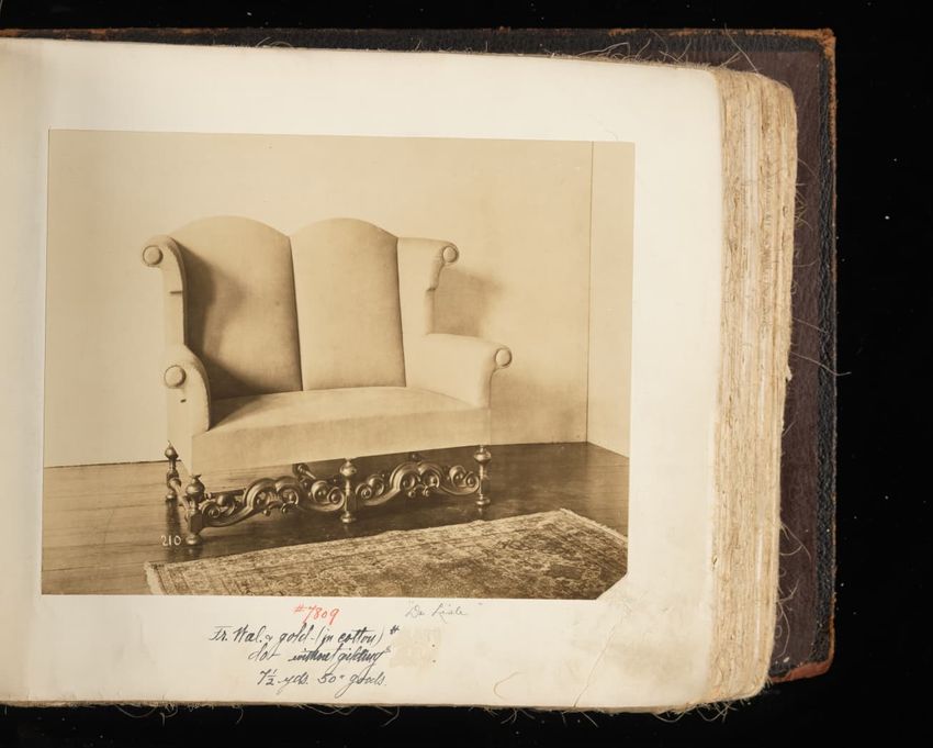 Black-and-white photograph of a sofa. Sofa has tall double arched back; wings with scrolled tops extending down to outward scrolled arms; rectangular seat; upholstered back, wings, arms and seat; turned legs terminating in bun feet; turned side and rear stretchers; and front stretcher with ornately ...