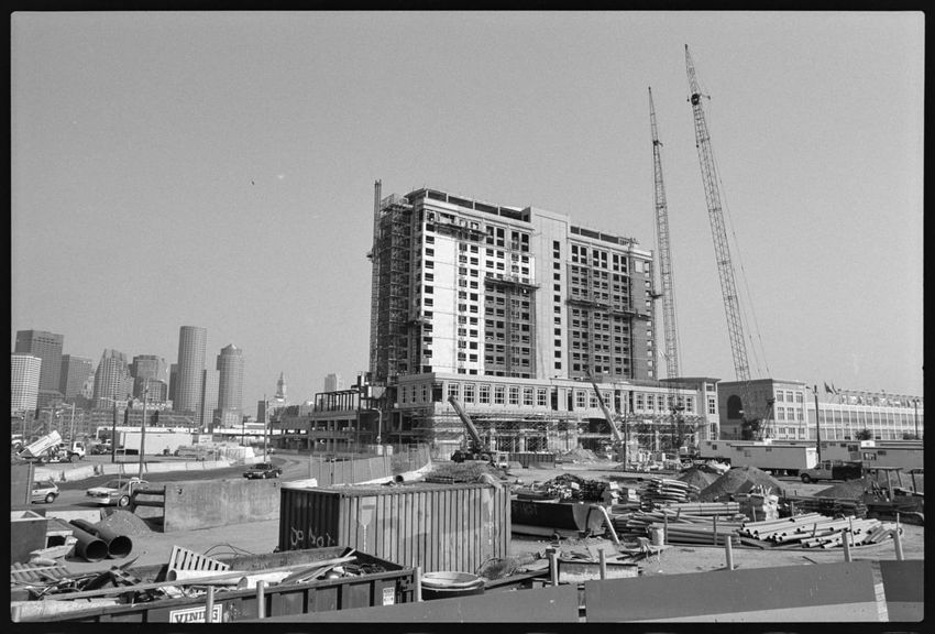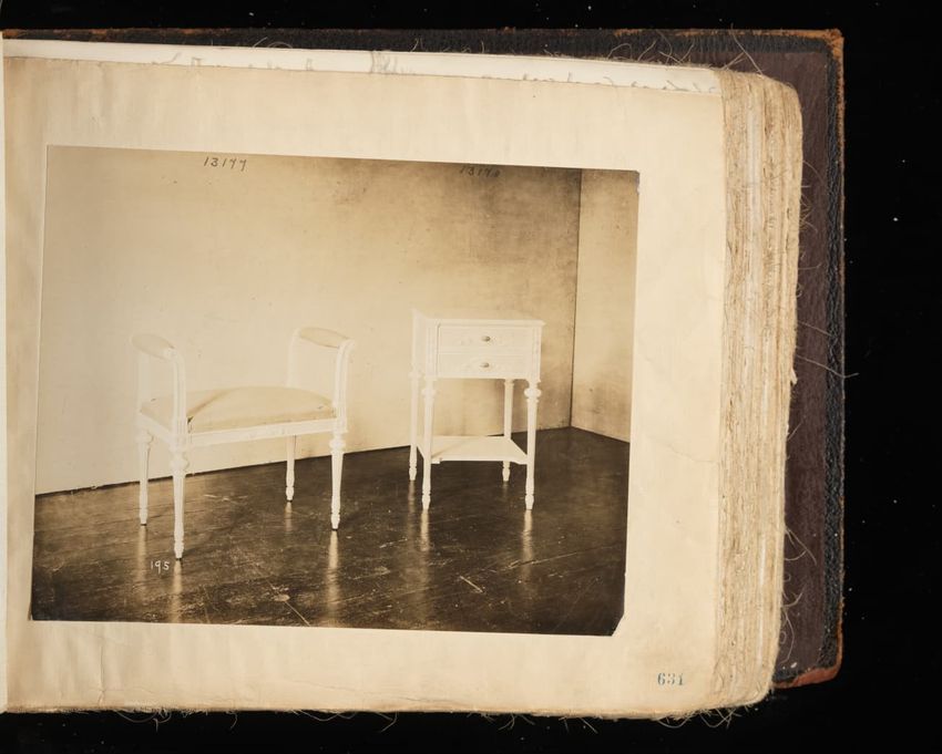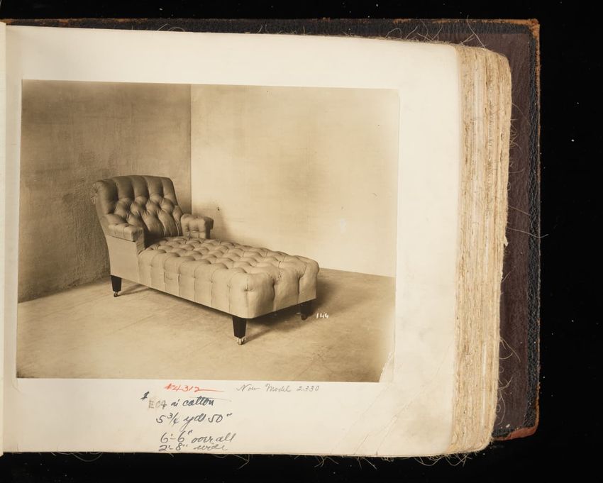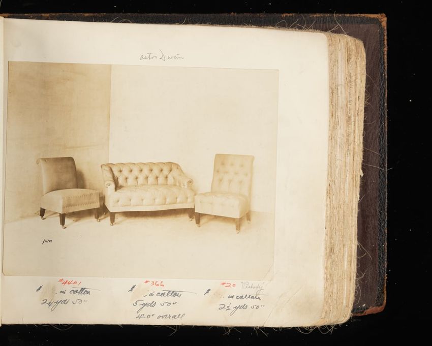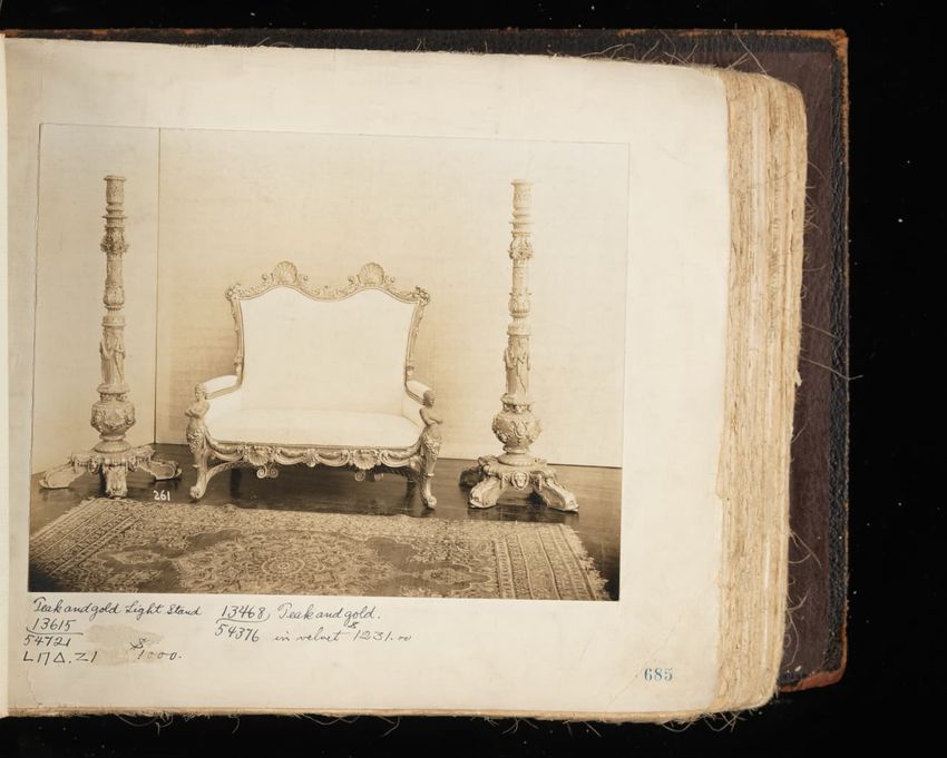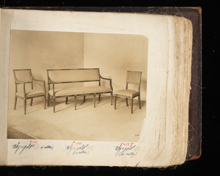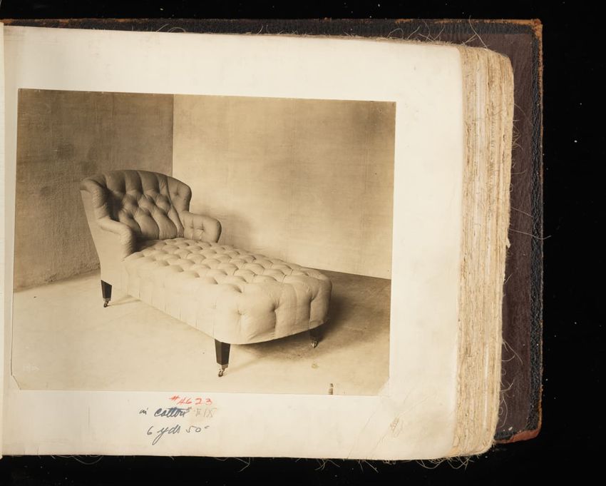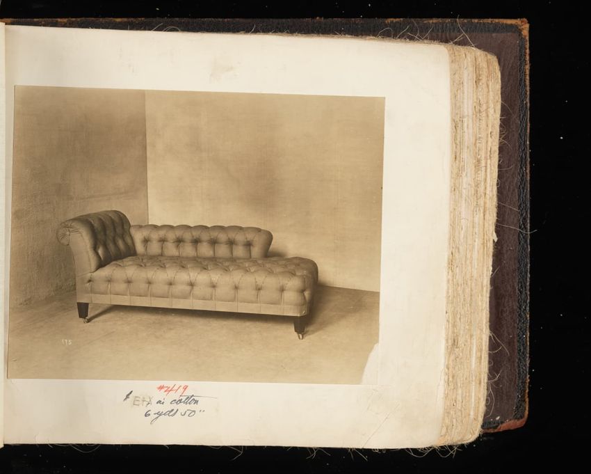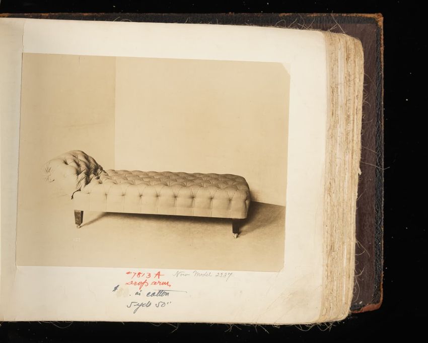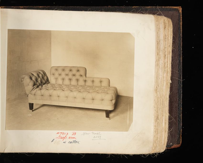 Black-and-white photograph of a sofa. Sofa has tall double arched back; wings with scrolled tops extending down to outward scrolled arms; rectangular seat; upholstered back, wings, arms and seat; turned legs terminating in bun feet; turned side and rear stretchers; and front stretcher with ornately ...