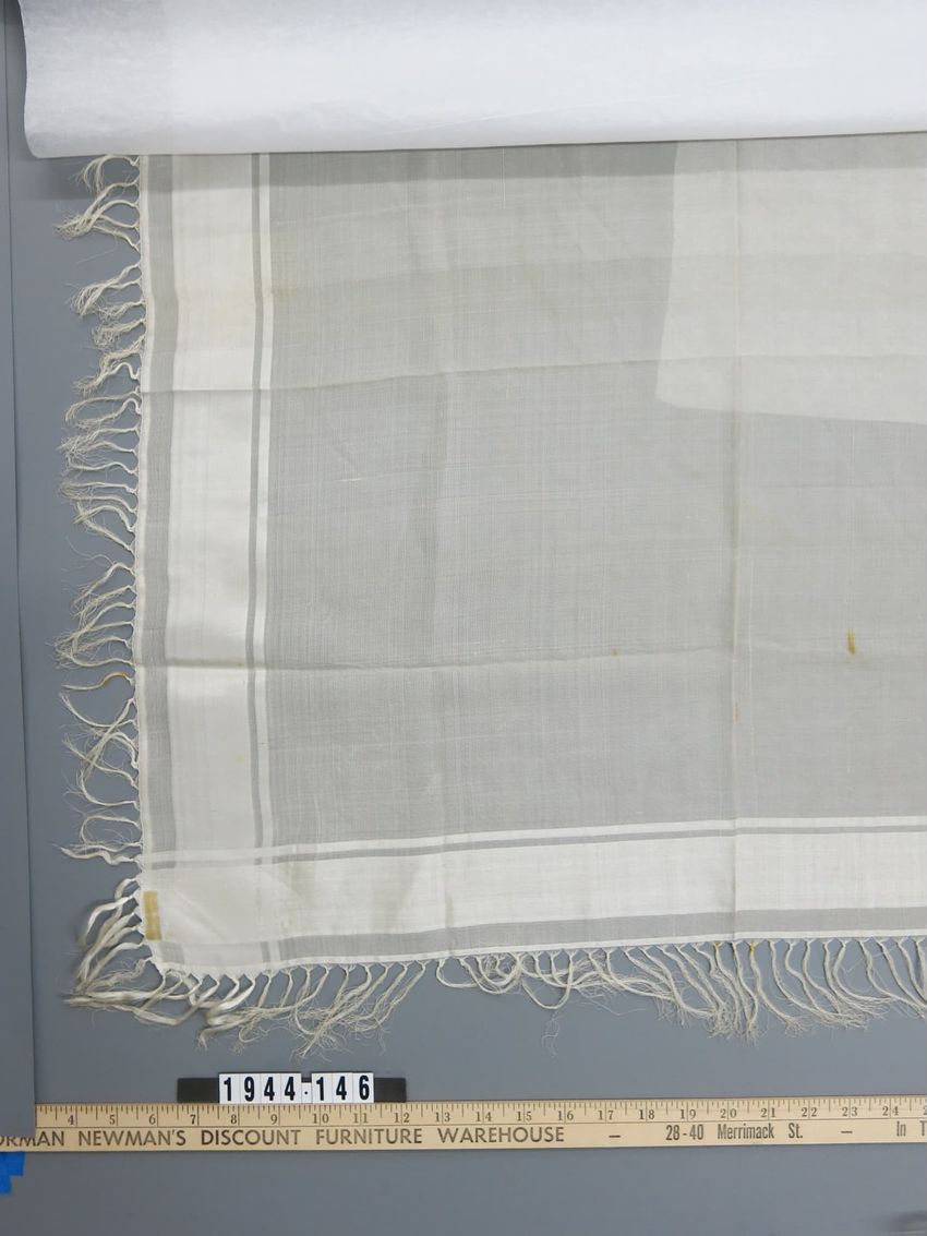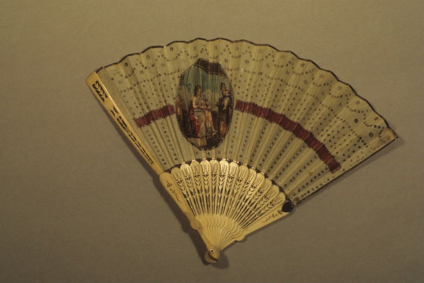 FAN (A): Carved ivory sticks and guards; leaf of discolored white silk with printed center medallion of a classical scene of two women with winged cupid, lamb, dog and urn; faded purple horizontal stripe on either side of medallion; silver spangles of various sizes and shapes cover entire front. ...