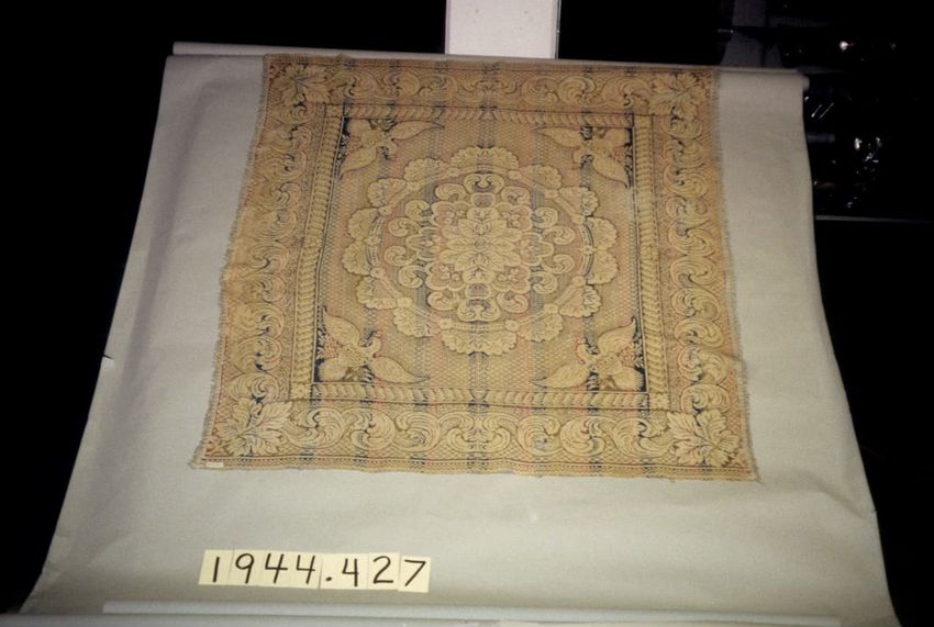 "Crazy quilt" divided into four even blocks joined by feather stitch; within each block is patchwork of silks, satins and velvets stitched together. Most pieces have embroidered motifs. Black velvet border with embroidered stitch decoration.
