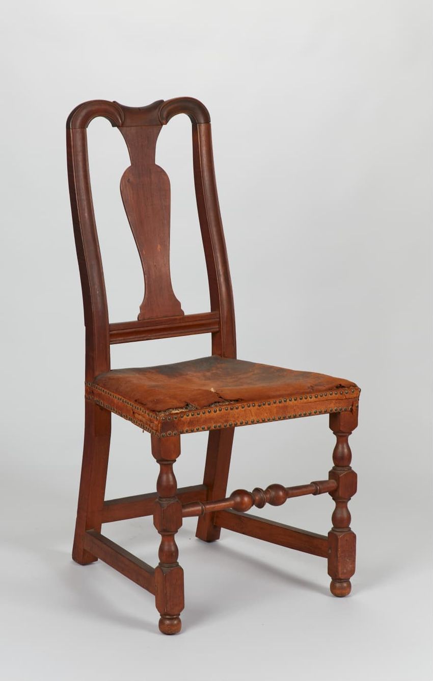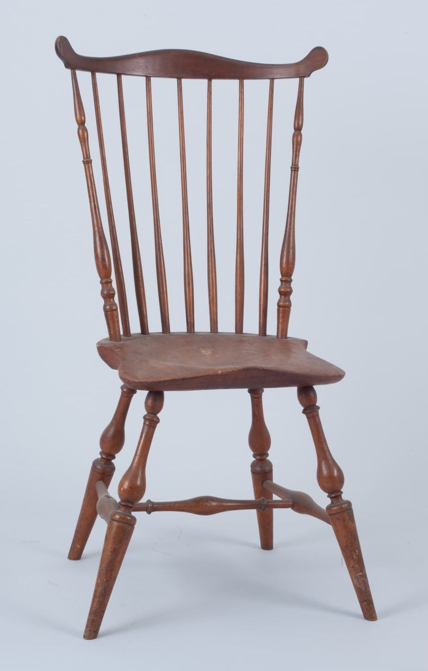High chest. Mahogany, red oak, hard maple, soft maple, white cedar, tulipwood, white pine. Top section has eight drawers, center drawer has carved shell design. Drawers flanked by carved pilasters. Scroll pediment with carved rosettes.Three flame carved finials. Bottom section has four drawers, ce...