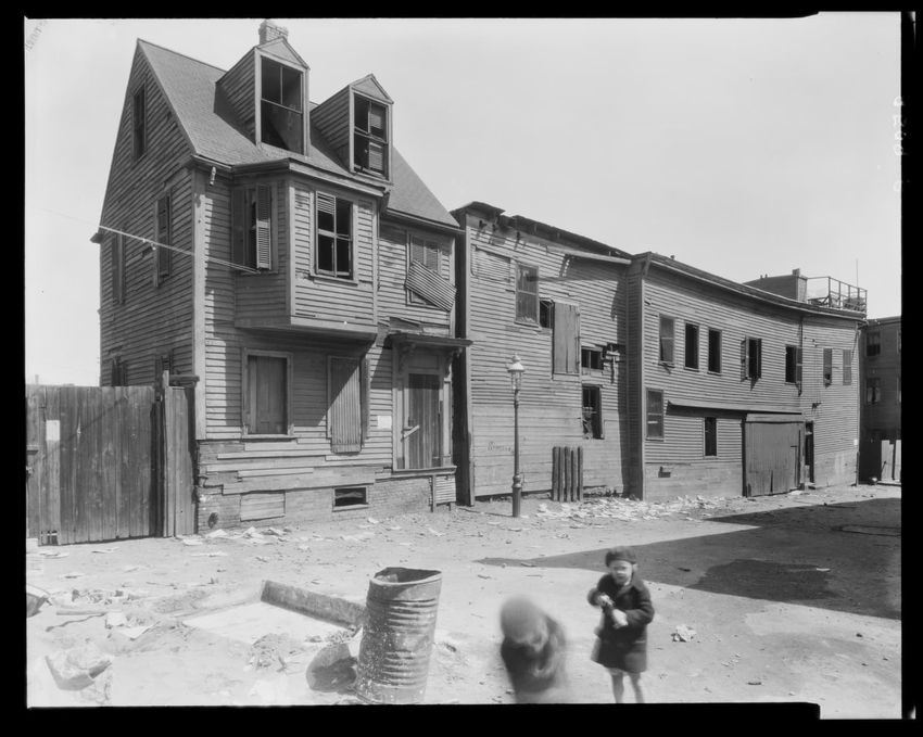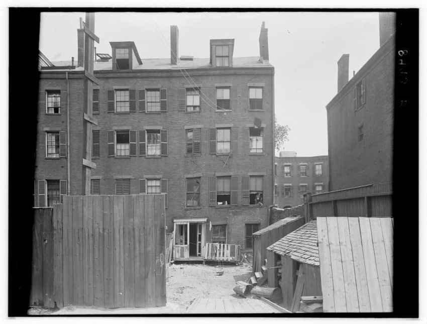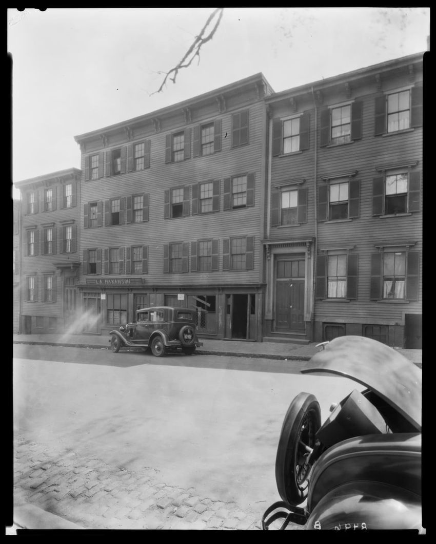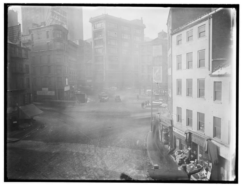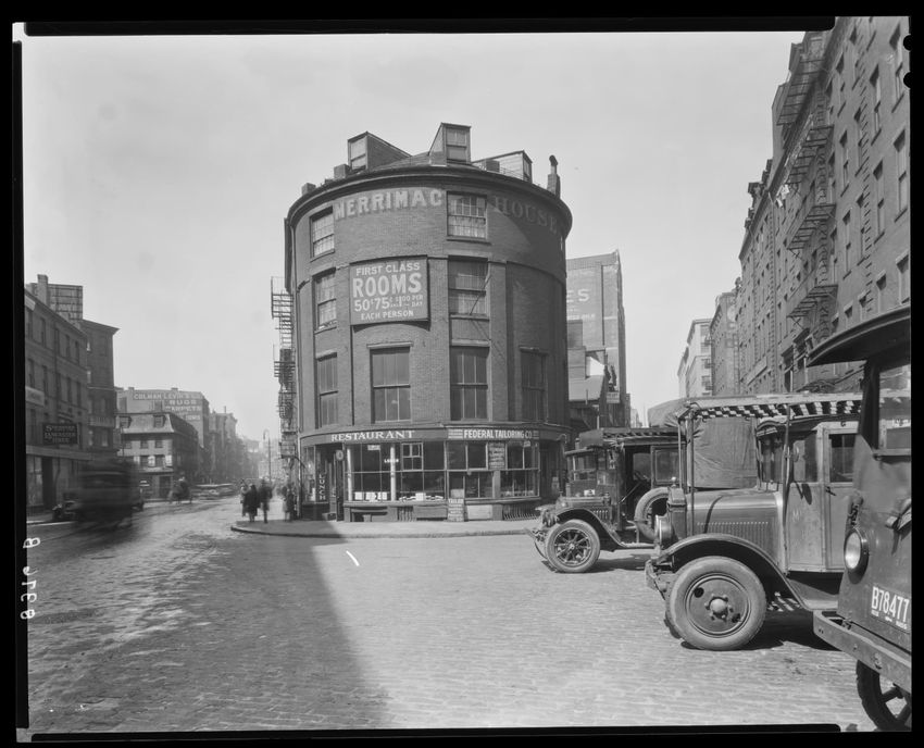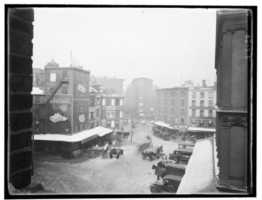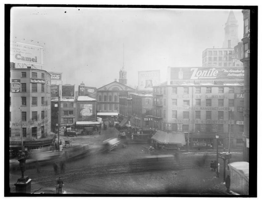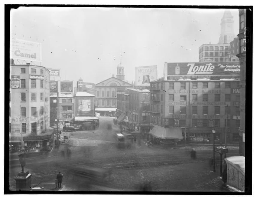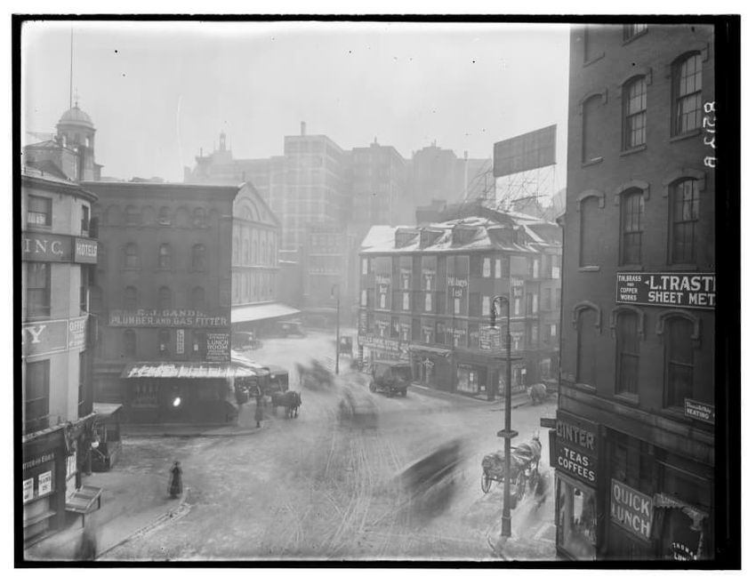The image depicts Dock Square in Boston, Massachusetts. Visible are multiple buildings with various signs, including "S.J. Sands Plumber and Gas Fitter," "L. Trastram Sheet Metal," "Quick Lunch," and "Tea Coffees." Horse-drawn carriages are visible on the streets and pedestrians are walking on the s...