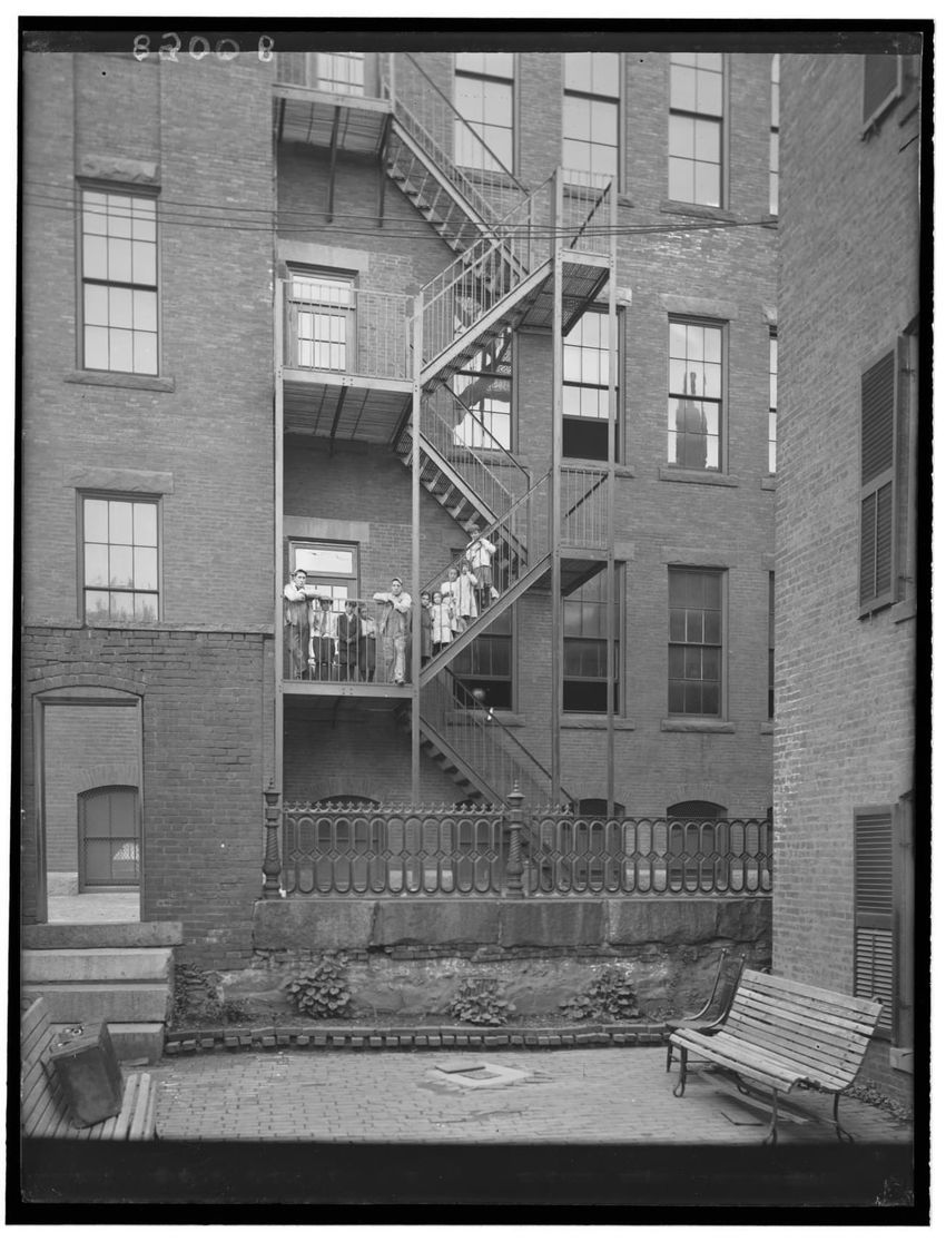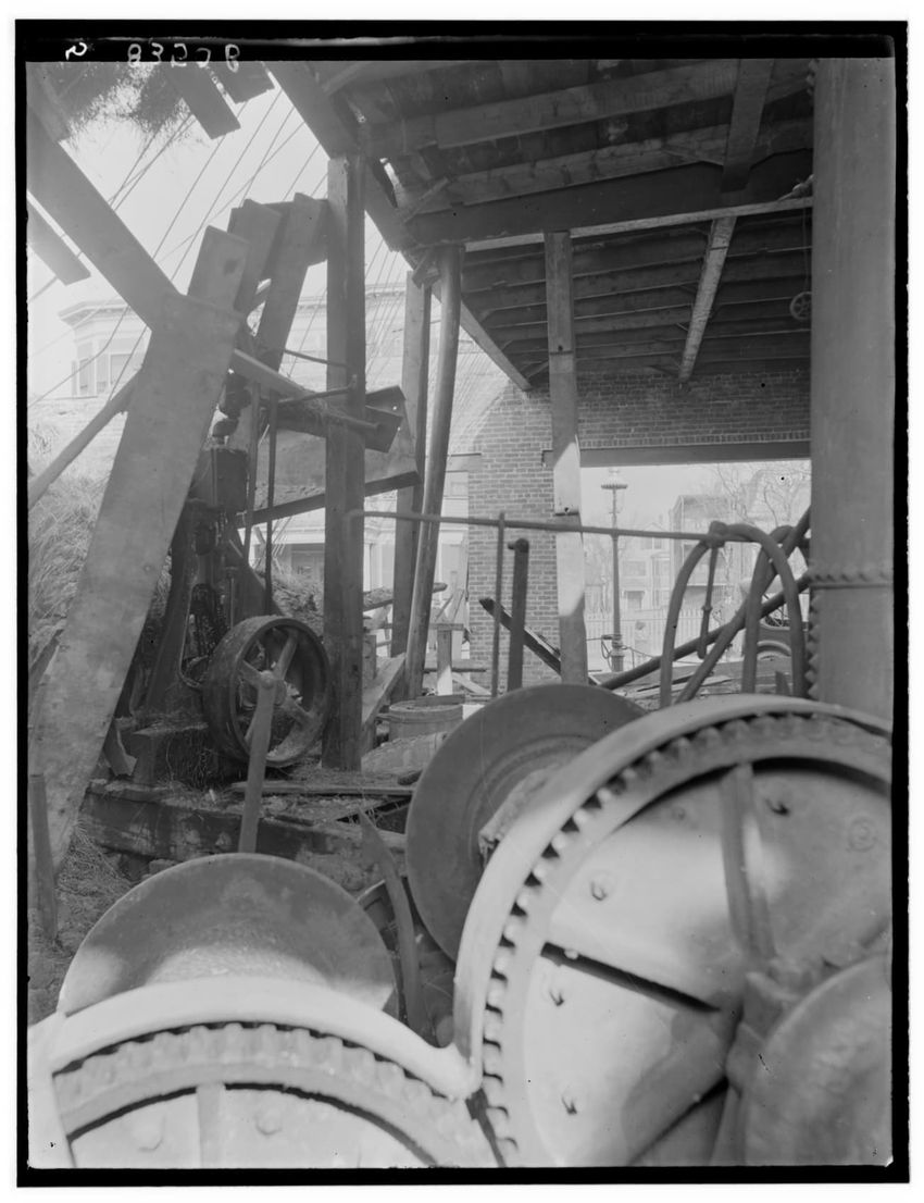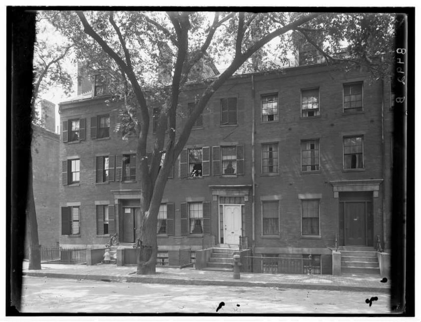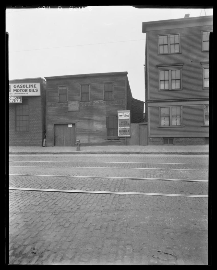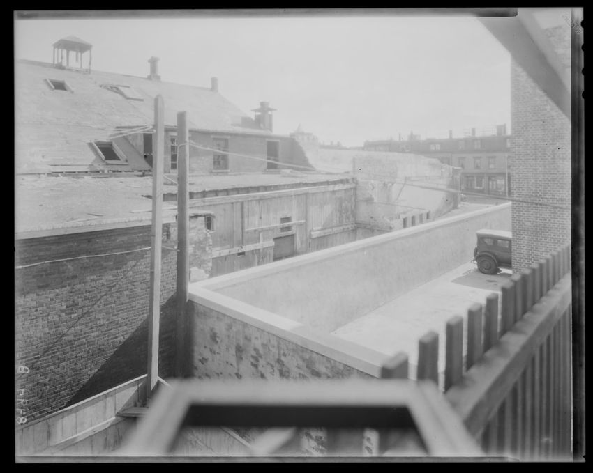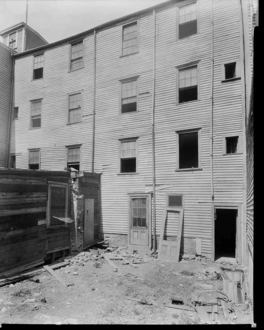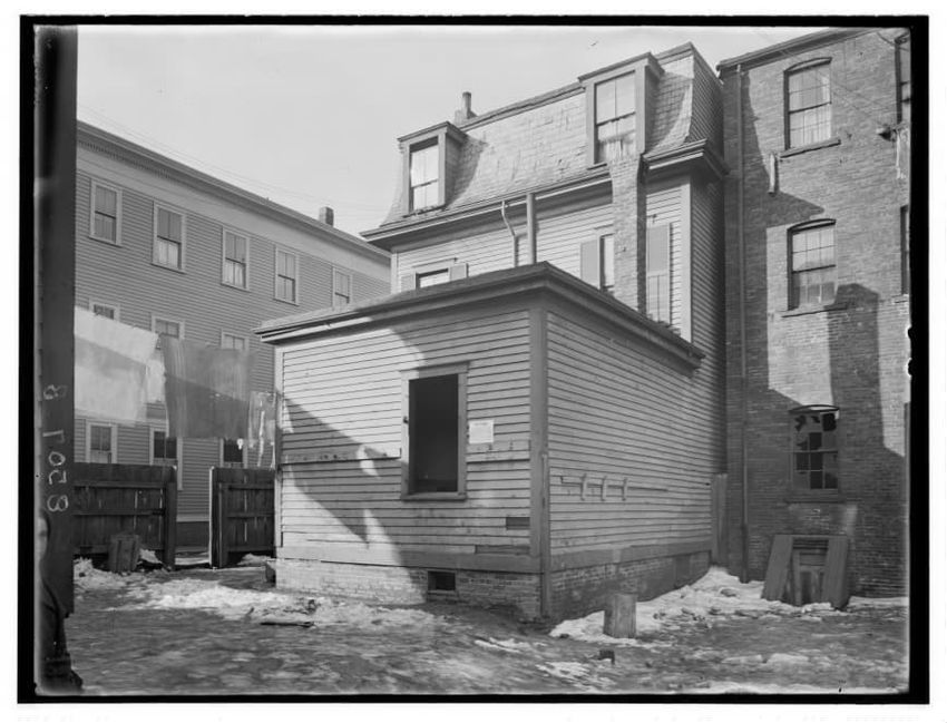 The image depicts Dock Square in Boston, Massachusetts. Visible are multiple buildings with various signs, including "S.J. Sands Plumber and Gas Fitter," "L. Trastram Sheet Metal," "Quick Lunch," and "Tea Coffees." Horse-drawn carriages are visible on the streets and pedestrians are walking on the s...