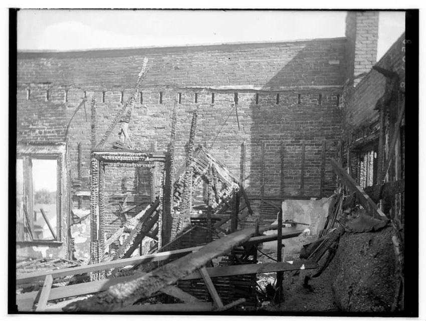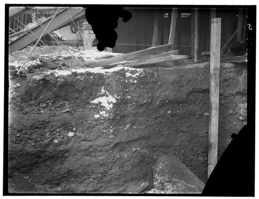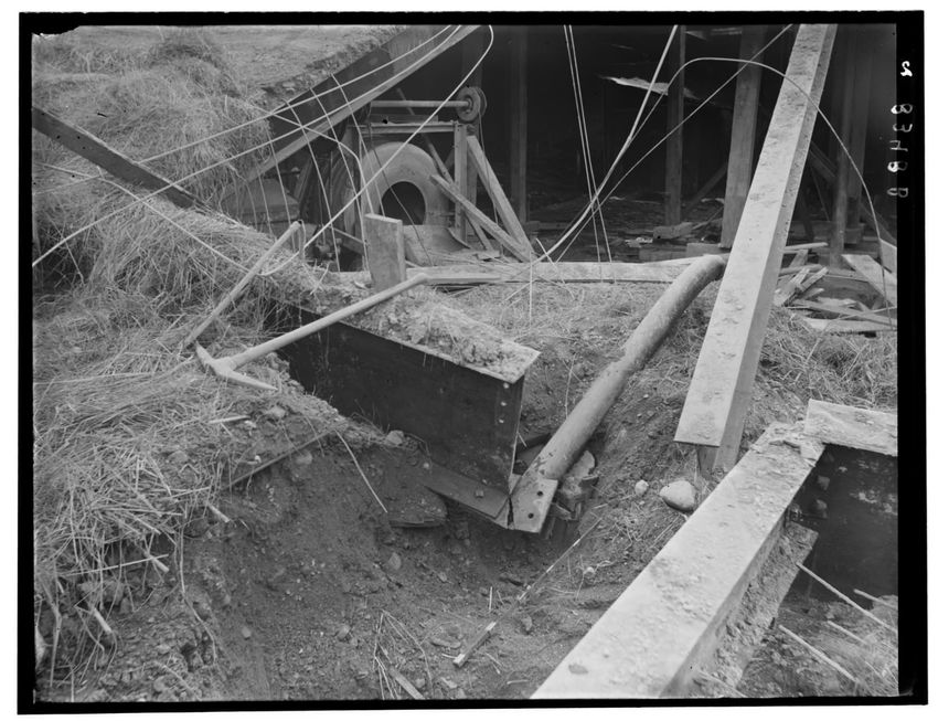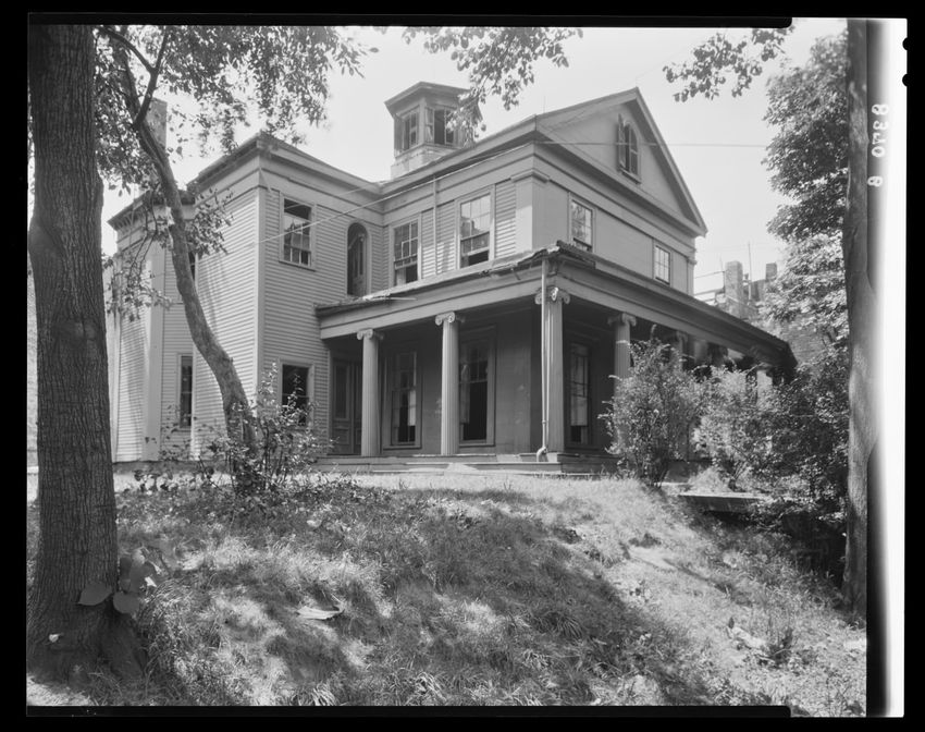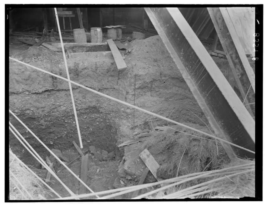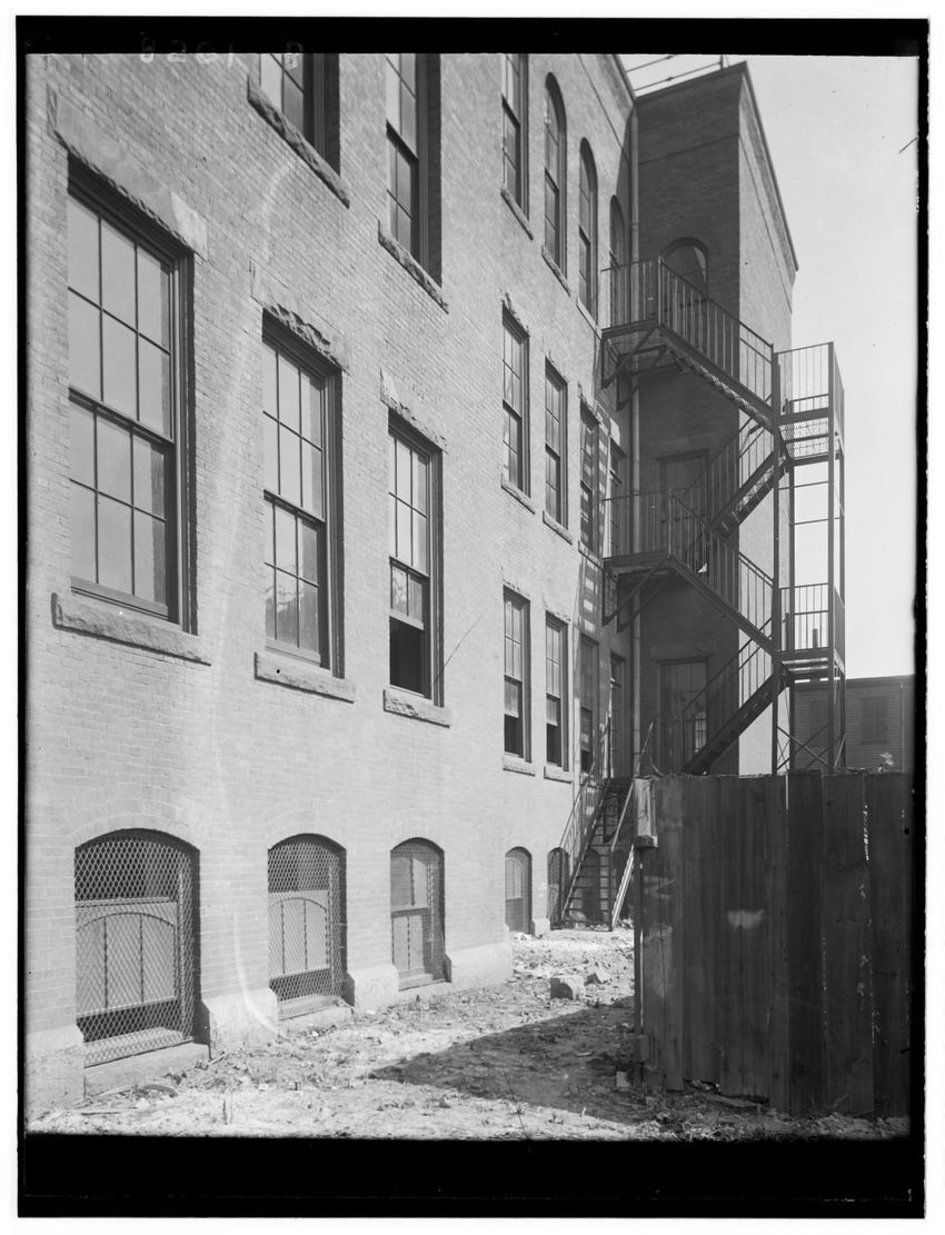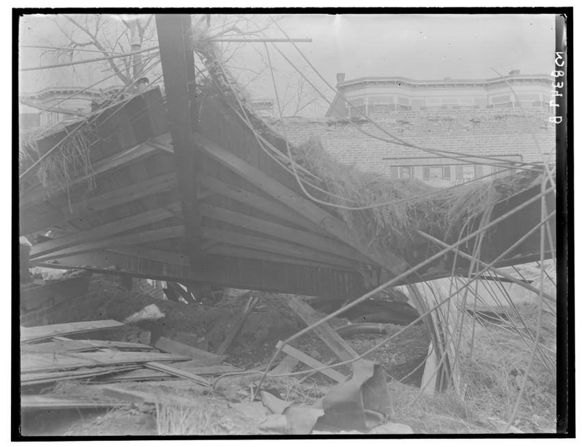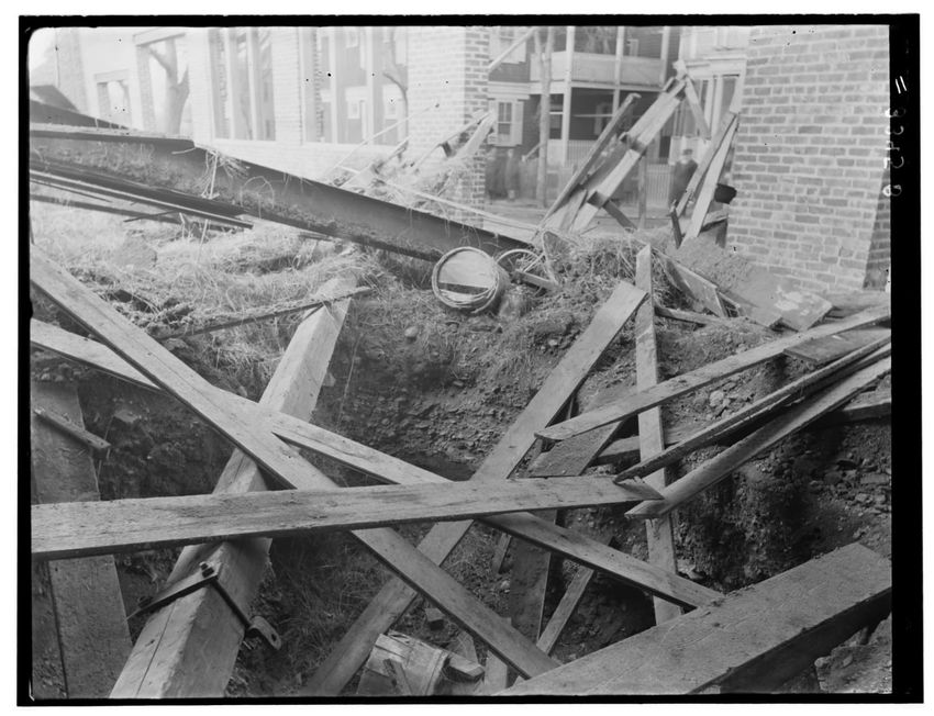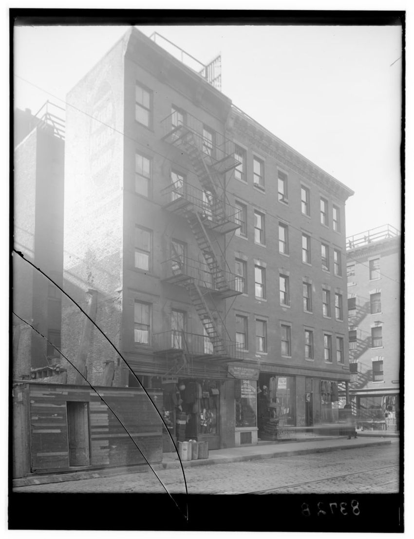 The image depicts Dock Square in Boston, Massachusetts. Visible are multiple buildings with various signs, including "S.J. Sands Plumber and Gas Fitter," "L. Trastram Sheet Metal," "Quick Lunch," and "Tea Coffees." Horse-drawn carriages are visible on the streets and pedestrians are walking on the s...