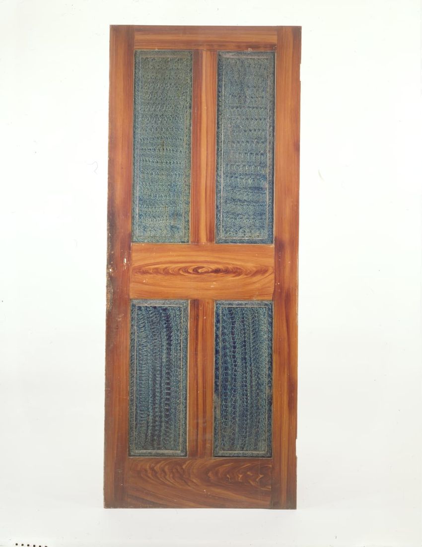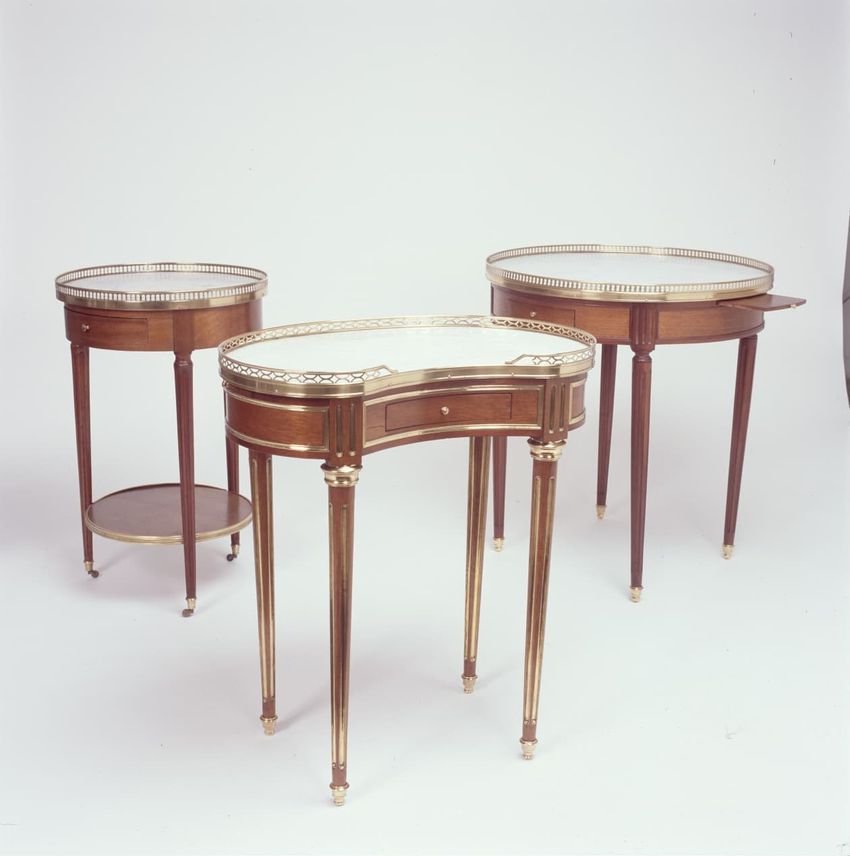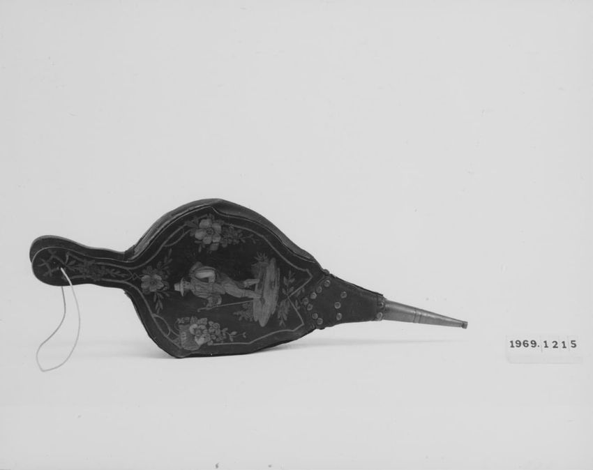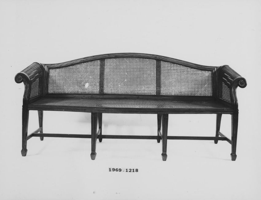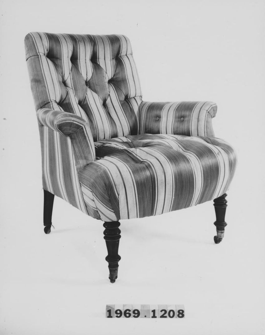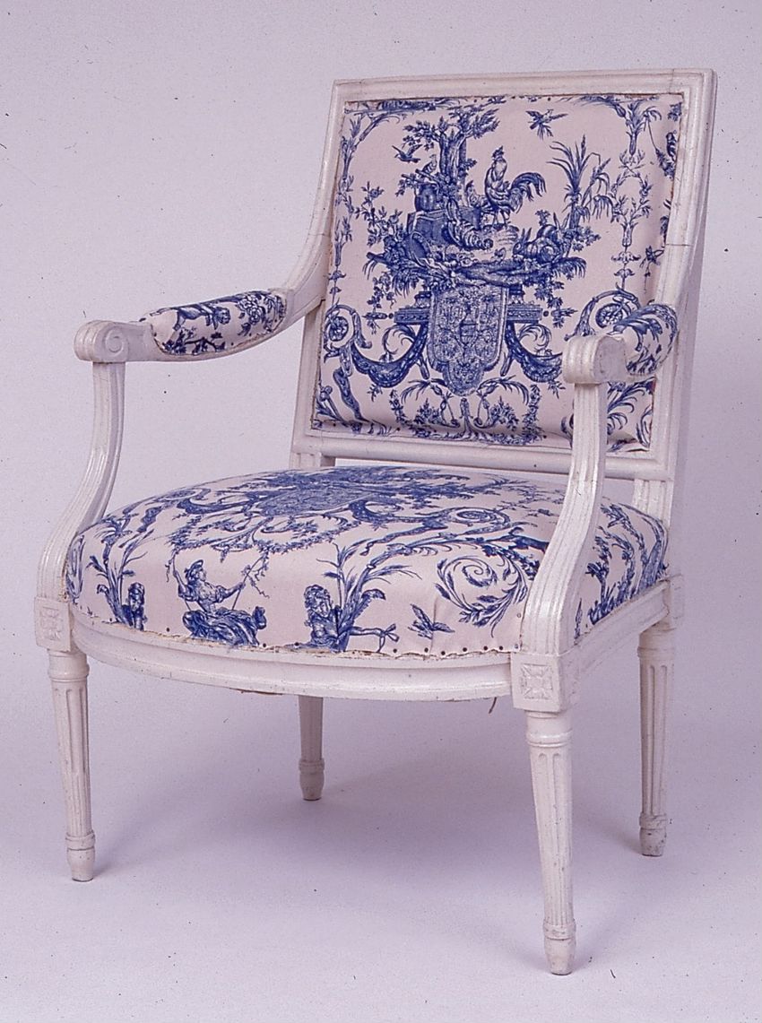 Painted white armchair, Louis XVI style. Square back, shaped arms, bowed seat rail. Blue and white toile upholstered seat, back, and arms. 1890s reprint of 1780 Jean Baptiste Huet design "L'escarpolette" (The Swing).