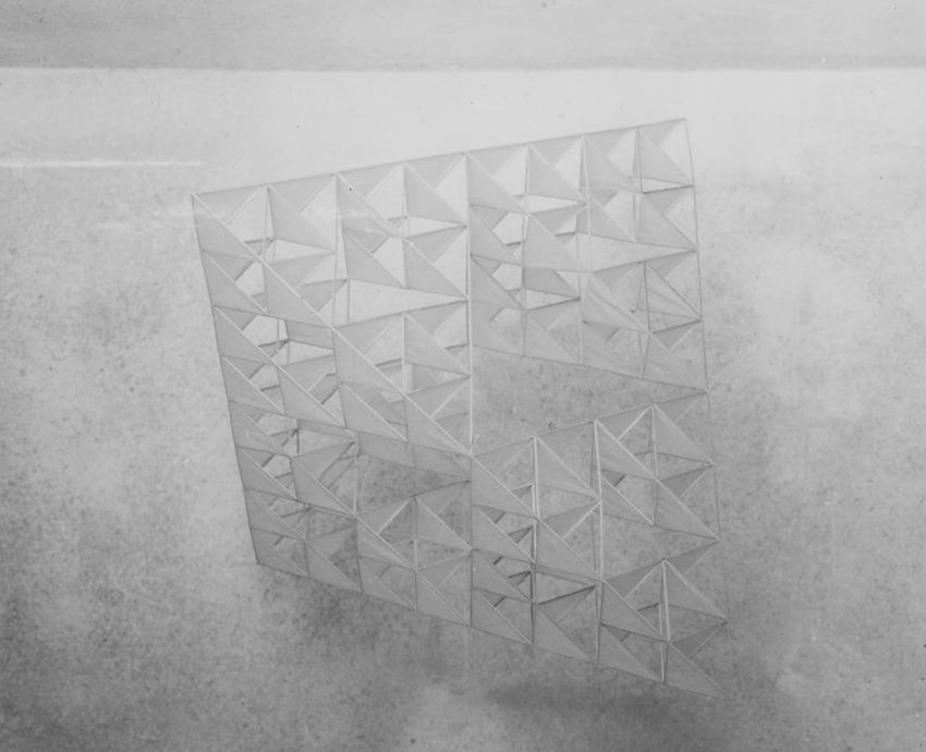 Rectangular pieced quilt of hexagonal pieces in multi-colored prints; each hexagon is pieced around a corresponding piece of paper. Not finished; no backing; no stuffing. Hexagons arranged so they form larger 6-lobed elements or "stars" placed in vertical rows, alternating w/ salmon-colored stripe o...