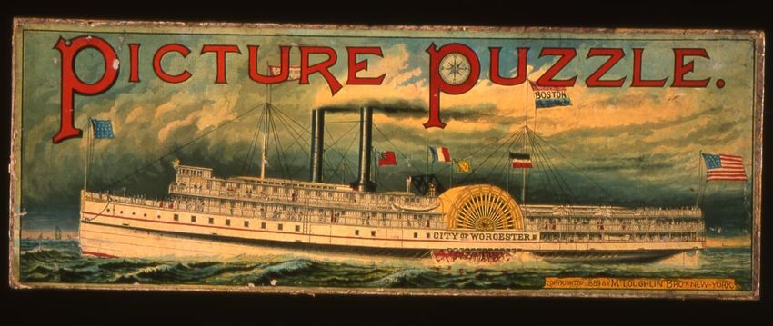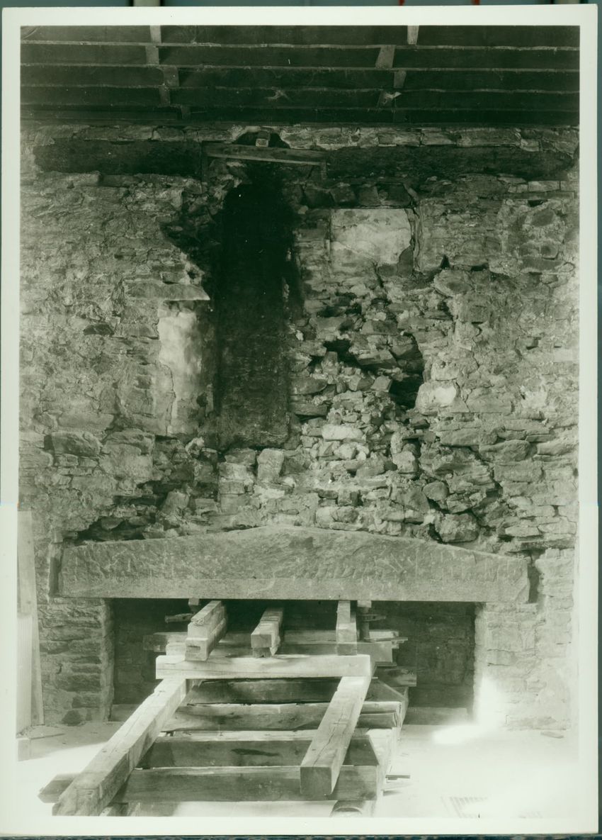 Photographer Wallace Nutting staged this scene of a model in period costume rocking a cradle on the hearth of a fireplace and a girl in period costume peeling apples in the Rugg-Dennett House, also known as the Rugg-Gates-Dennett House, in Framingham, Massachusetts.