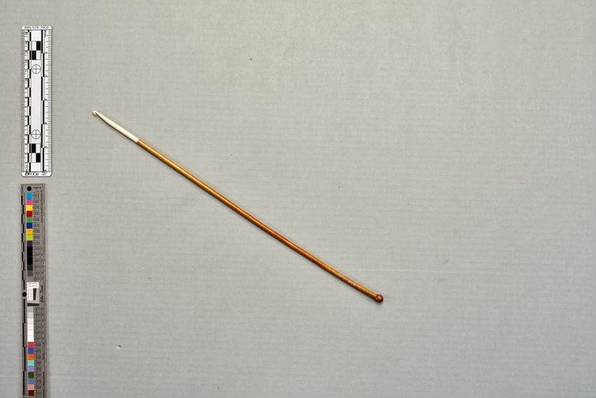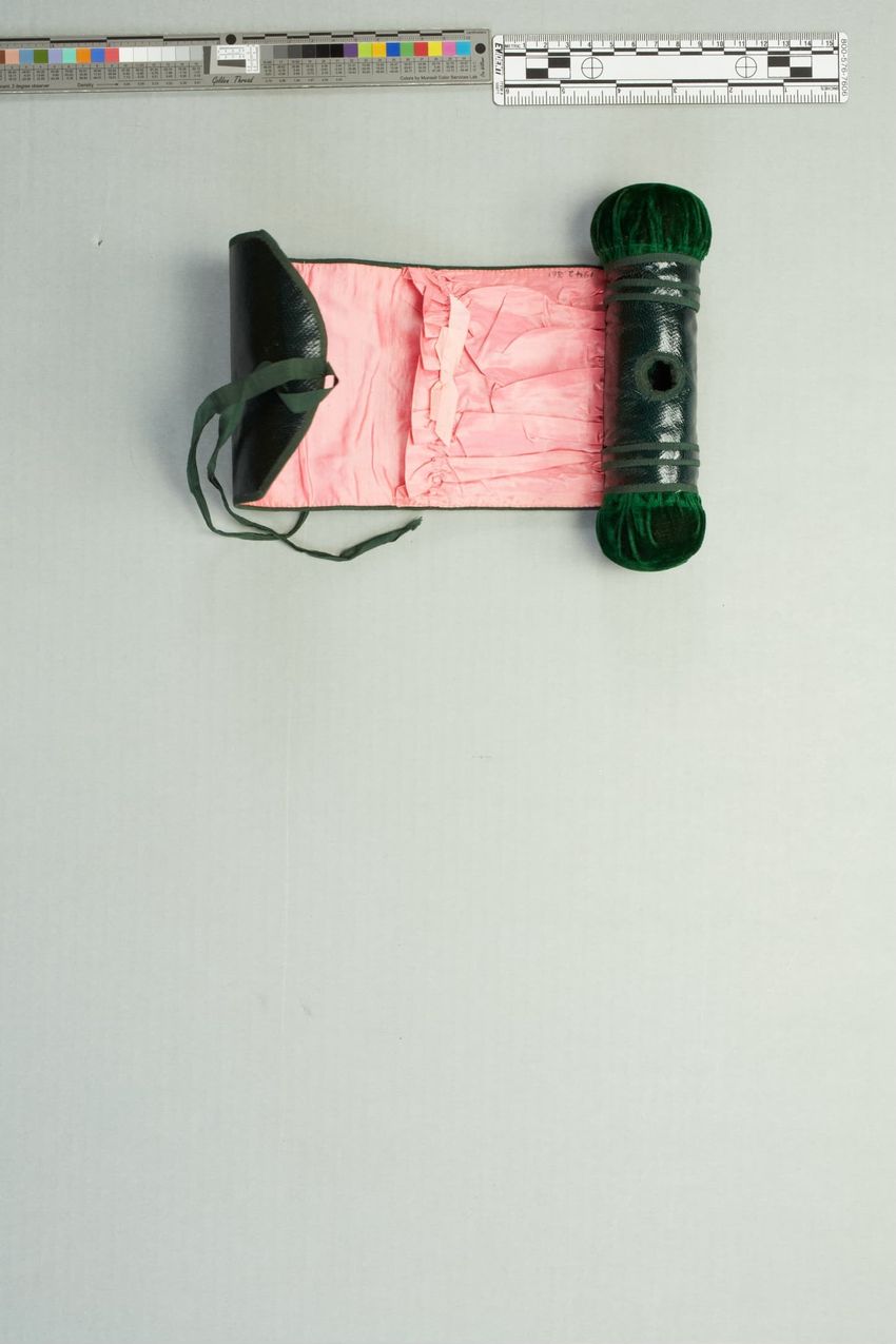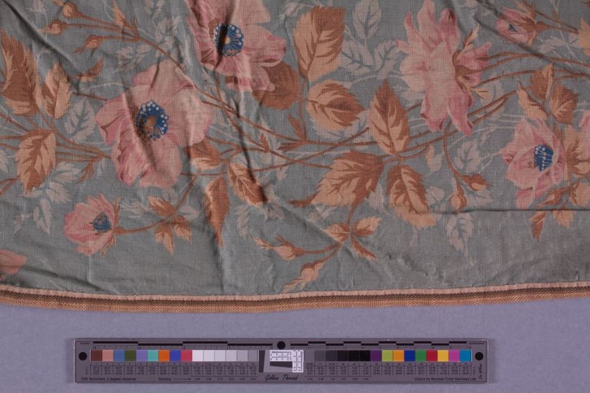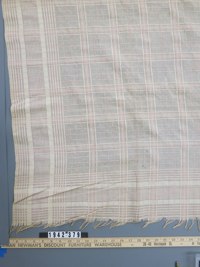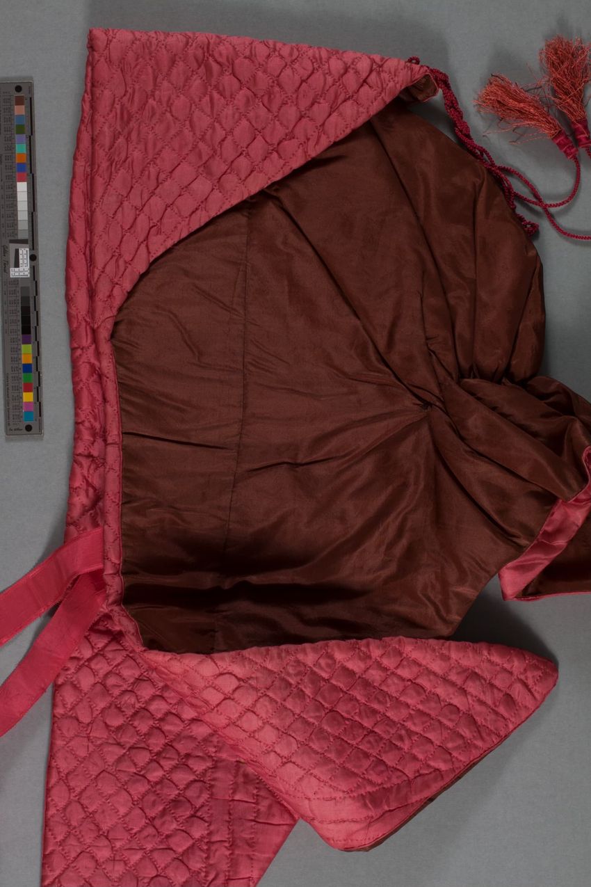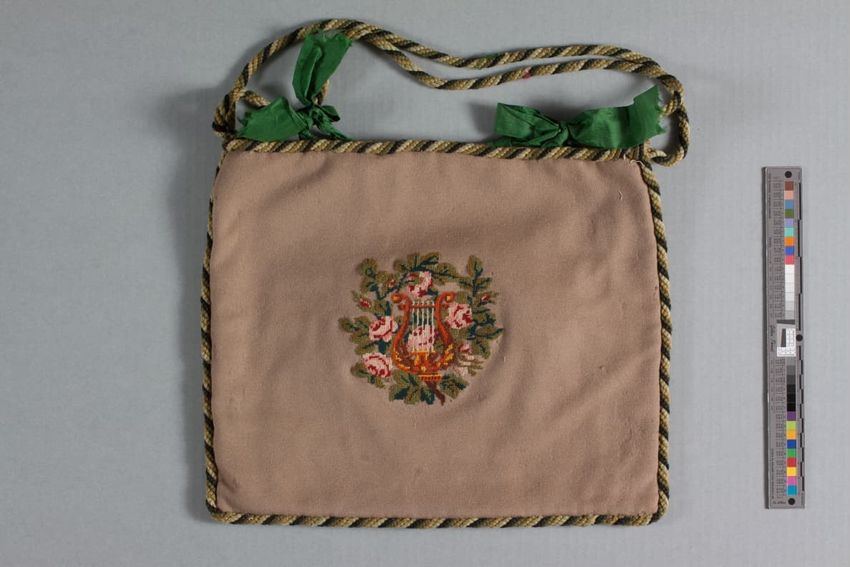Round "Nantucket Lightship" basket with swinging handle. Wide opening and without lid. Made of wood staves/ribs, rattan/cane weaves, copper alloy rivets and burs, wood handle, and turned and grooved cherry wood base.