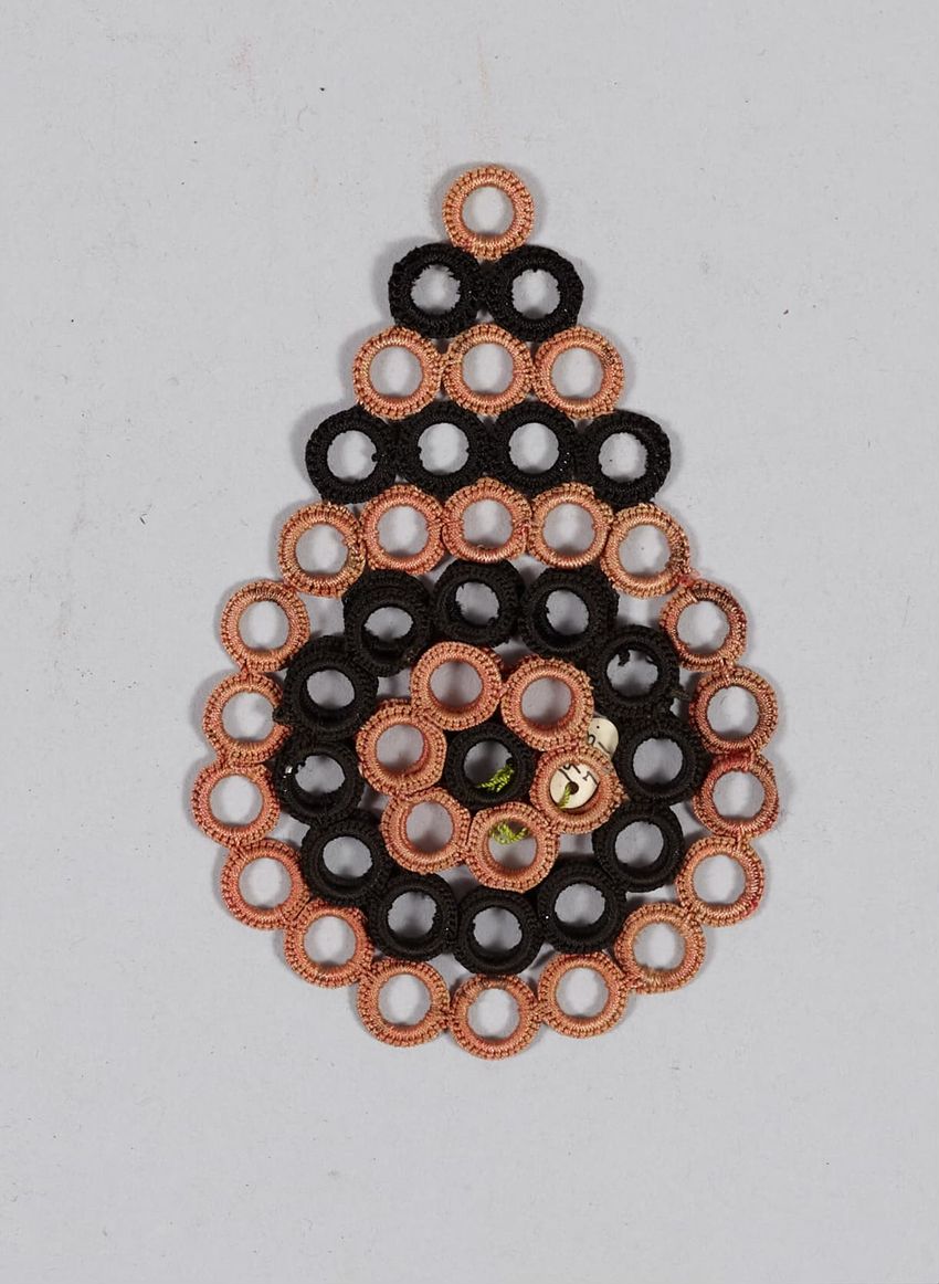 Cream wool 3/4 cape; block printed with border of floral garland around yoke, and border of same with three rows of paisleys (garland and paisleys in pink, green, gold, red and blue with black hatchments to imitate weaving) alternating with floral sprig along center front and around hem; opening wit...