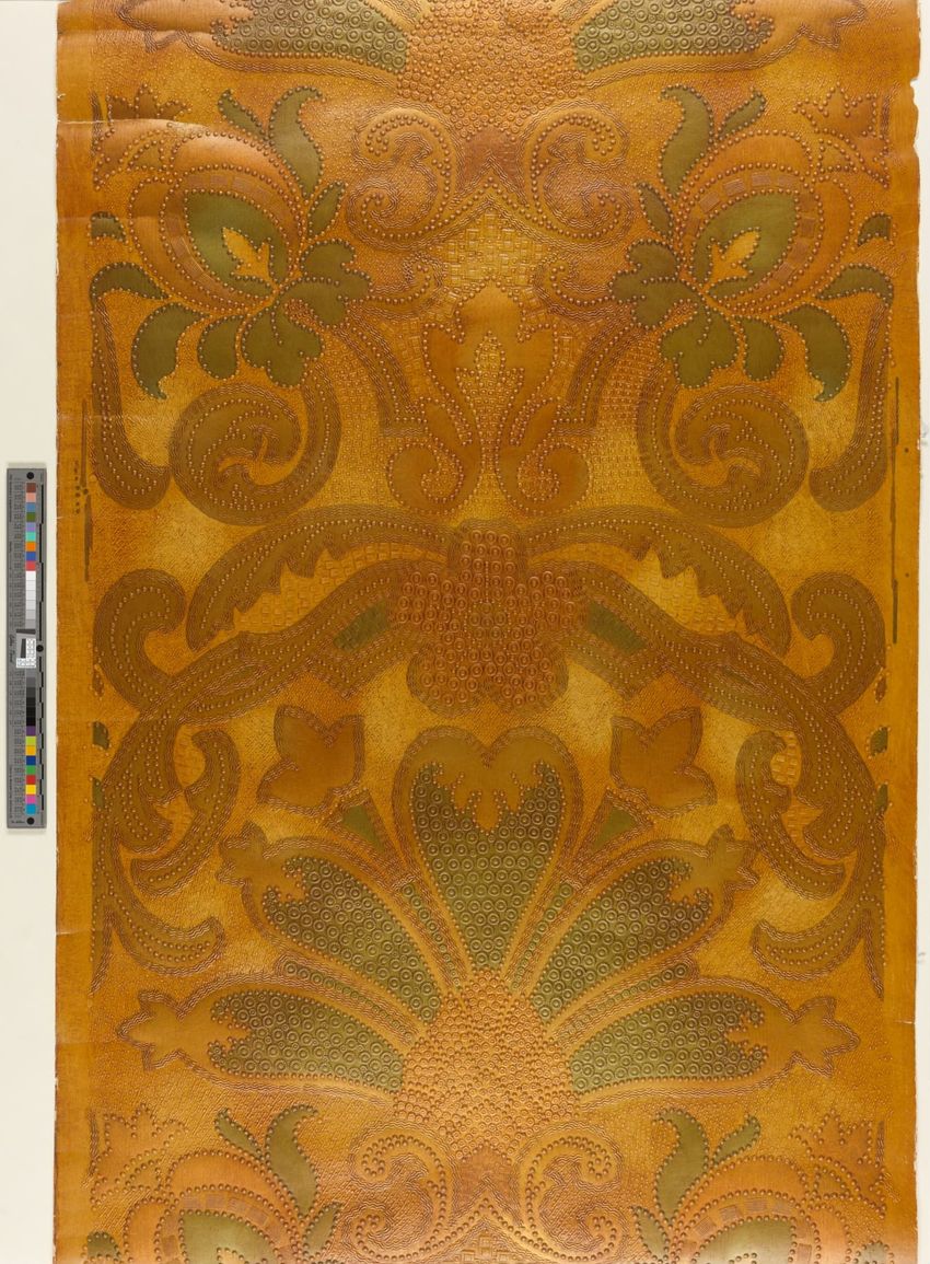 Wallpaper fragment, Arts and Crafts embossed leather pattern in tones of burnt gold and green. Attributed to Jeffrey & Co., London.