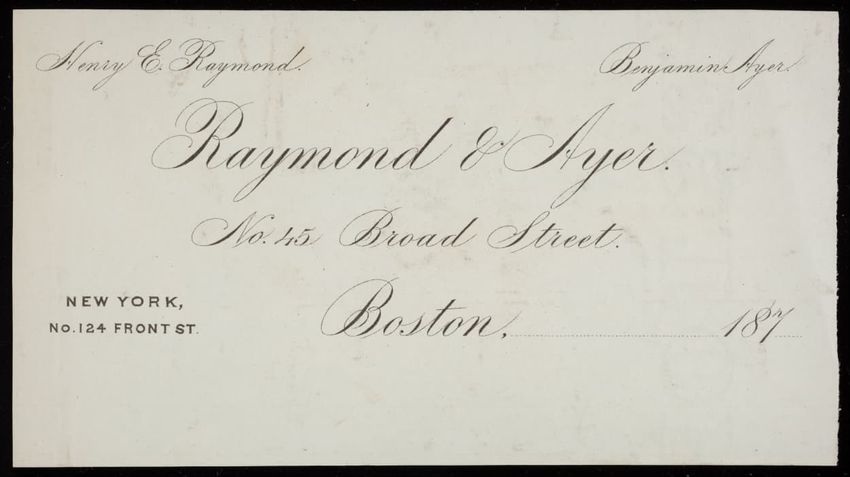 The names Henry E. Raymond and Benjamin Ayer are at the top of the letterhead. The business also has an office in New York City at No. 124 Front Street. Information on the business is from the "Boston almanac & business directory," (Boston : Sampson, Davenport & Co., 1885), page 502. The almanac is ...