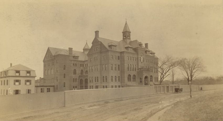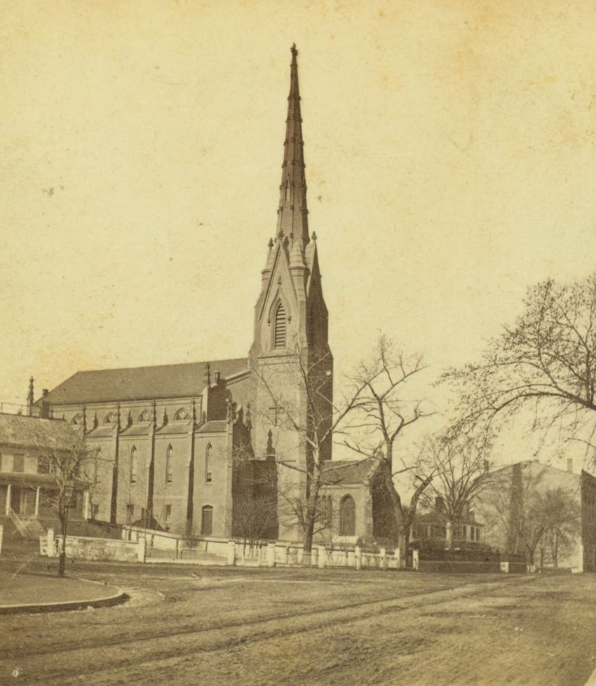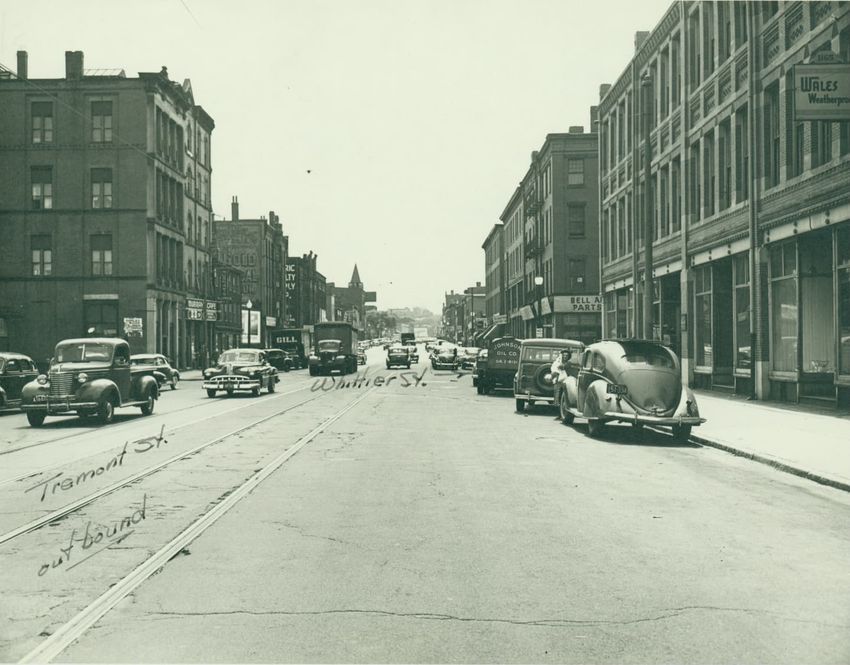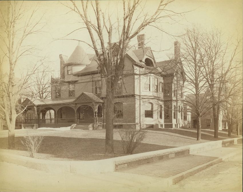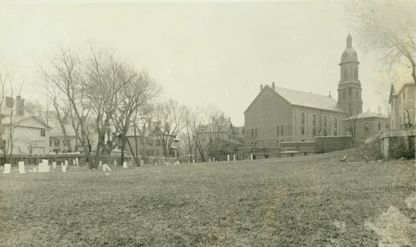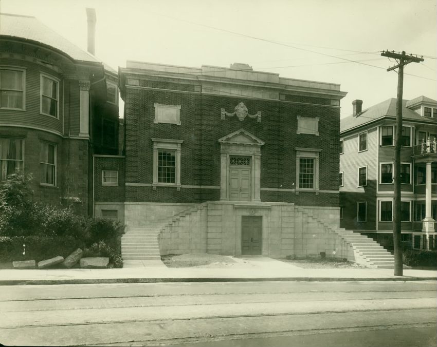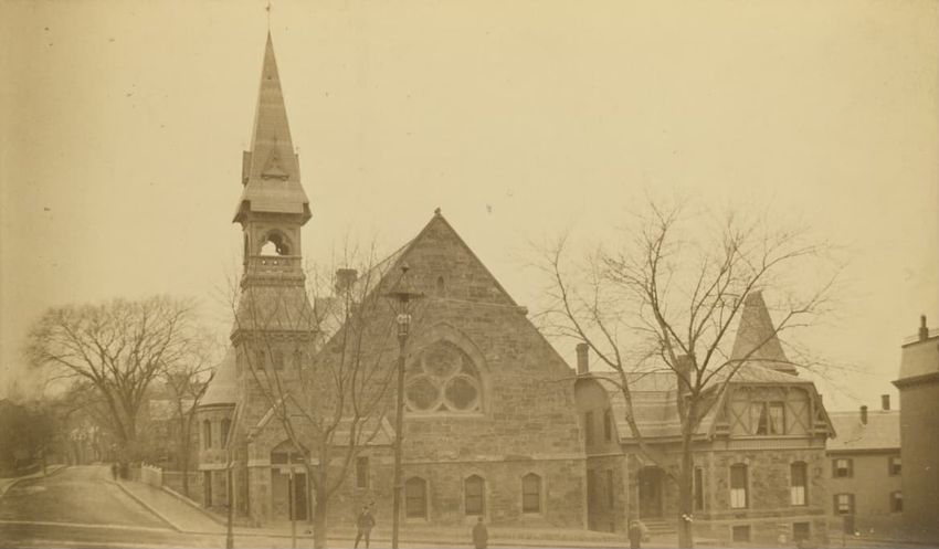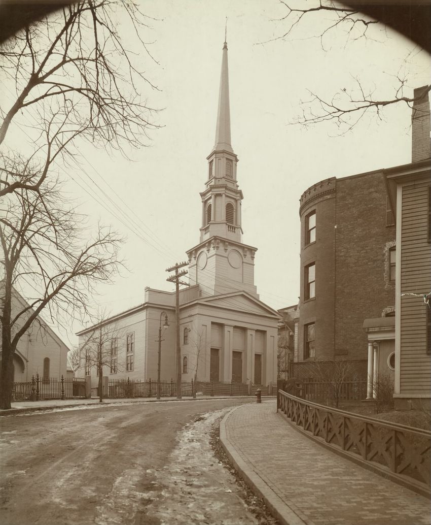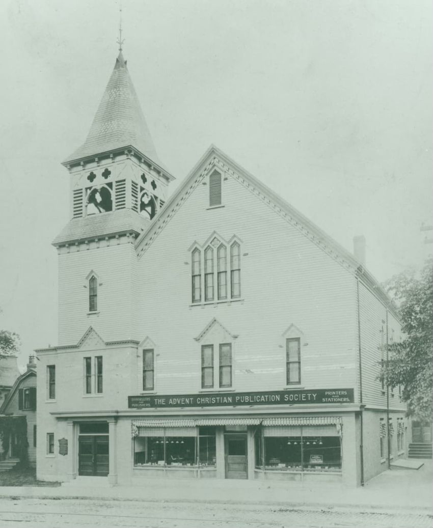 A view of the front façade of the Twelfth Baptist Church at 160 Warren Street in Roxbury, Massachusetts. This church appears to have housed several different congregations. The first floor sign reads the "Advent Christian Publication Society, booksellers, publishers, printers, and stationers." This ...