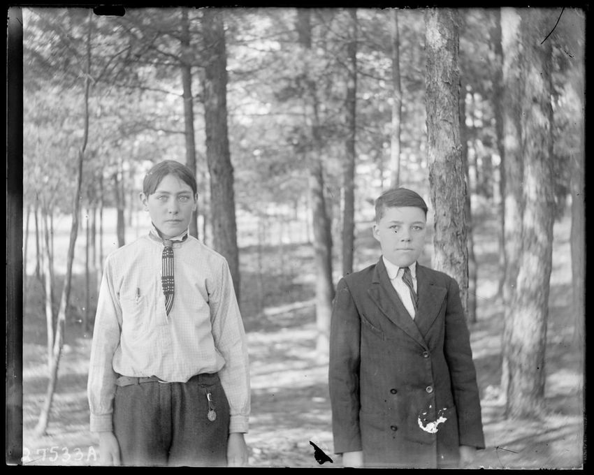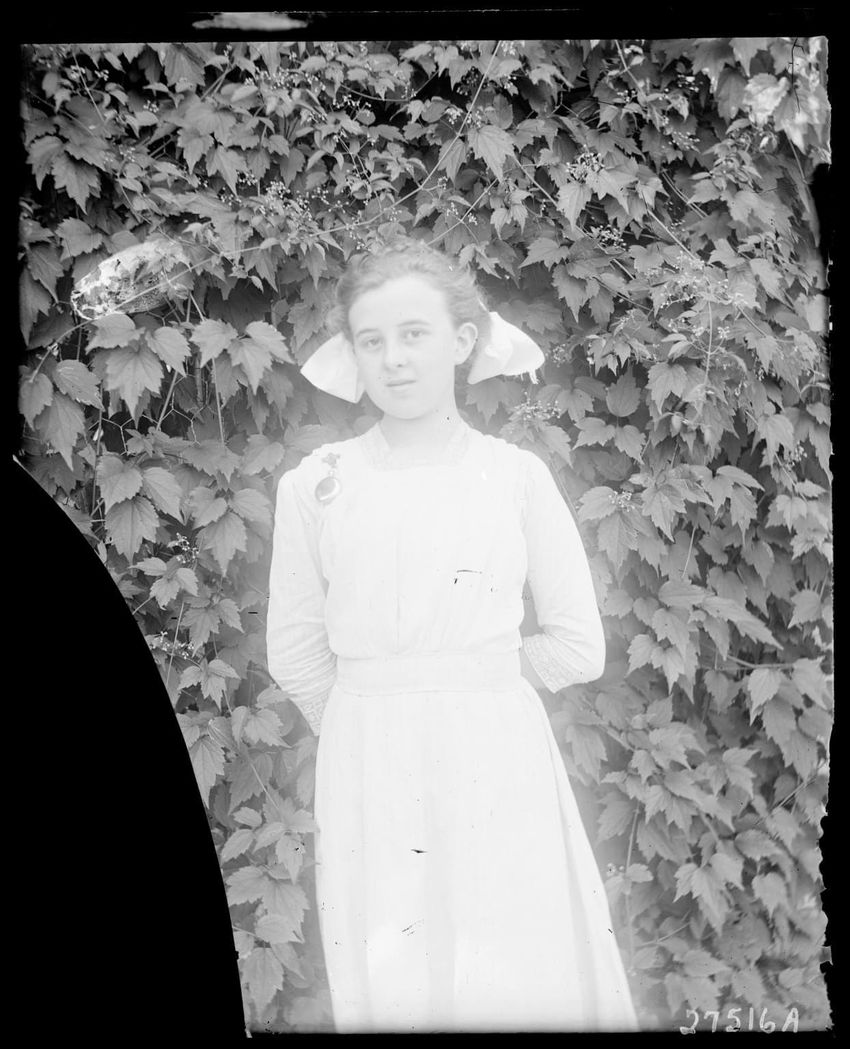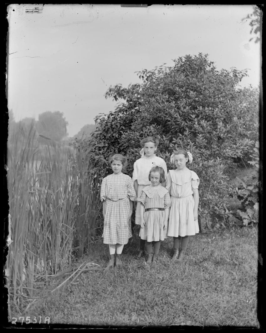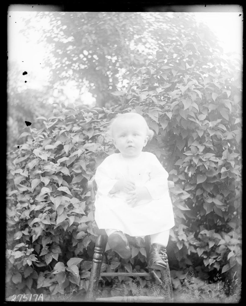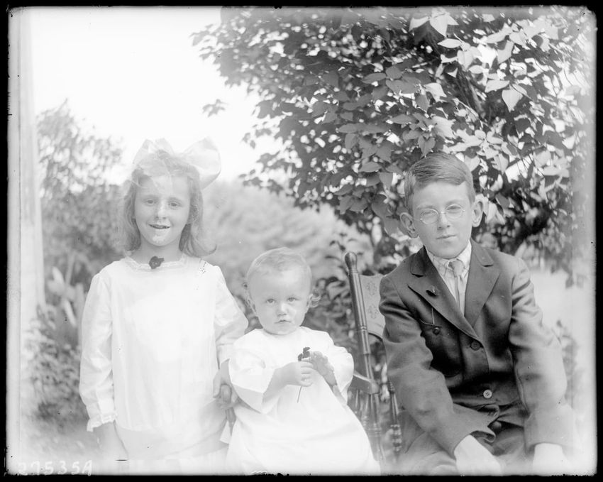 The image shows three children outdoors, posed in front of a leafy backdrop. On the left, a girl is standing, wearing a light-colored dress with a large bow in her hair. In the center, a younger child sits holding a small object. On the right, a boy in a suit is seated, with short hair and round gla...