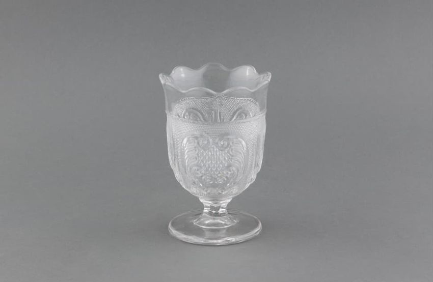 Glass spoon holder with a scalloped edge. Scroll and diamond pattern design alternating with a set of miter cuts.