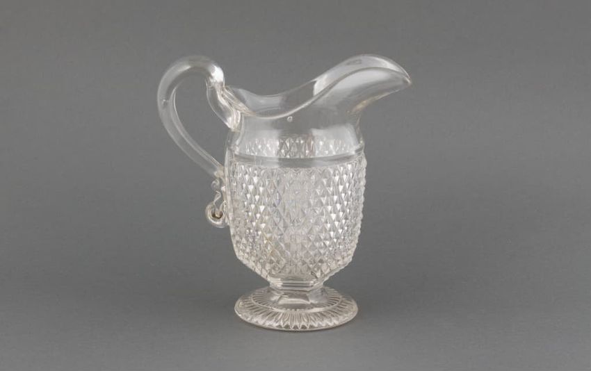 Pressed glass pitcher. Applied handle. Diamond pattern.