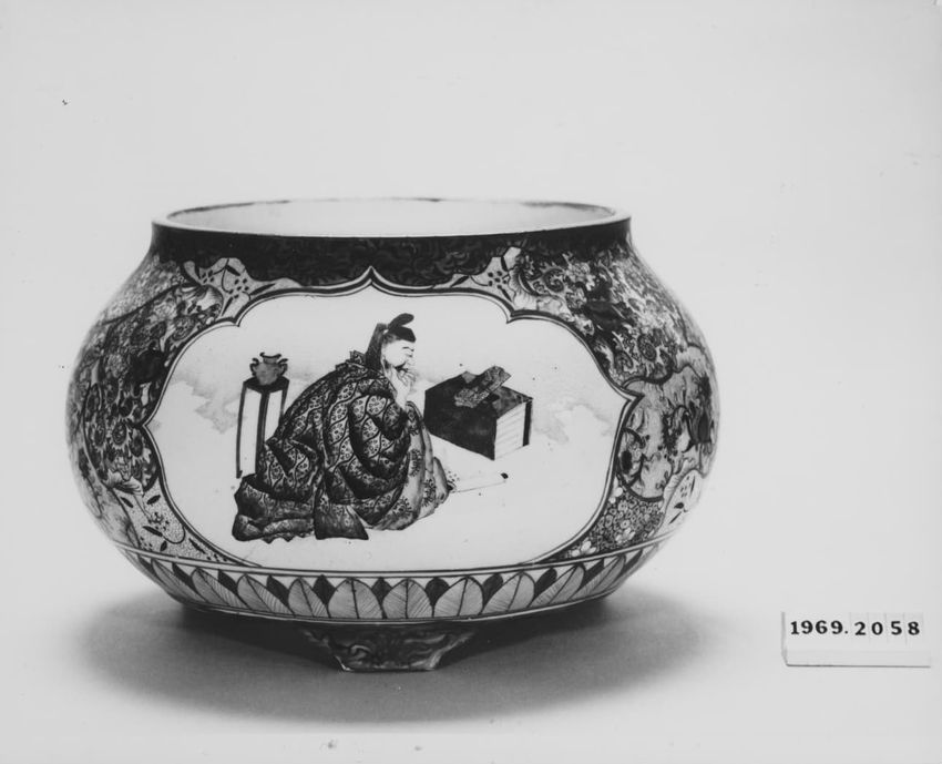 Red, white, gilded; globular, three feet; scholar reading and brocade