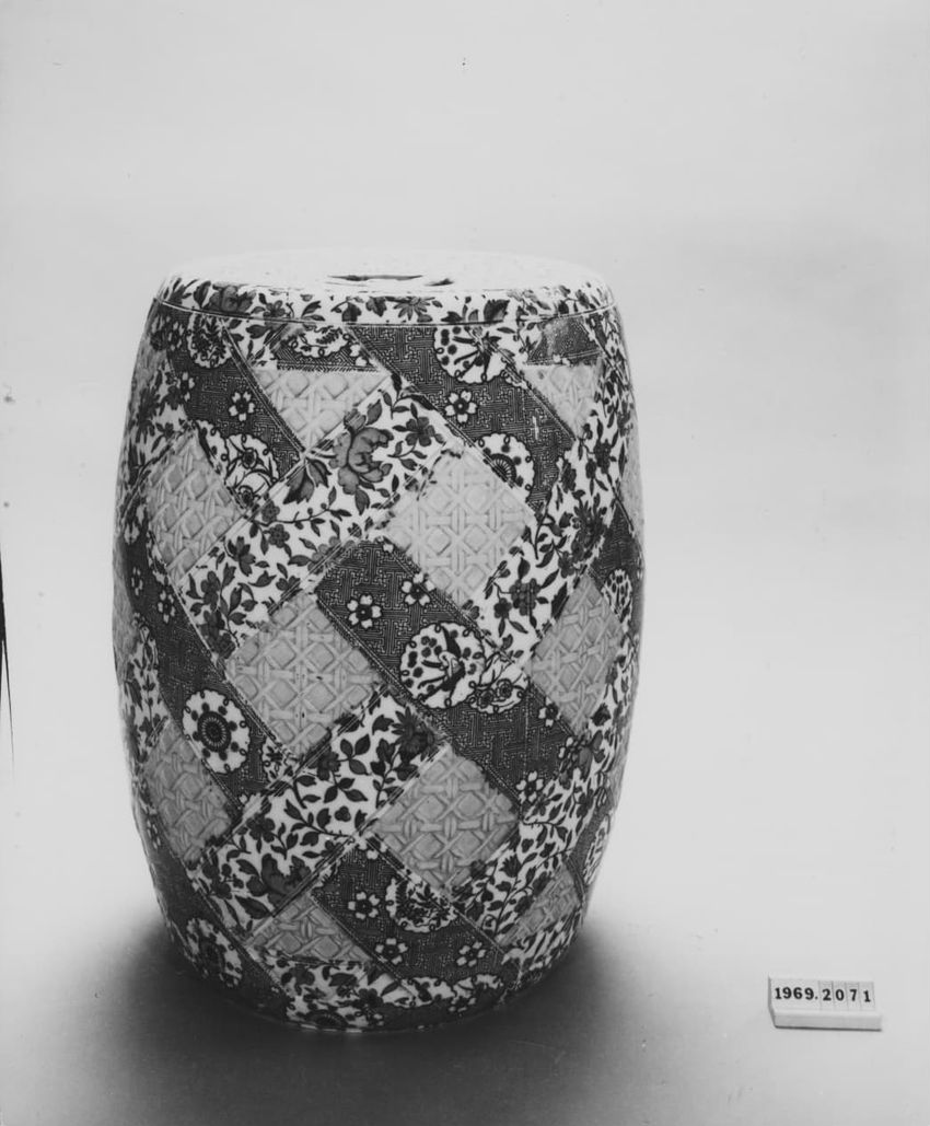 Blue, white, and yellow drum-shaped Chinese garden seat; Overall brocade and floral patterns.