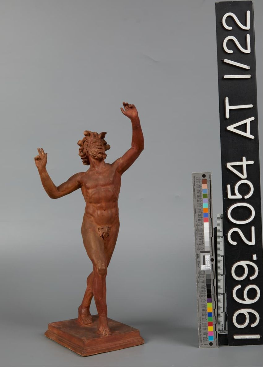 Burnt siena; standing male nude with tail and beard; arms raised
