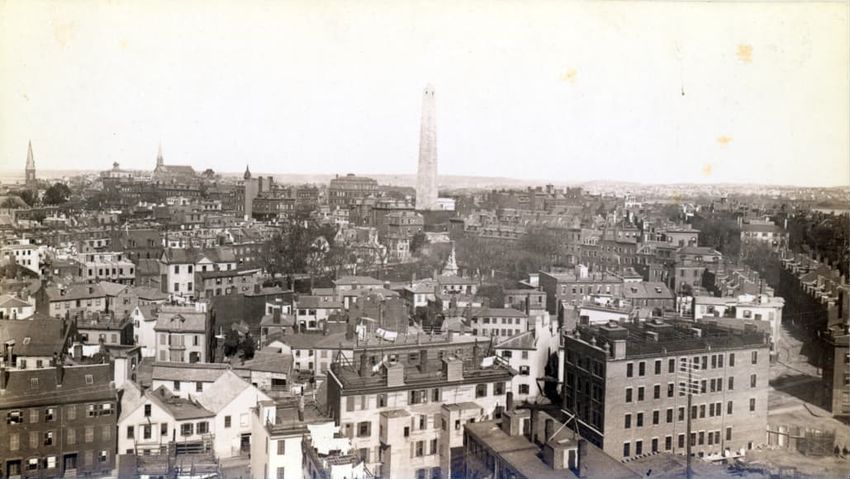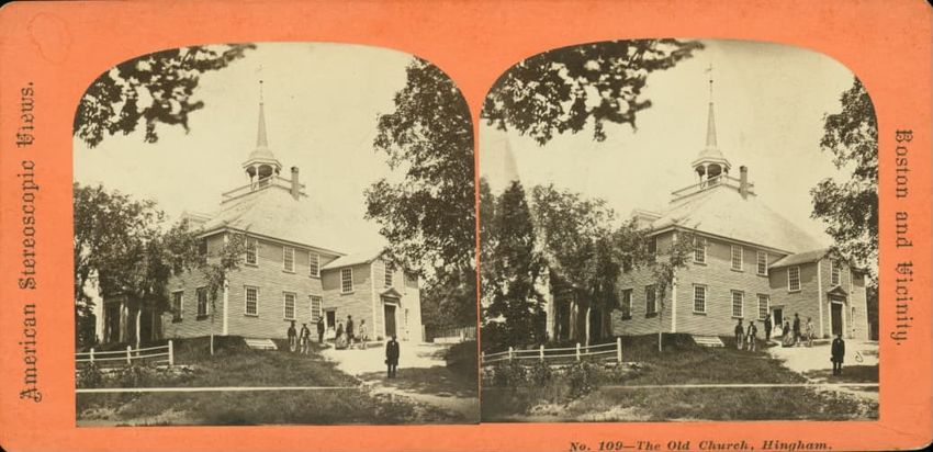 An interior view of the underside of the roof of the Old Ship Meeting House in Hingham, Massachusetts, the only surviving 17th century meeting house in the United States. The elements of the hip roof structure are visible, such as the curved struts, king post, rafters, and purlins. A set of stairs l...