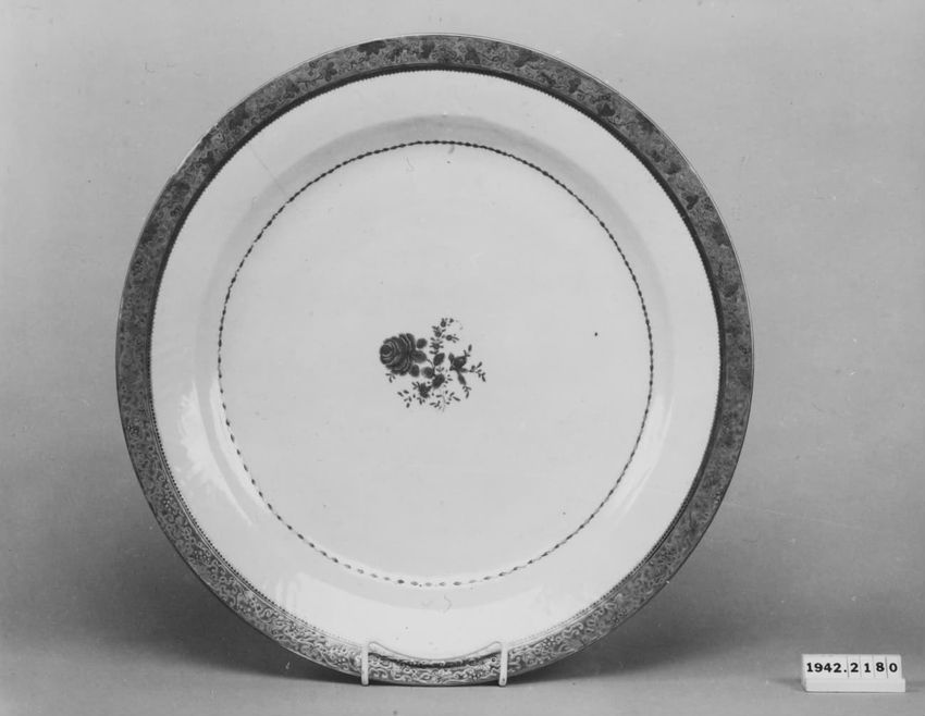 White, green, and gilt circular charger with a shallow well with a rose spray at the center and a grapevine border.