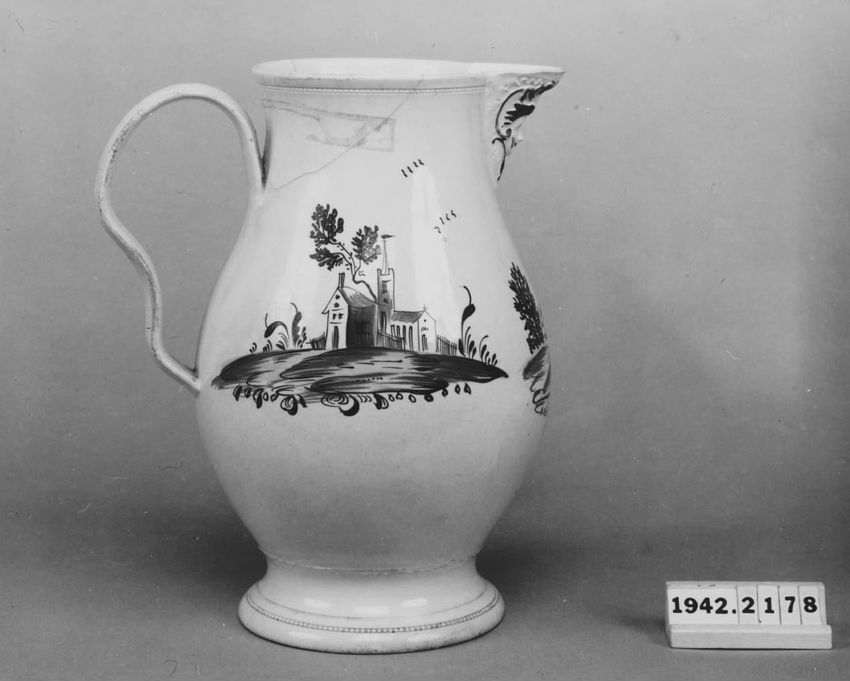 Cream, purple, orange, and yellow pitcher with a baluster-shaped body, handle, a mask spout, and a hunting scene.