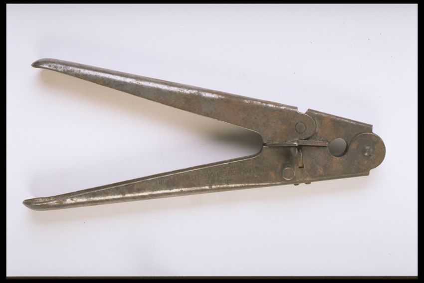 Part of tea set. White bulbous cylindrical shape w/ gilded band around neck and lid; gilded trefoil leaf and bud motif on handle terminus; lid at spout; ear-shaped handle w/ gilded band and brick design; handle of lid square looped.