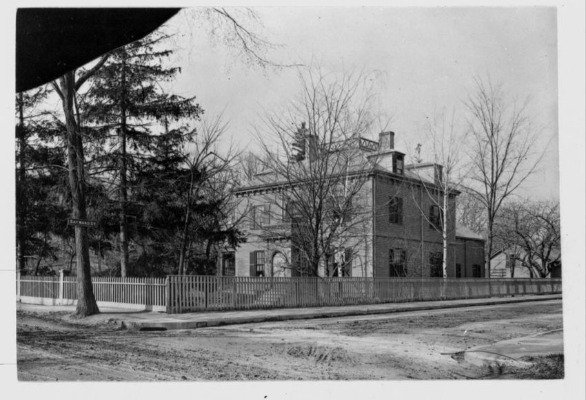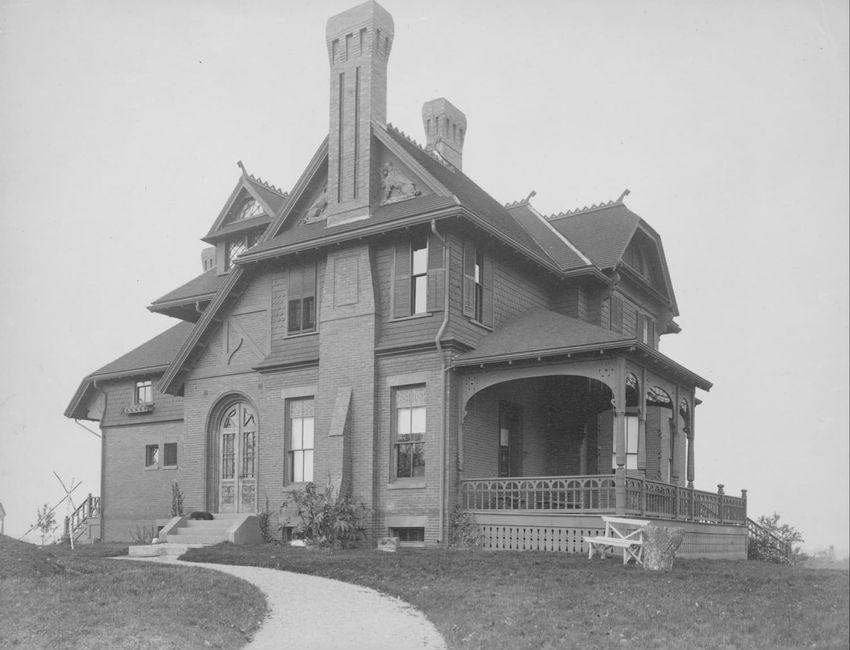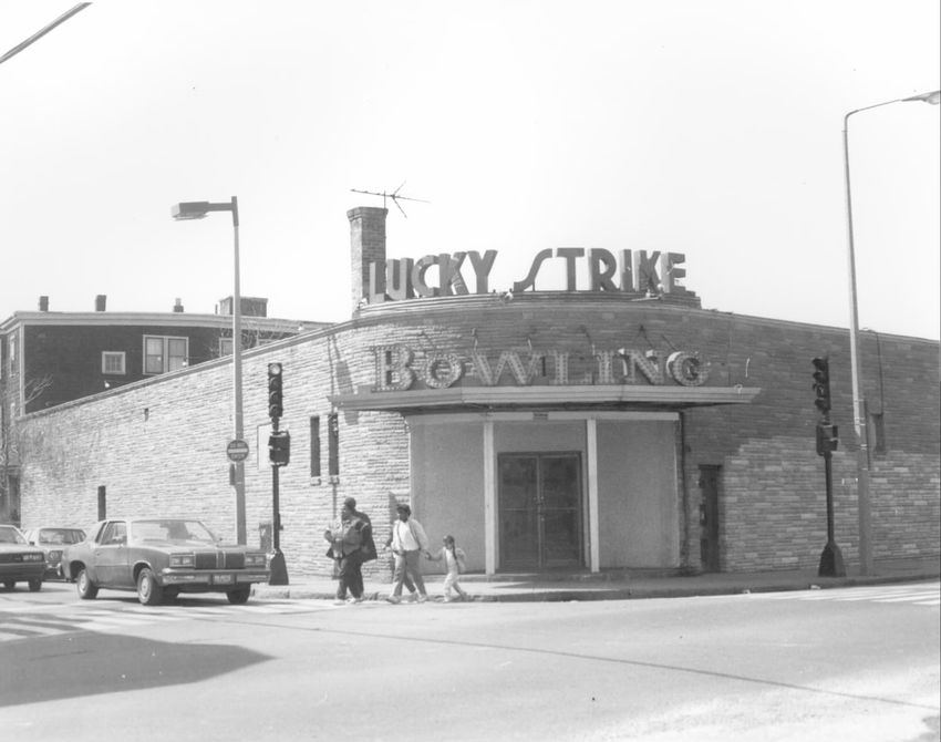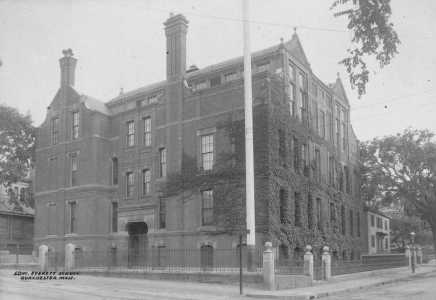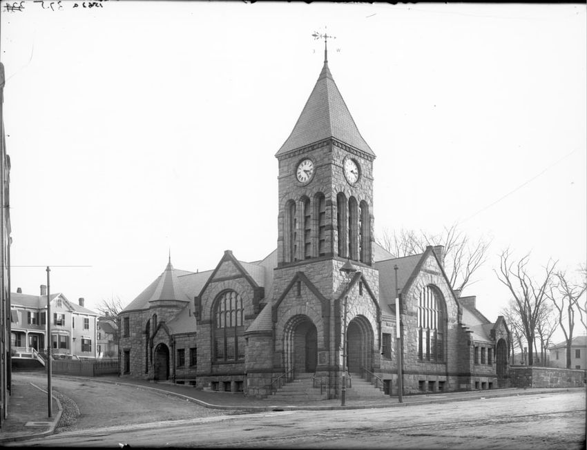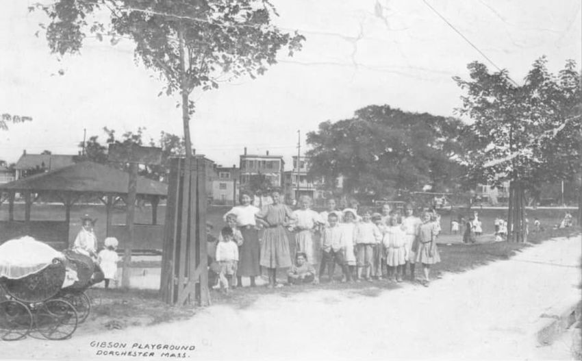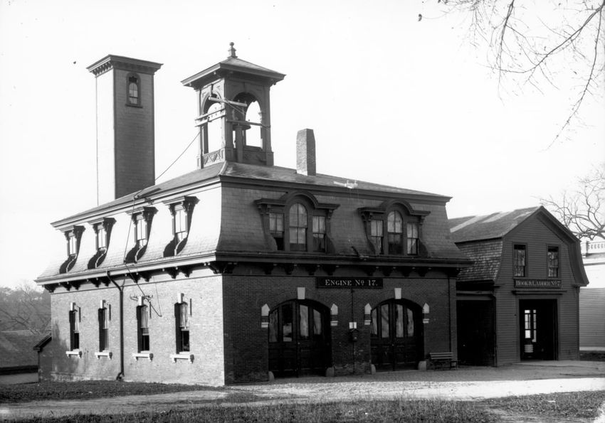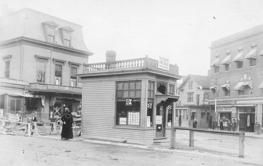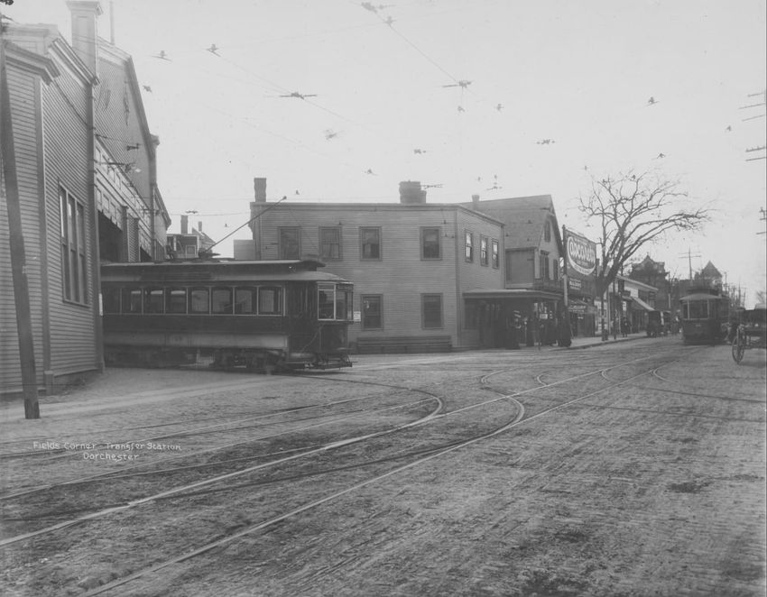 A trolley car, with an "Elevated" sign in front and sign on the side that partially reads "Hill," departs from the Fields Corner Transfer Station in Dorchester, Boston, Massachusetts. Another trolley car approaches the station from Park Street. The businesses on Park Street include the real estate a...