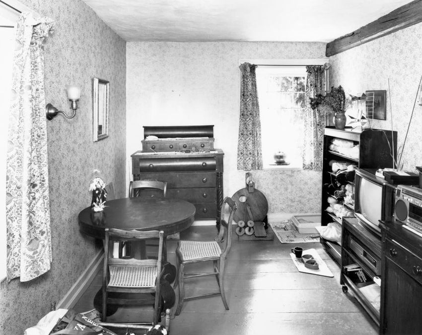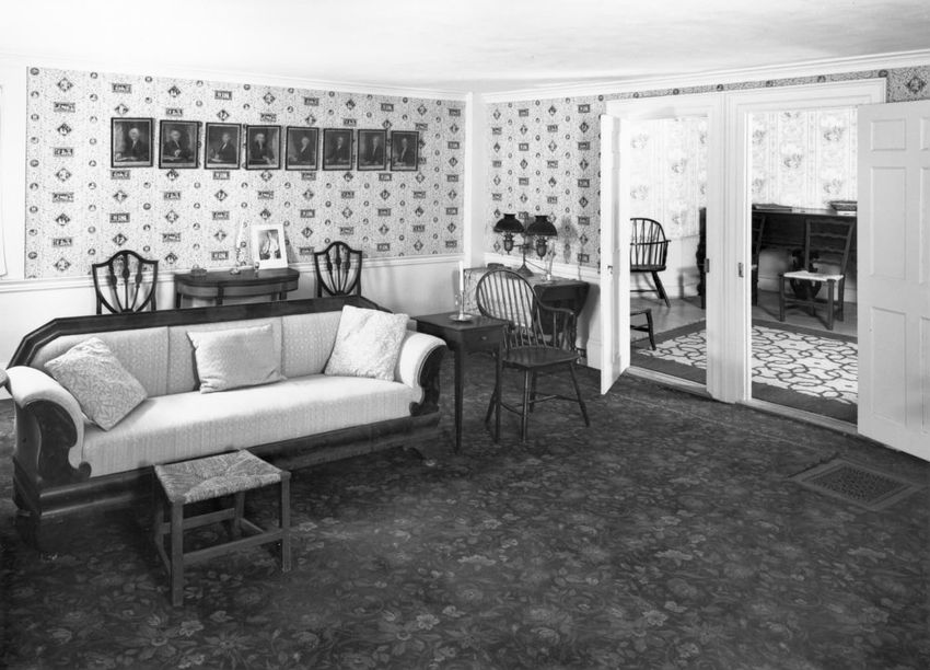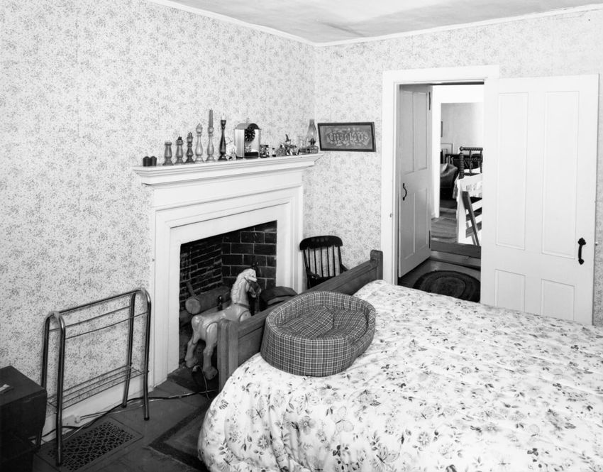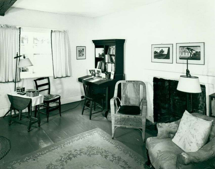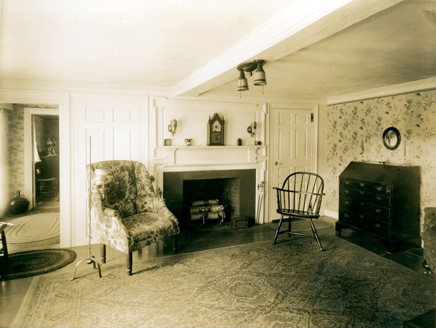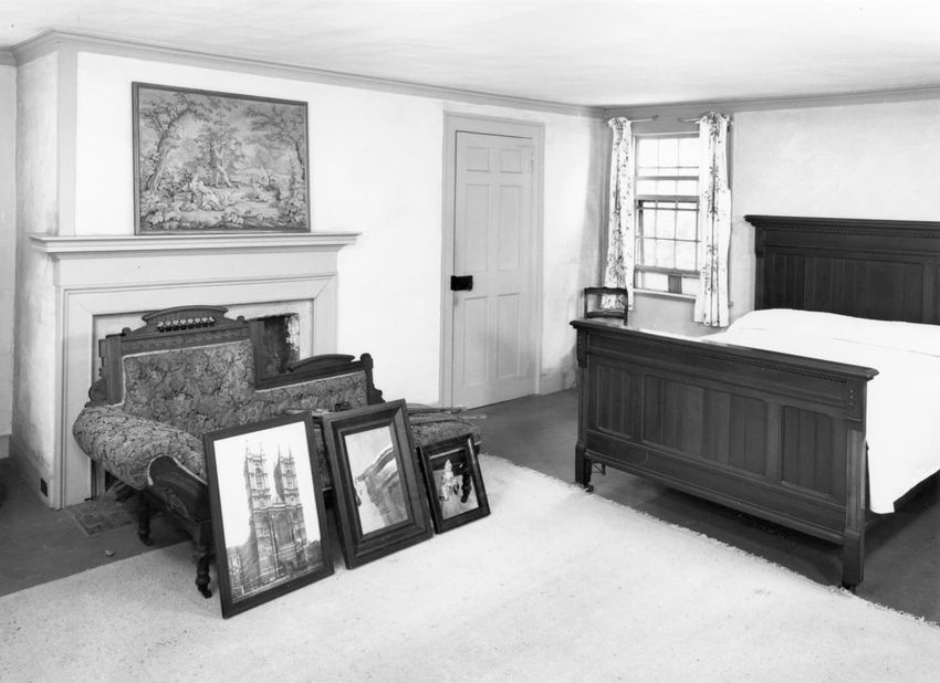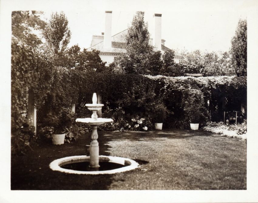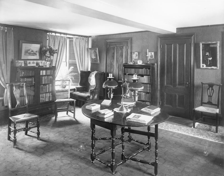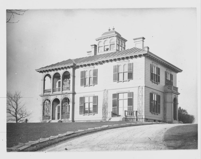 A trolley car, with an "Elevated" sign in front and sign on the side that partially reads "Hill," departs from the Fields Corner Transfer Station in Dorchester, Boston, Massachusetts. Another trolley car approaches the station from Park Street. The businesses on Park Street include the real estate a...