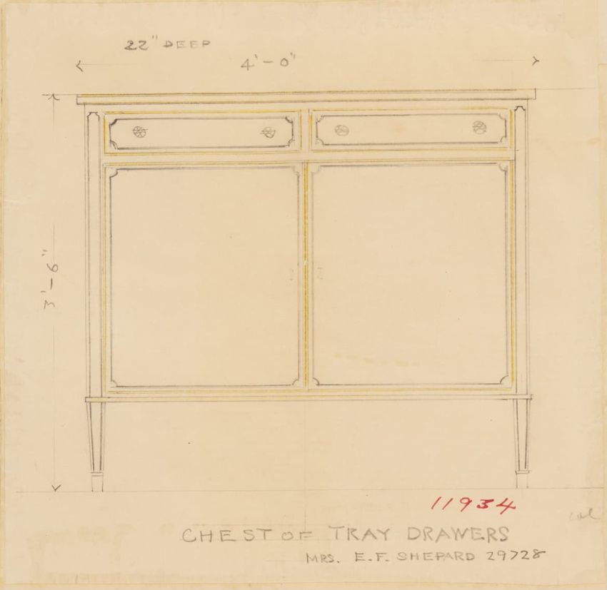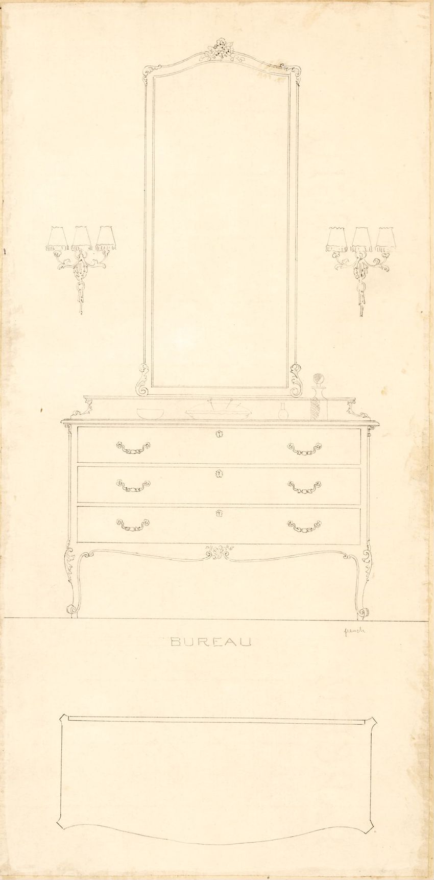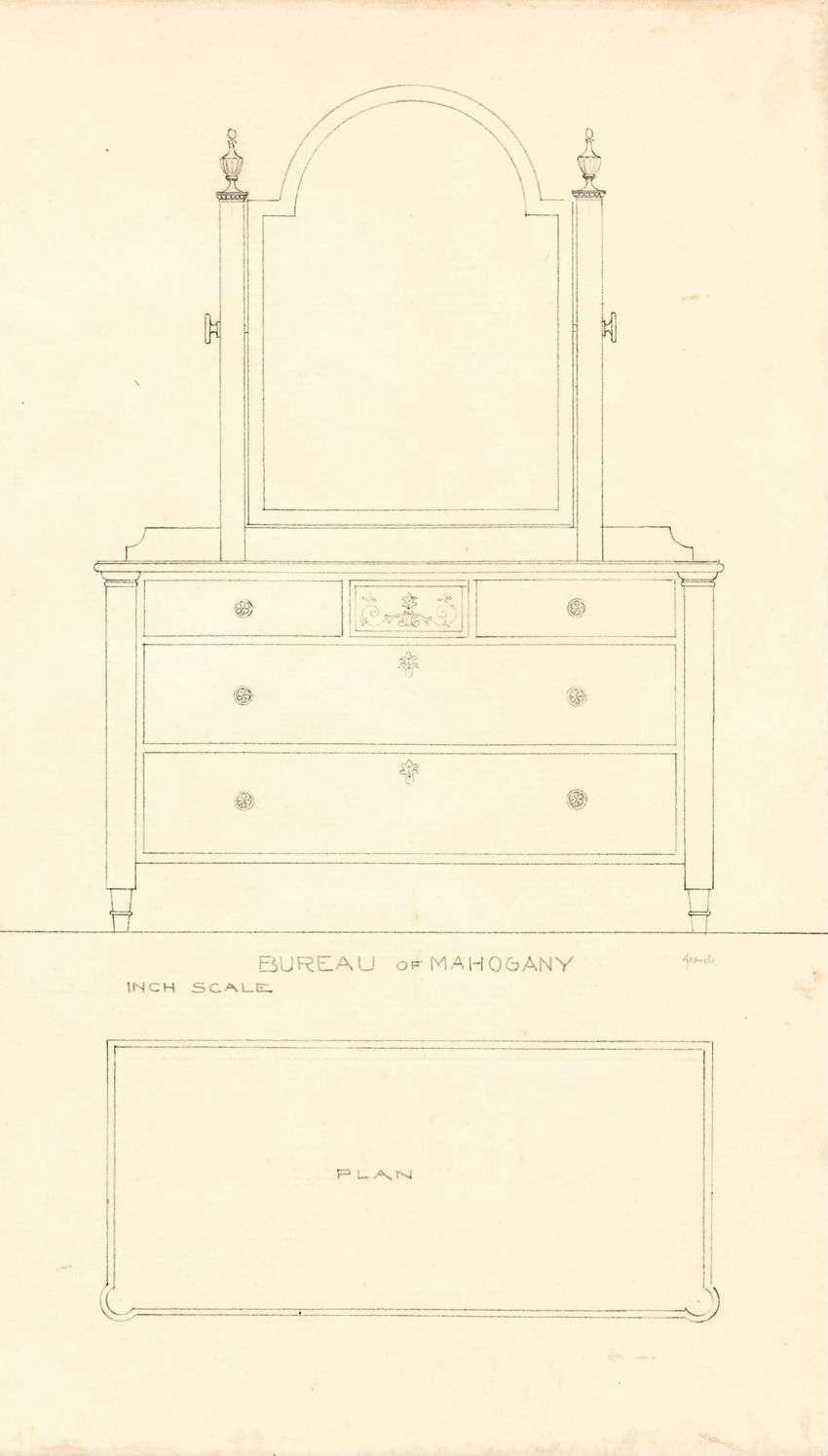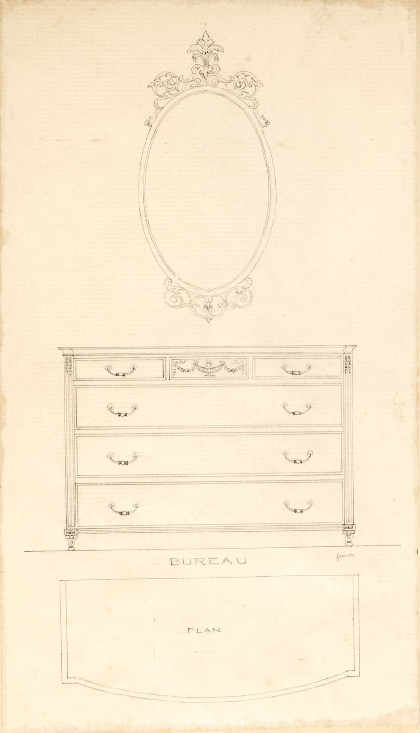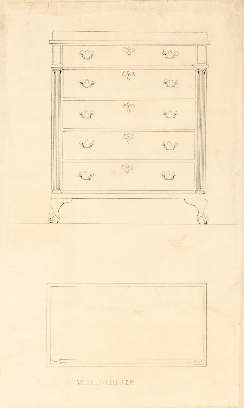 Untitled design drawing rendered in pencil on trace. Front view is shown; plan of top is also provided. Rectangular chest of drawers has overhanging top; five drawers with bail handles, bat-wing backplates and key escutcheons; projecting corner blocks at top; reeded columnar stiles; straight skirt; ...