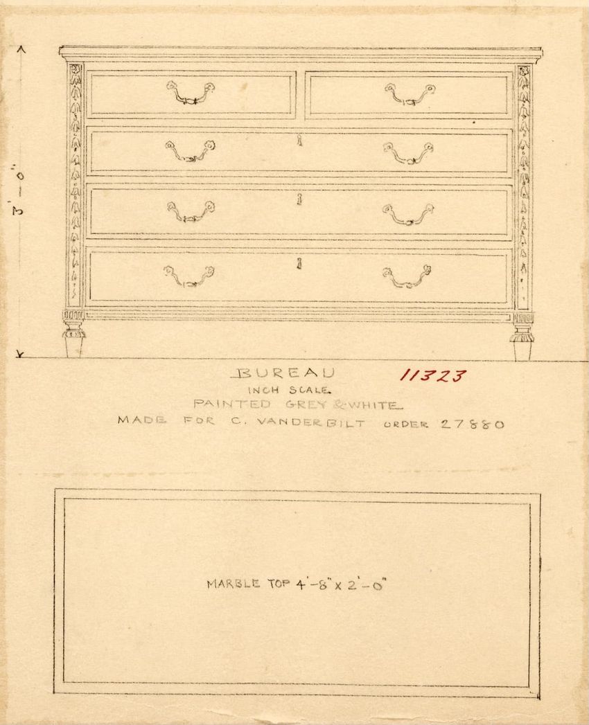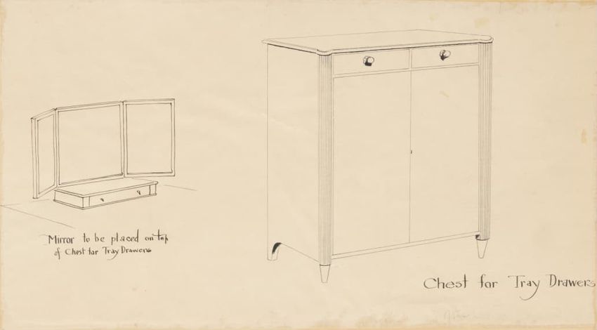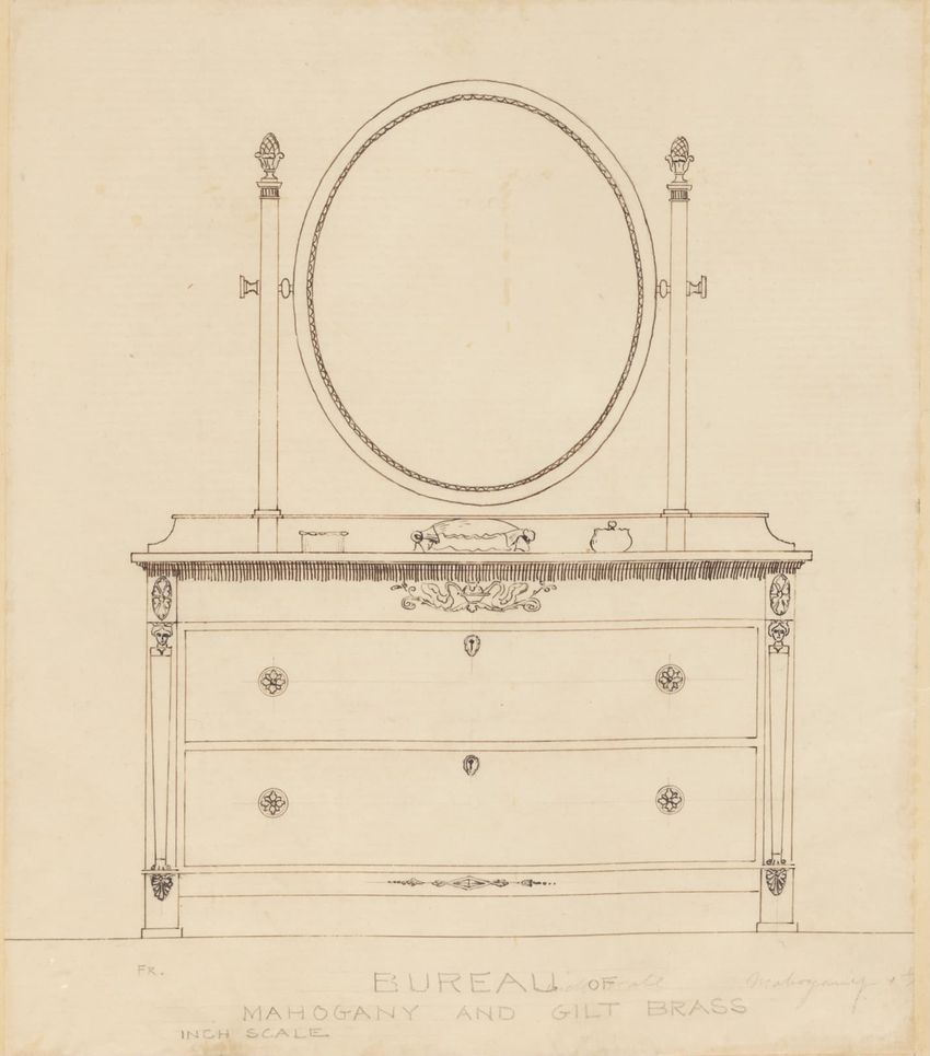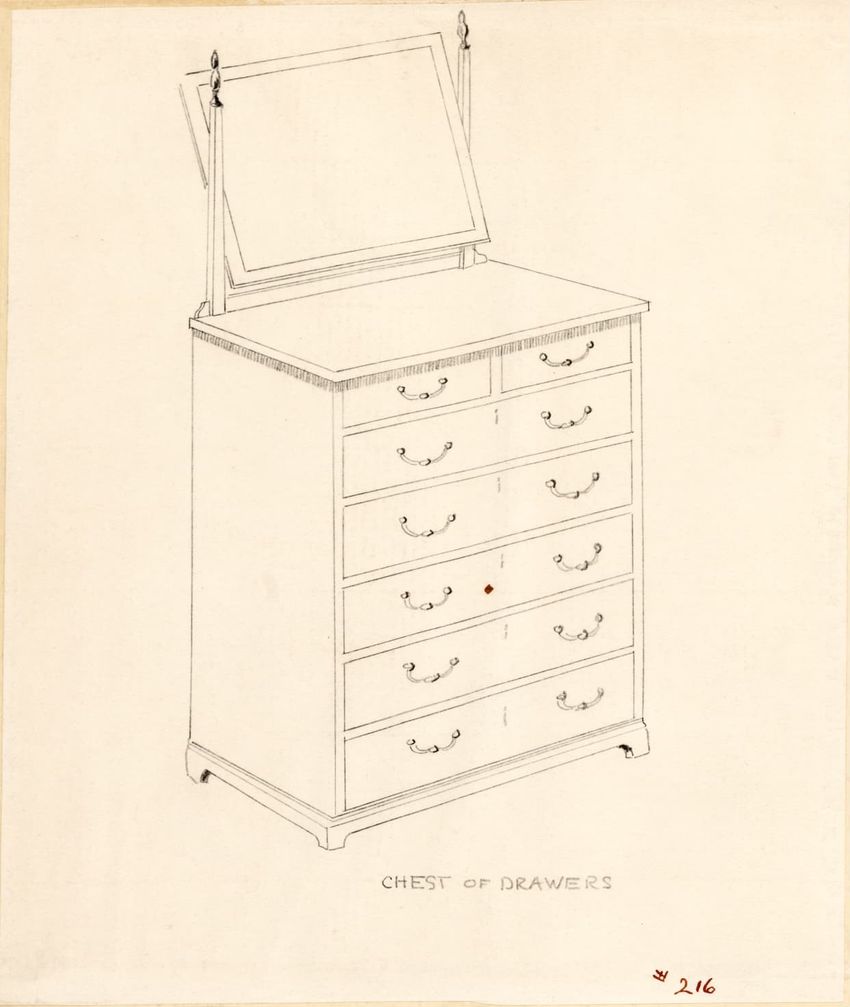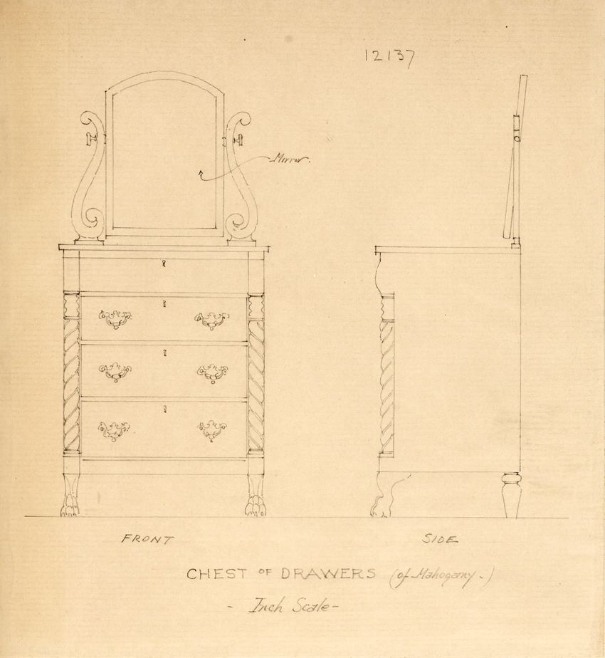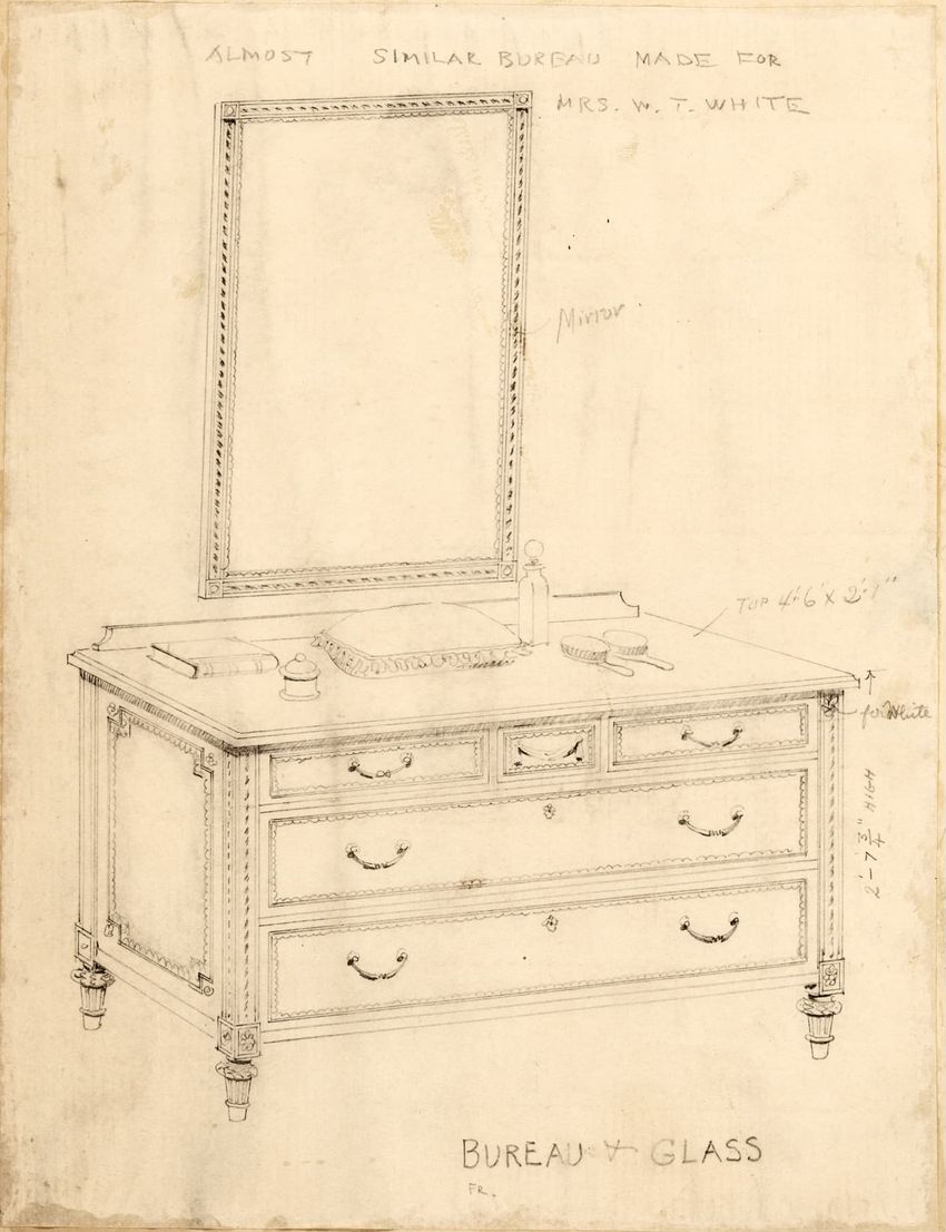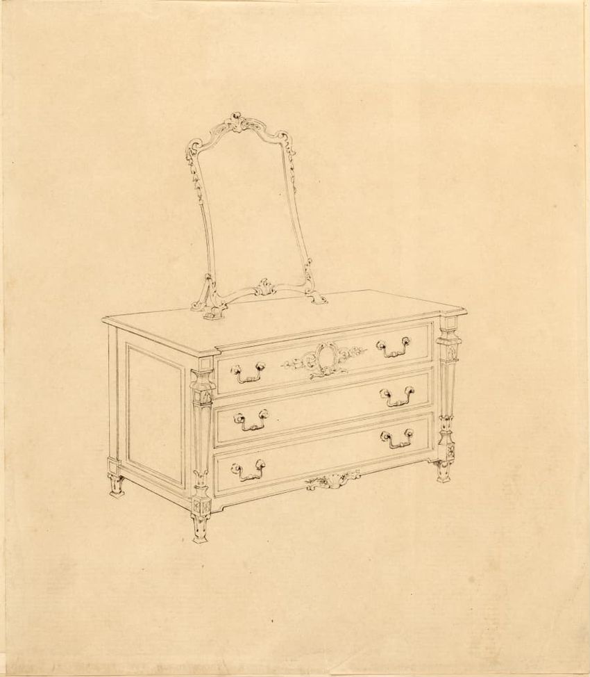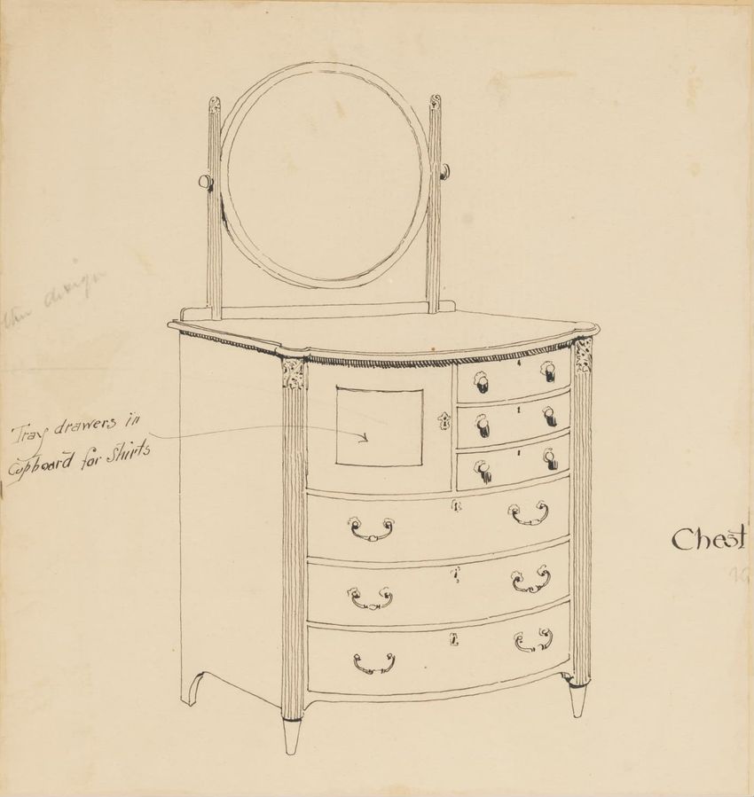 Untitled design drawing rendered in pencil on trace. Front view is shown; plan of top is also provided. Rectangular chest of drawers has overhanging top; five drawers with bail handles, bat-wing backplates and key escutcheons; projecting corner blocks at top; reeded columnar stiles; straight skirt; ...