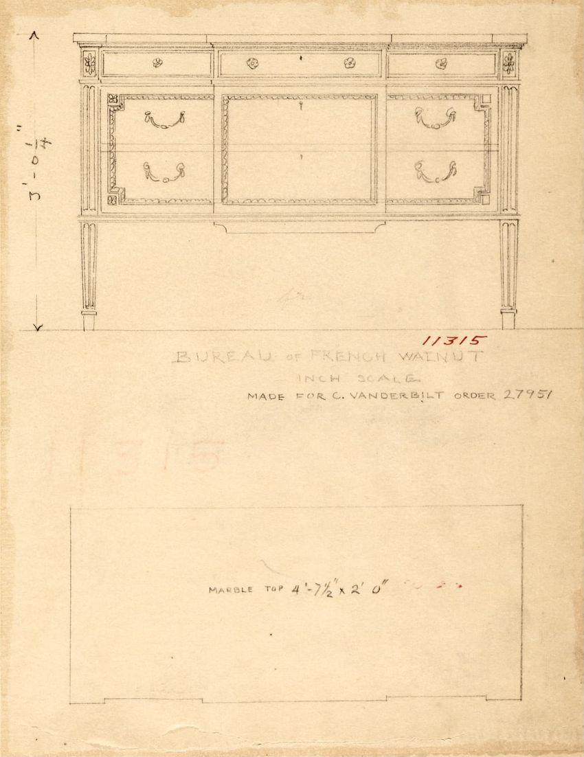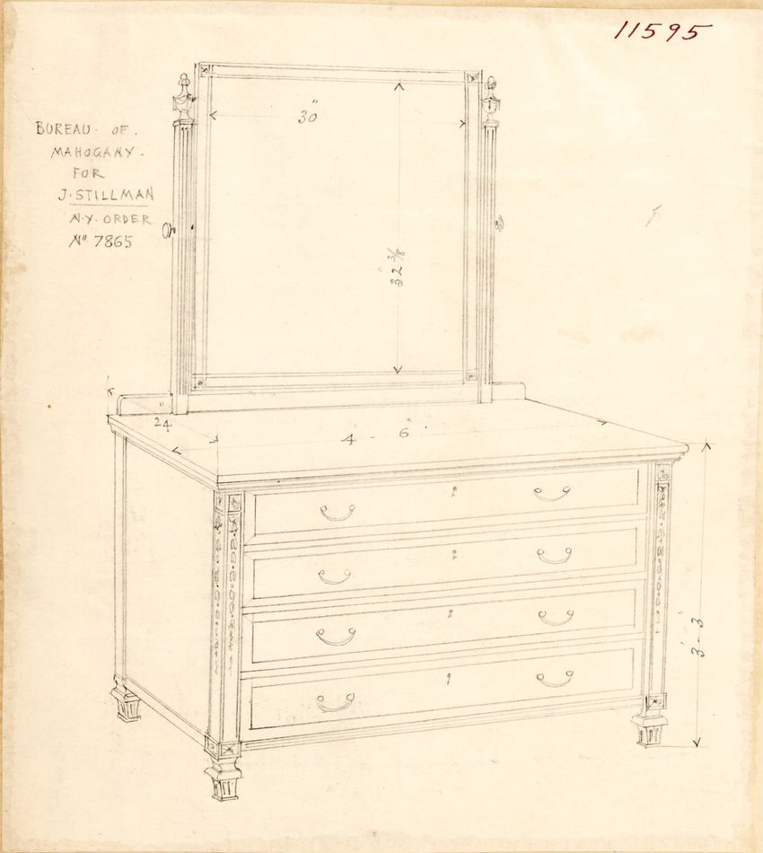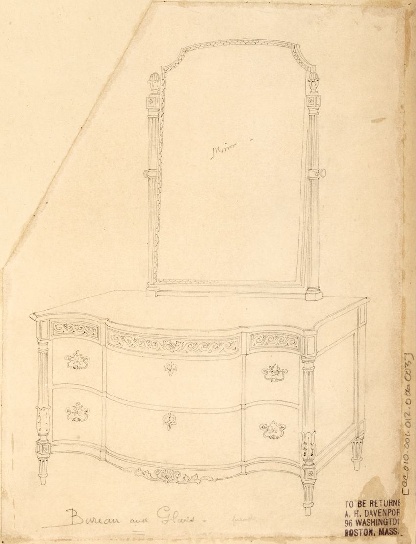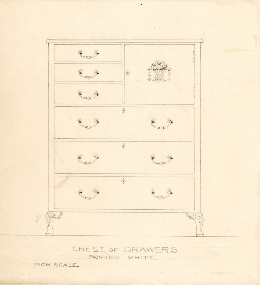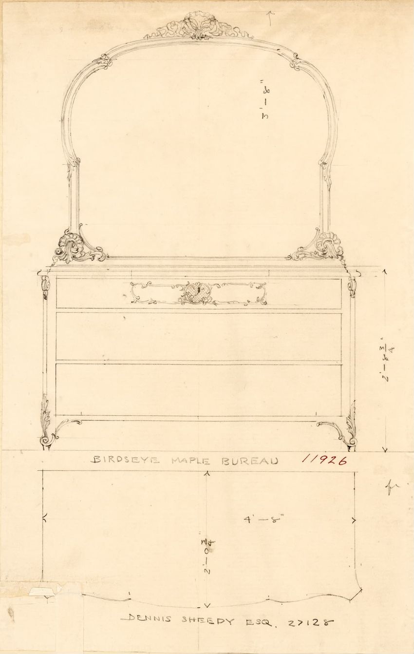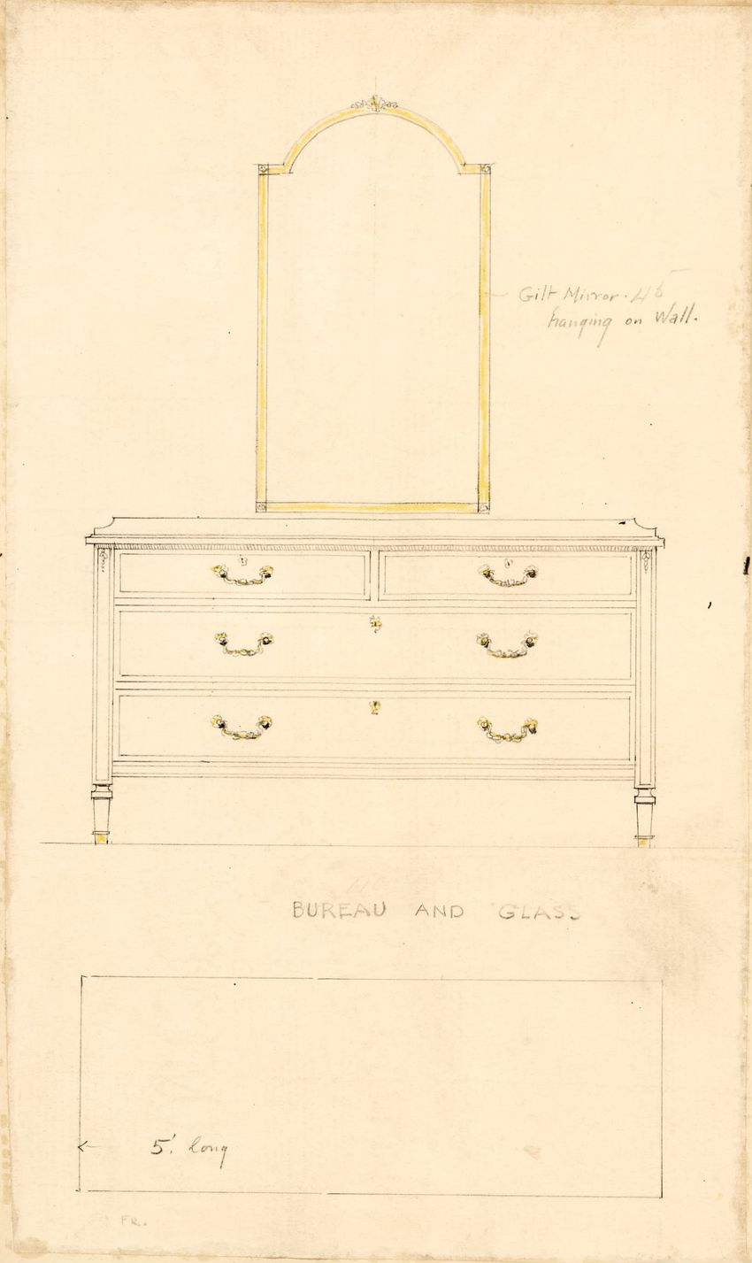 Untitled design drawing rendered in pencil on trace. Front view is shown; plan of top is also provided. Rectangular chest of drawers has overhanging top; five drawers with bail handles, bat-wing backplates and key escutcheons; projecting corner blocks at top; reeded columnar stiles; straight skirt; ...