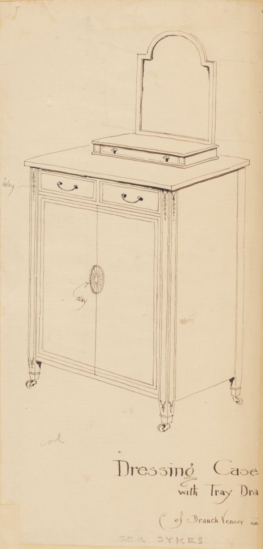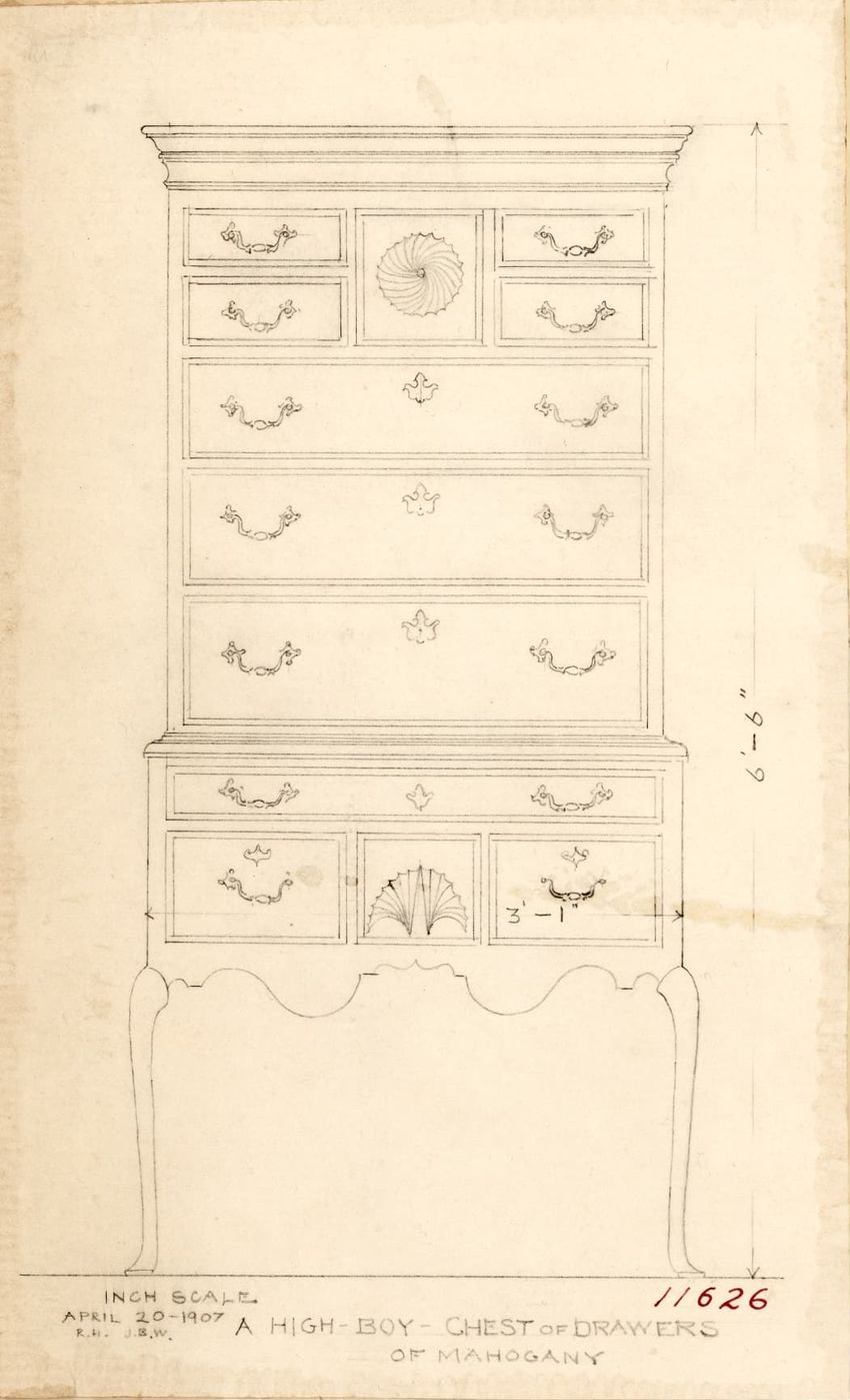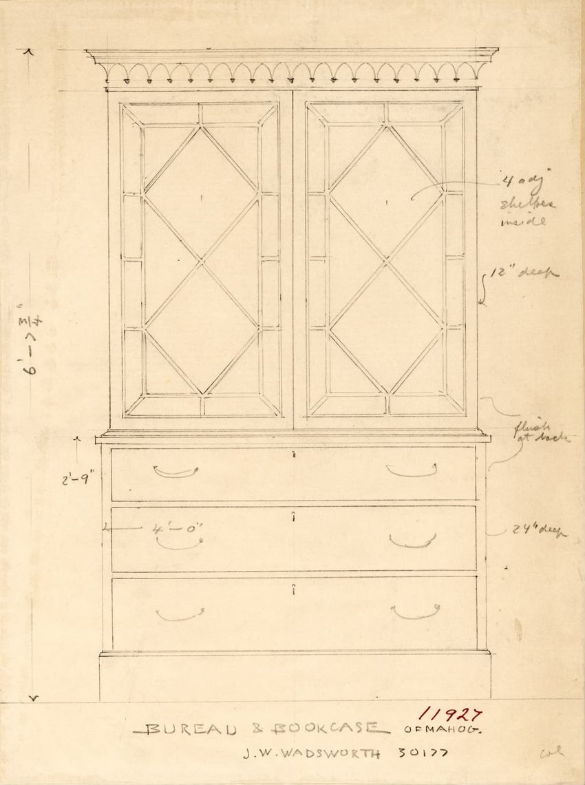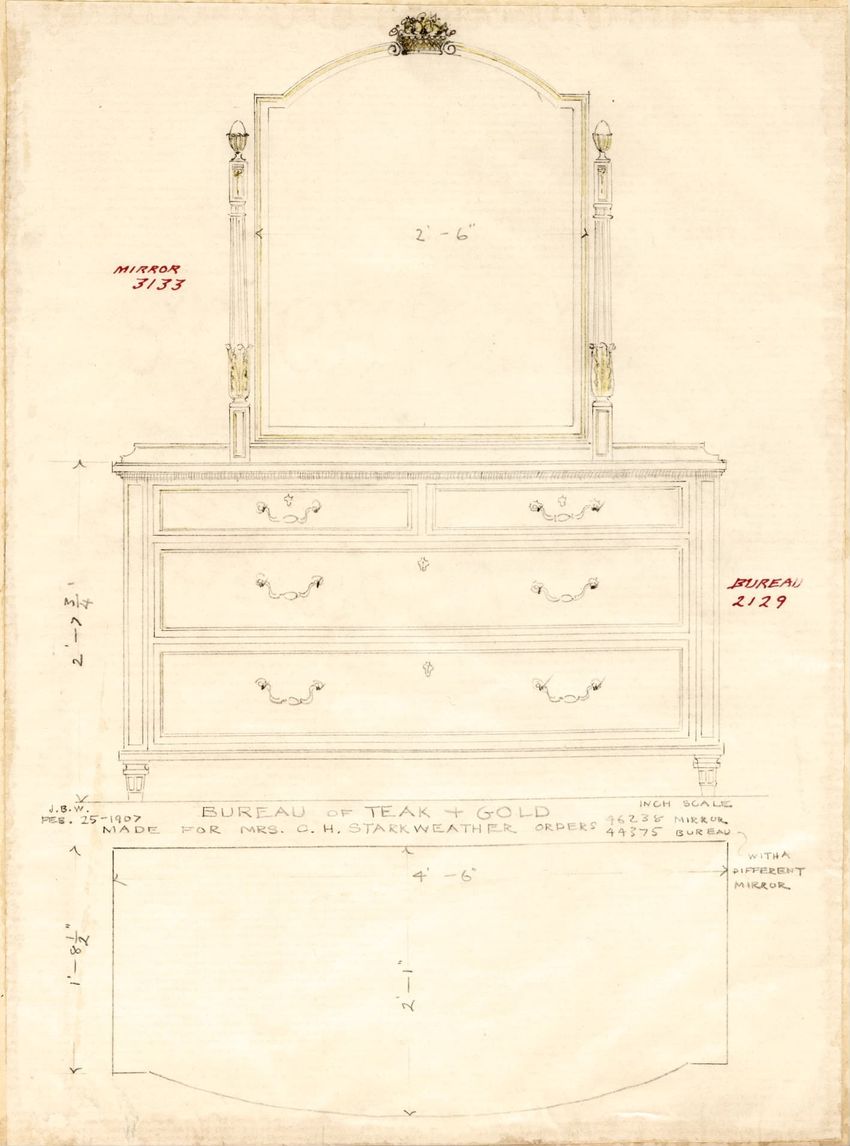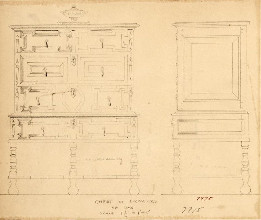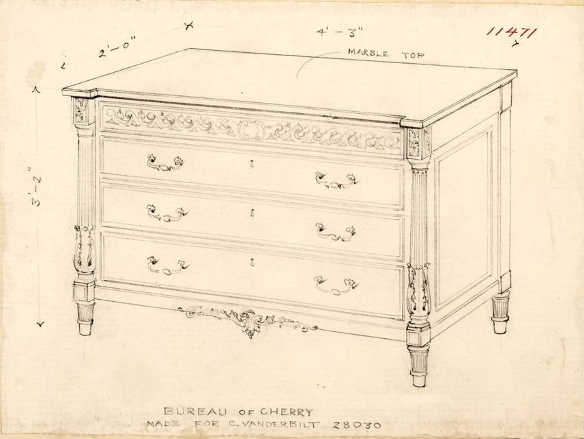 Untitled design drawing rendered in pencil on trace. Front view is shown; plan of top is also provided. Rectangular chest of drawers has overhanging top; five drawers with bail handles, bat-wing backplates and key escutcheons; projecting corner blocks at top; reeded columnar stiles; straight skirt; ...