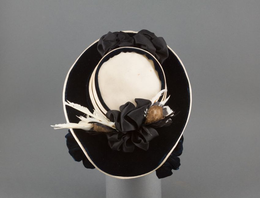 Navy blue velvet hat with scalloped brim, trimmed in white silk satin piping and navy blue velvet rosettes, black satin rosettes with black, white, and gray feathers on buckram foundation and white lining.