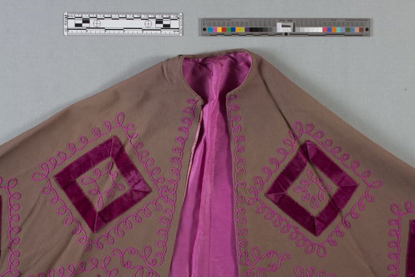 buckram, feather (material), stitching, satin, silk (textile), velvet (fabric weave)