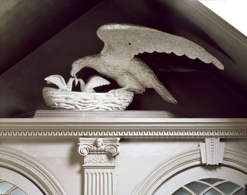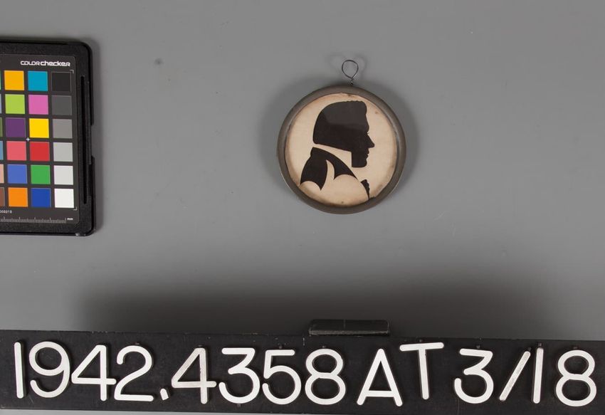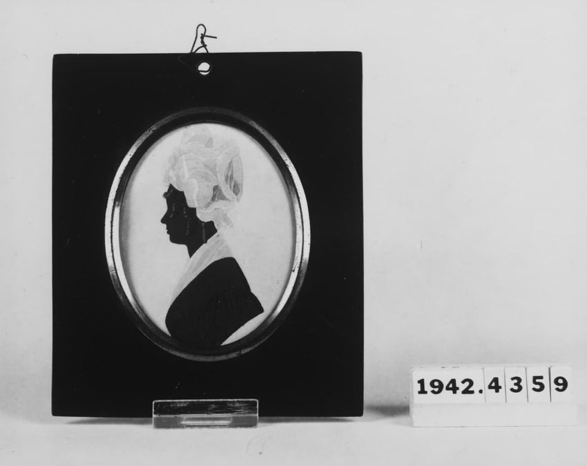 Oval pasteboard bandbox (A) and lid (B). Box and lid are covered with wallpaper. Motif on top of lid is a stylized tree and rim of lid has vertical stripes. Box has stripes, geometric motifs, and bird among foliage. Block printed in pink, red, green and white on dark yellow ground. Handstitched repa...