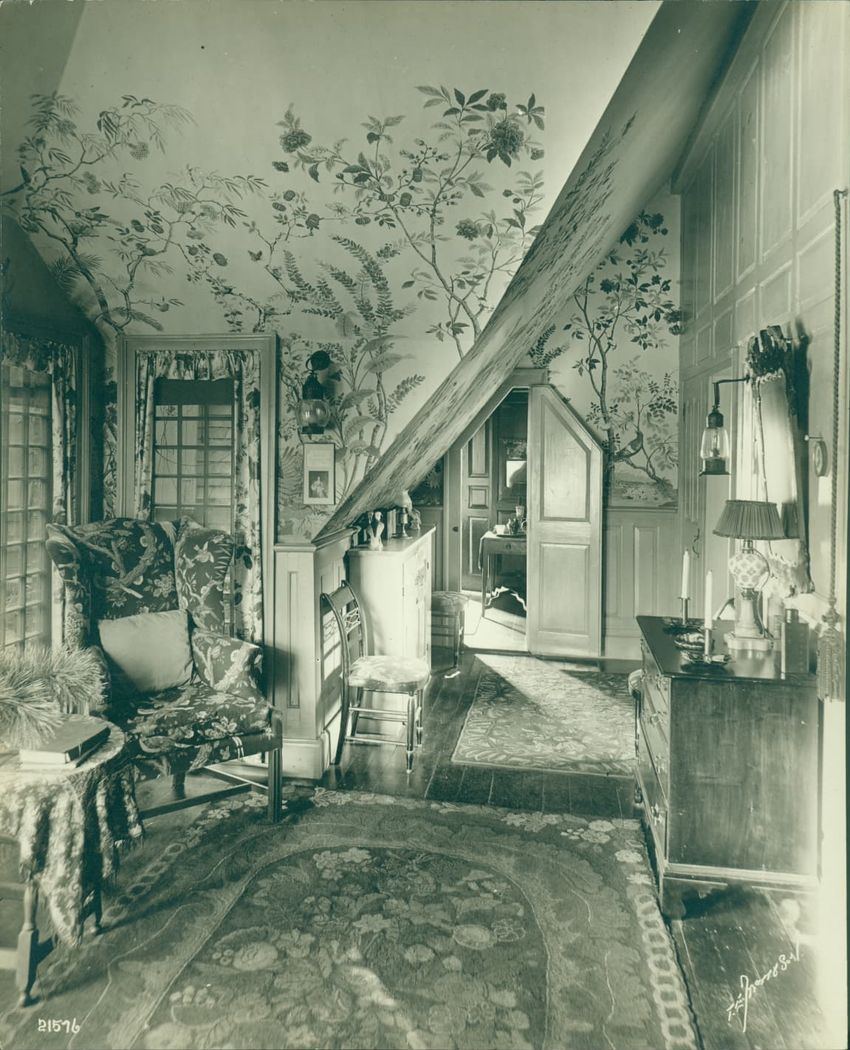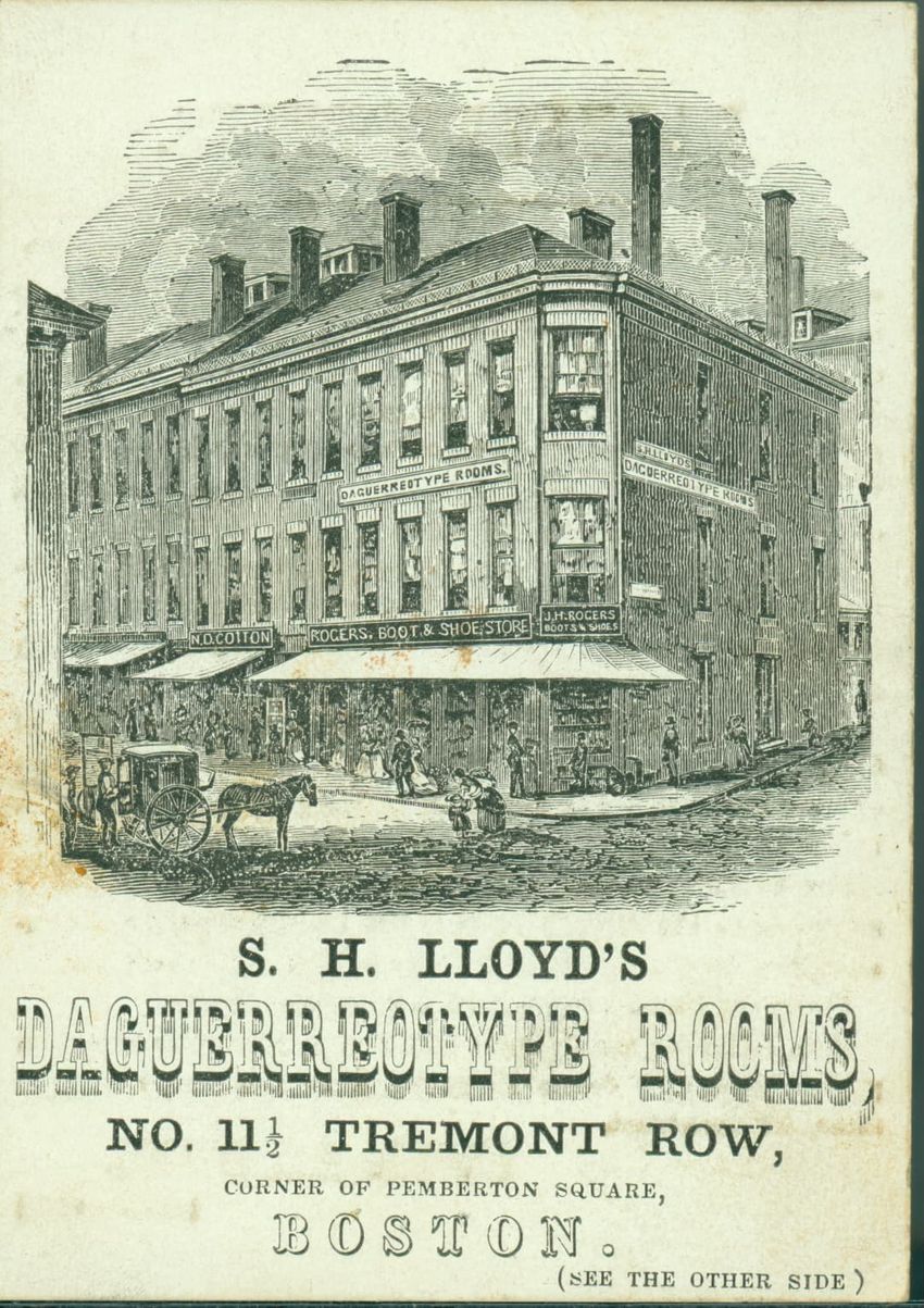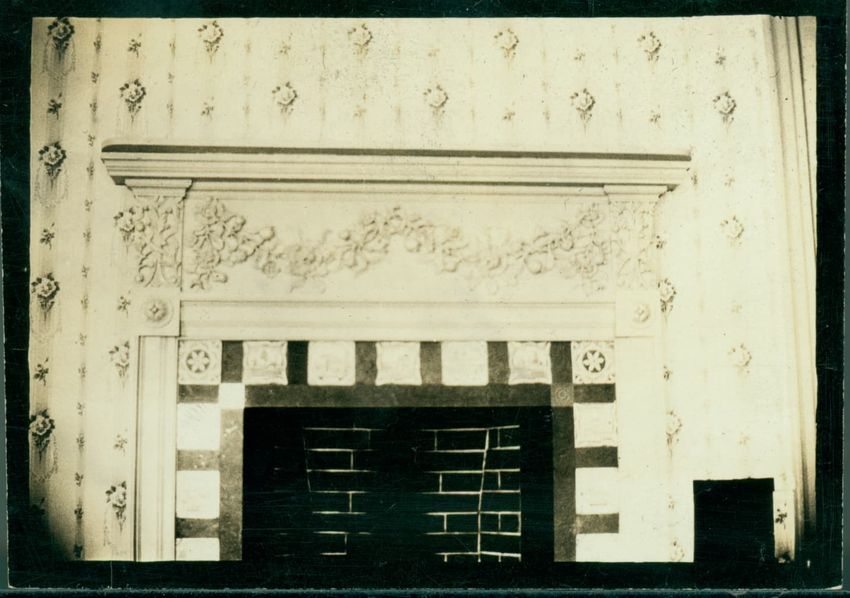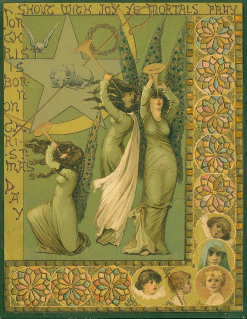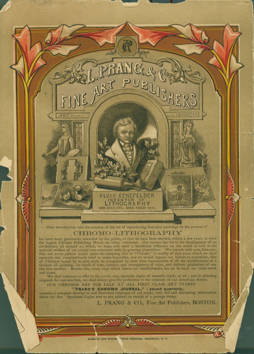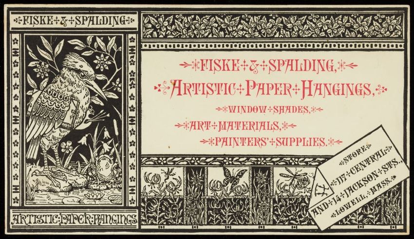 The image features three bands of intricate floral patterns. The card advertises that the company can furnish "brown, buff, and white blanks, satins, grounds, and gold papers, borders, and mouldings, window shades, fixtures, and trimmings. Any colorings to order." The company operated both wholesale...