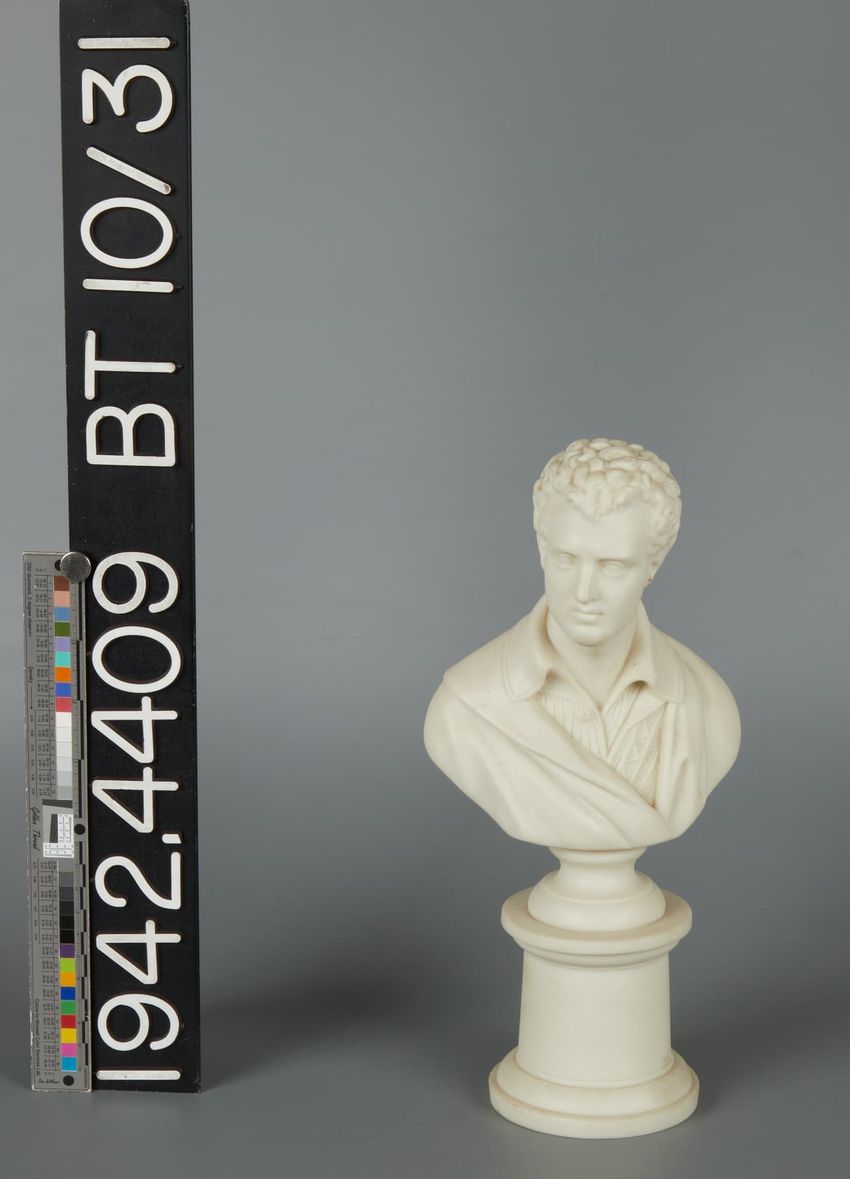 White, blue, and green figurine of thee men in naval uniforms. "Death of Nelson" is written in script on the base.
