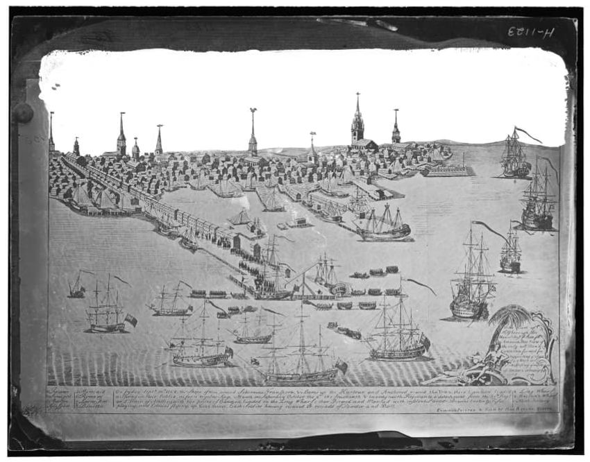 The illustration depicts Old Boston Harbor in Boston, Massachusetts, showcasing a bustling scene with numerous sailing ships in the harbor. Beyond the water, there is a densely built-up area with many buildings and several prominent church steeples rising above the town. The foreground includes deta...