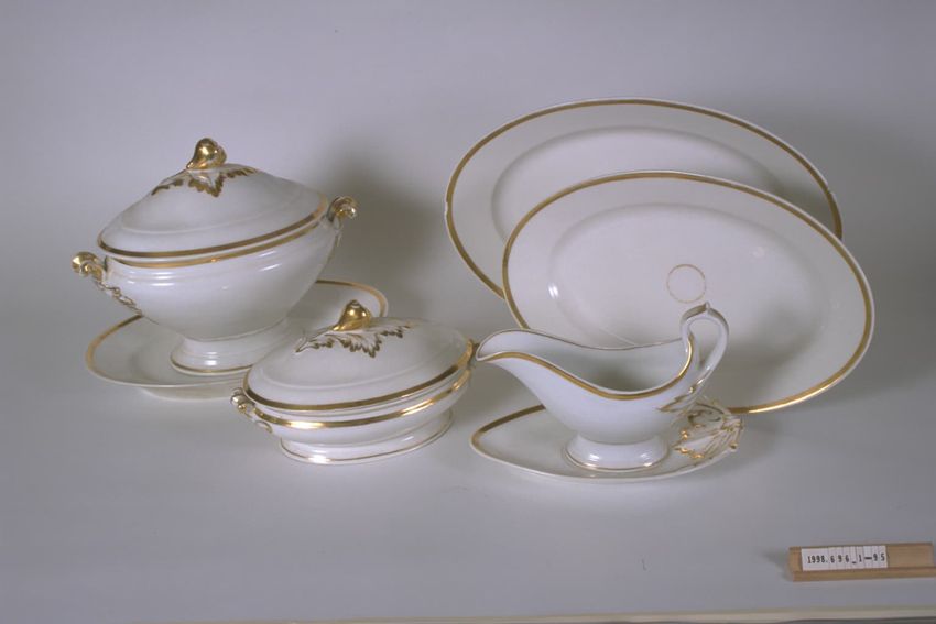 Punch set for 12 in radiating raised square pattern; stemware has stippled ball stem: punch bowl and liner, 24 punch cups, 12 luncheon plates, 12 sherbets, 12 water goblets, 8 juice glasses, plate and footed bowl; ladle may not be original to set.