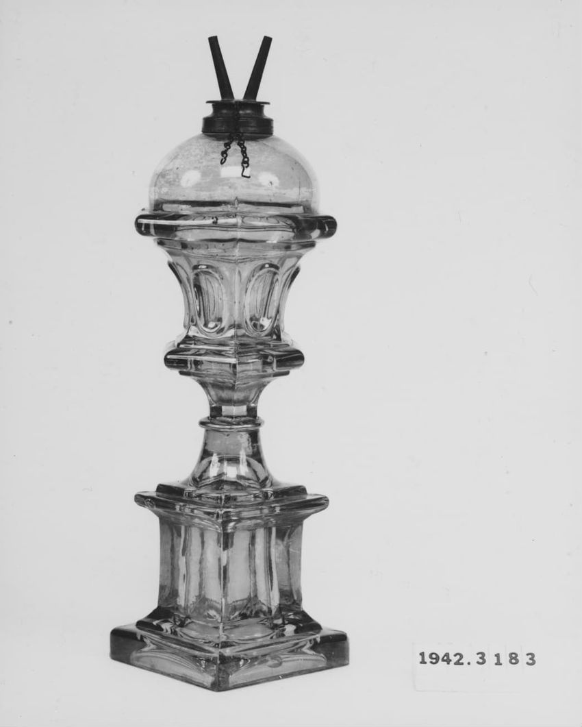 Coffeepot, lighthouse shaped with a four sided facetted spout, a black painted curved wooden handle, and a hinged lid with wooden finial.
