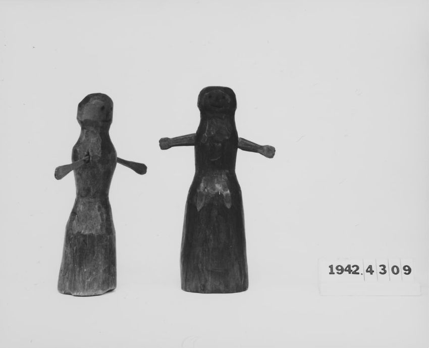 Red; cylindr. fem. body; peg arms perpendic. to body; crude face.
